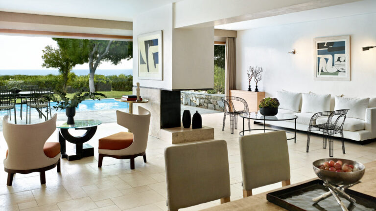 Presidential Villas are luxurious 150-square-meter residences set in 1,000-square-meters of pine forest and landscaped grounds. Located near the summit of the Cape Sounioâs Royal Hill, these exquisite villas offer superb views of the Temple of Poseidon and Greeceâs famous cape. The mesmerizing view will lure you outdoors-and there is an open-air lounge to make sure you enjoy every moment.