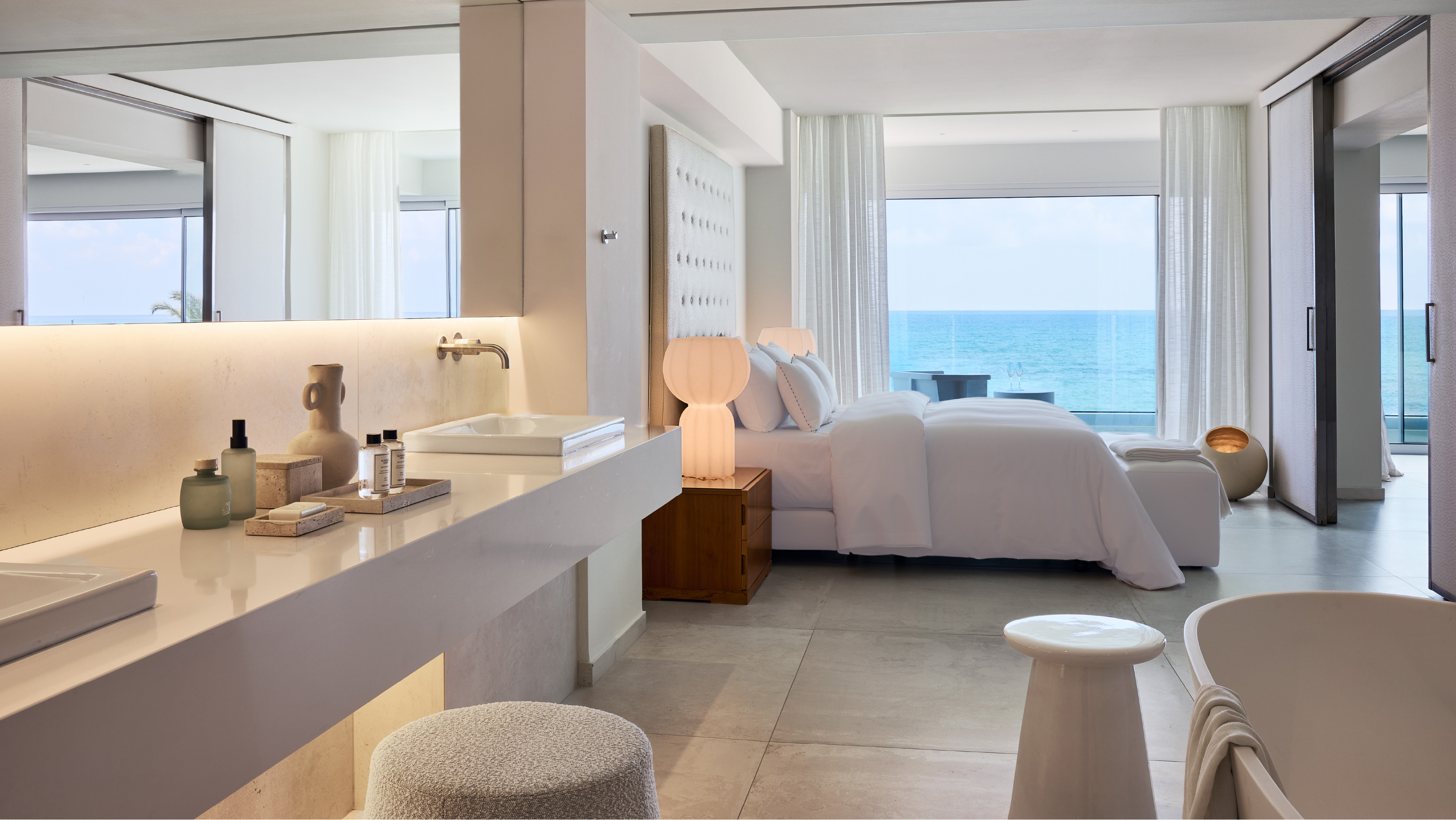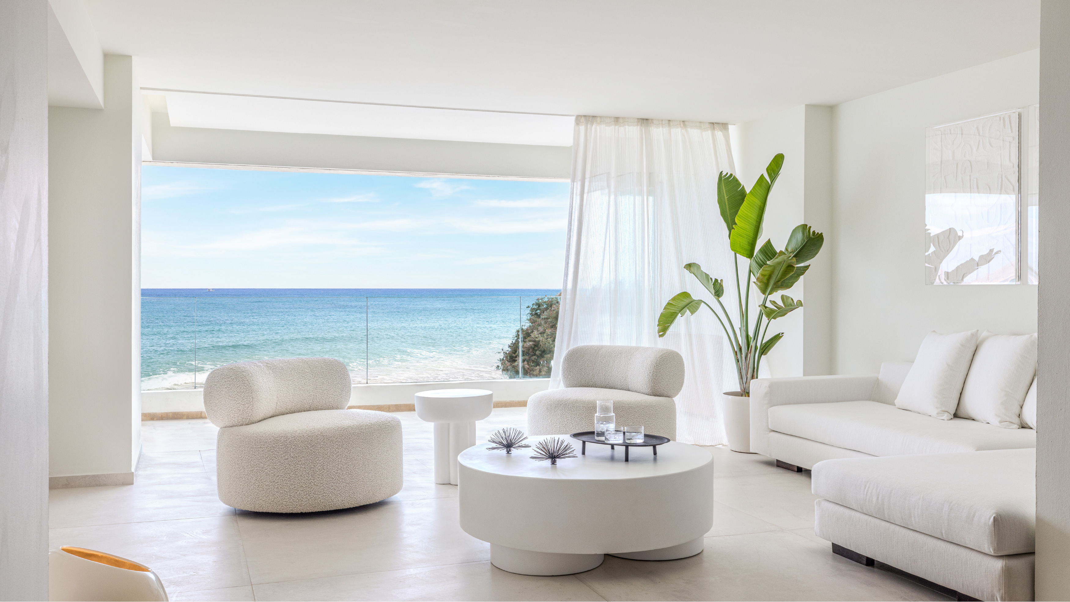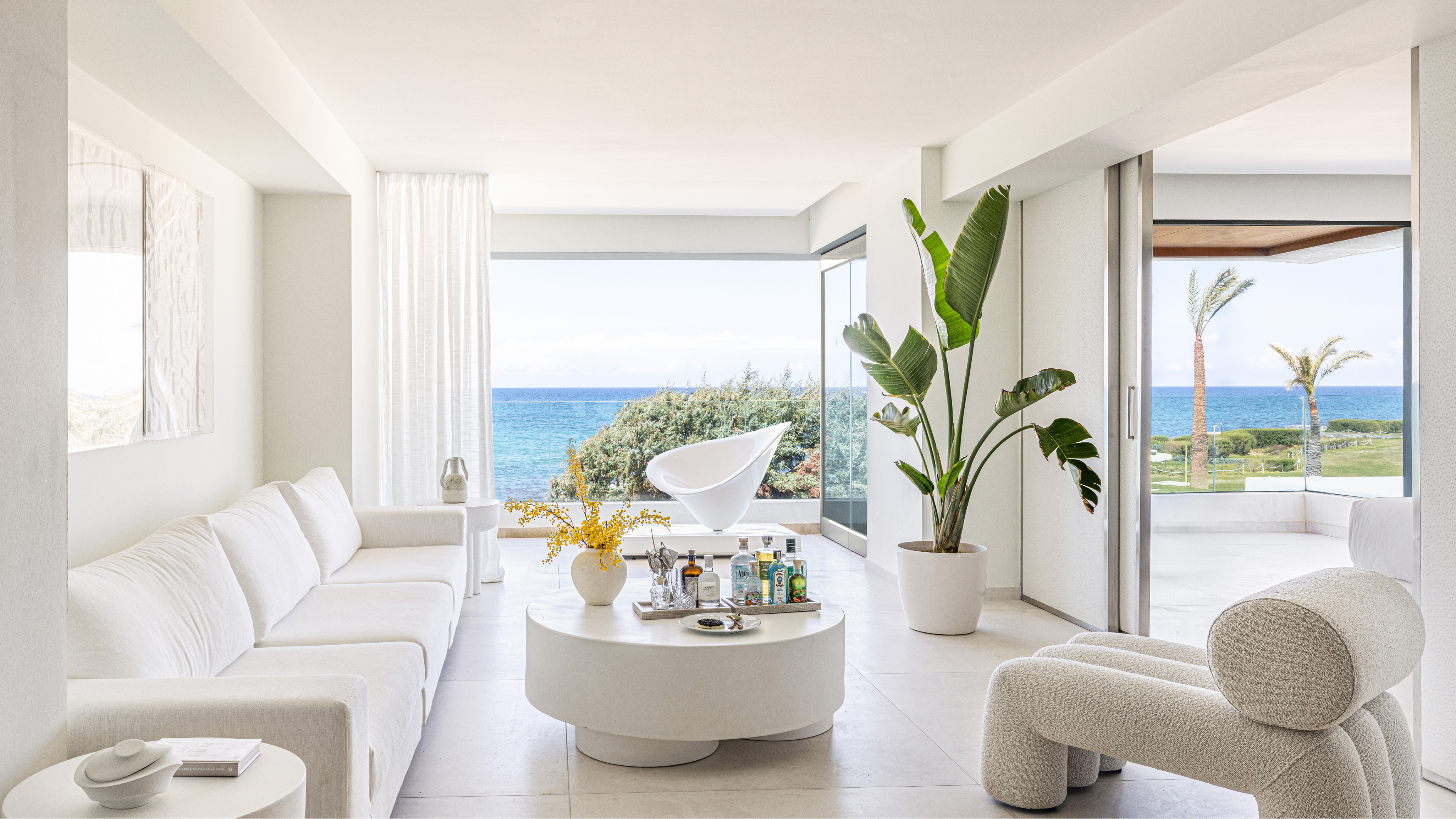 White-colored suites offering magnificent views of the sea. White furnishings, white floors, and a sizable wardrobe with full-length mirrors define the atmosphere of this luxurious suite.