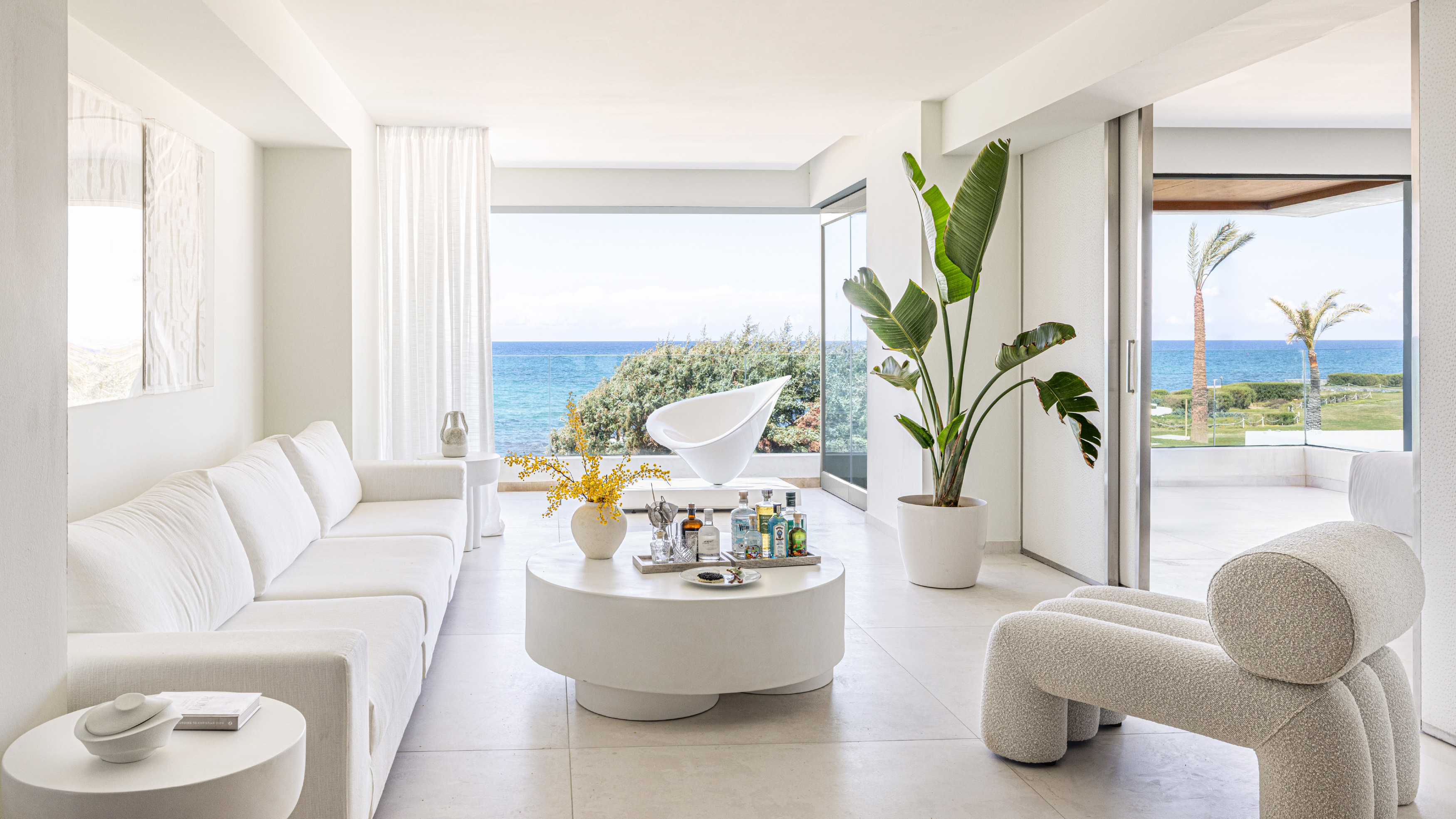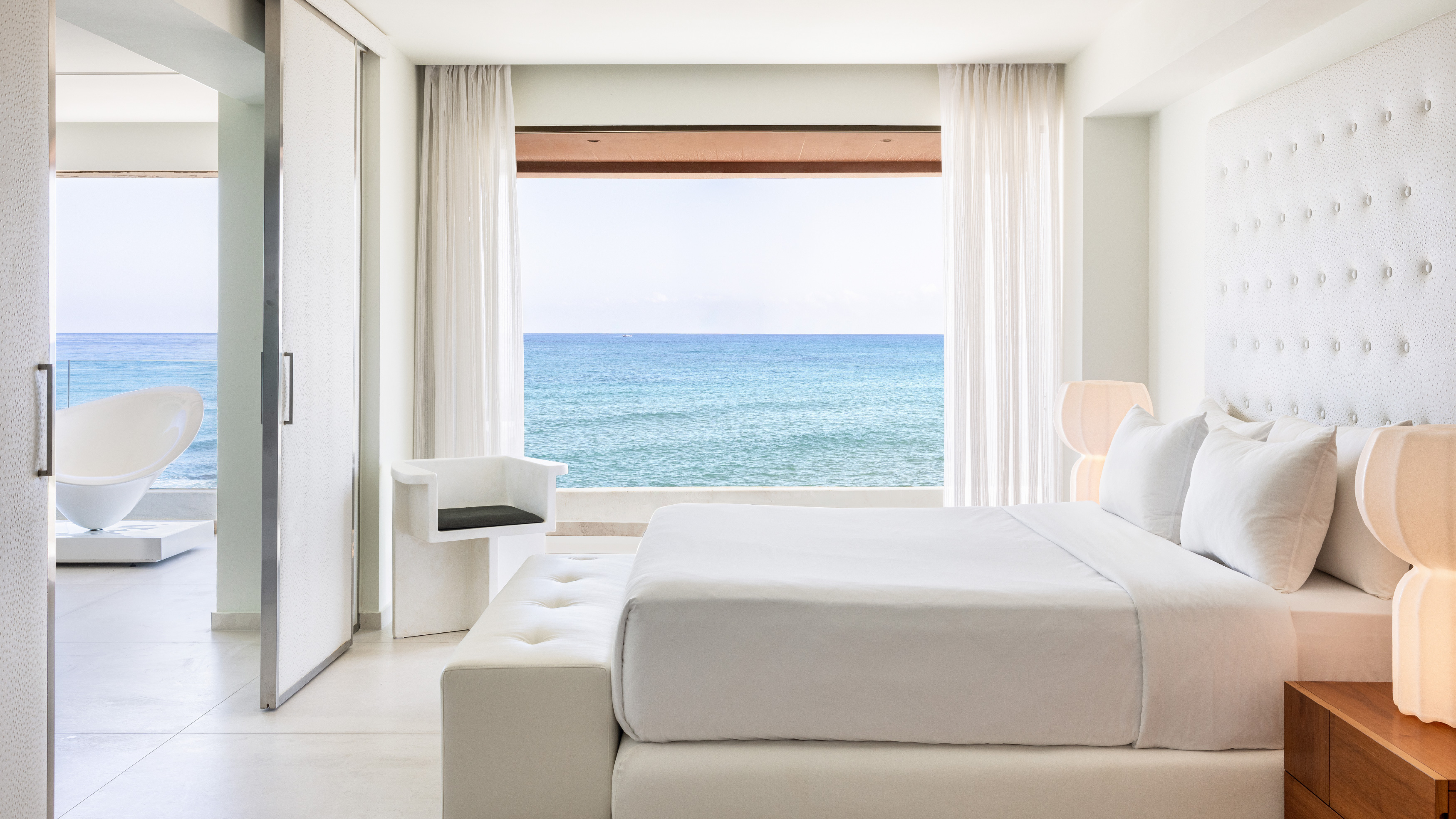 These open plan suites offer a magnificent view to the sea. The white-colored furniture, the white floor and the sizable wardrobe with full-length mirrors impose in the luxury suite.