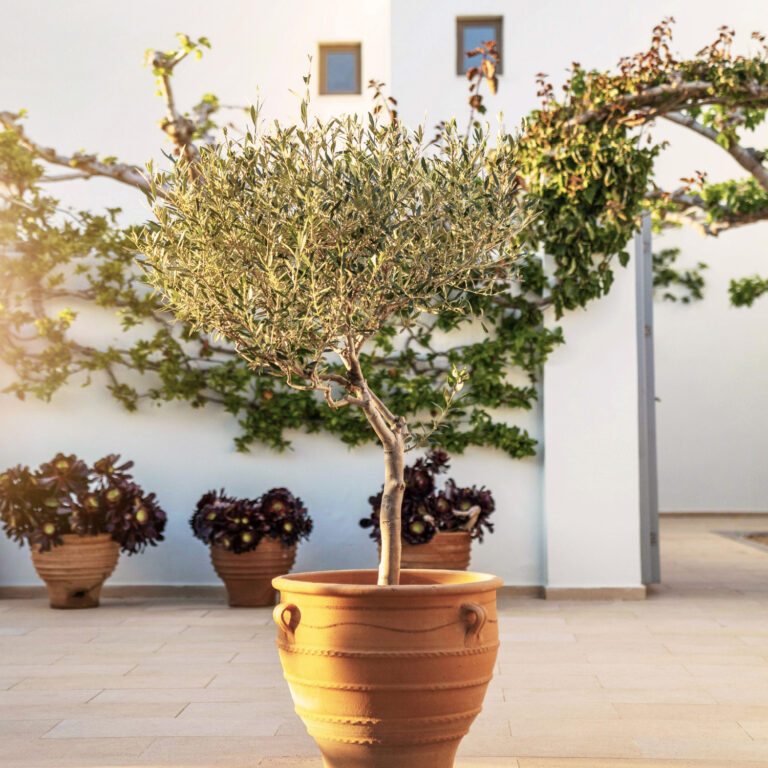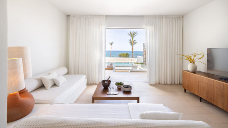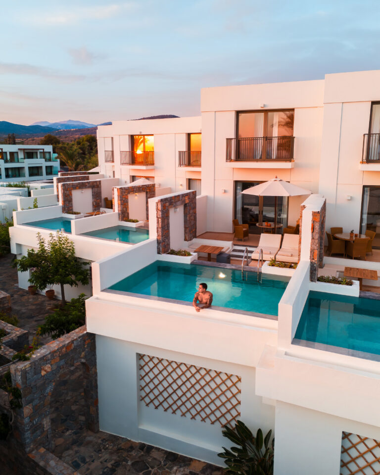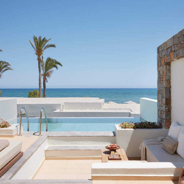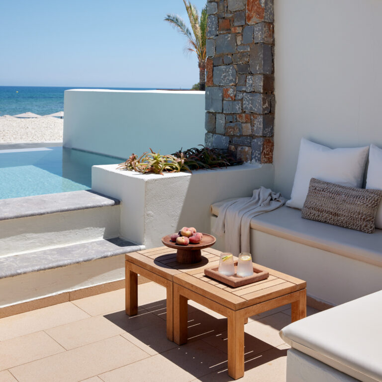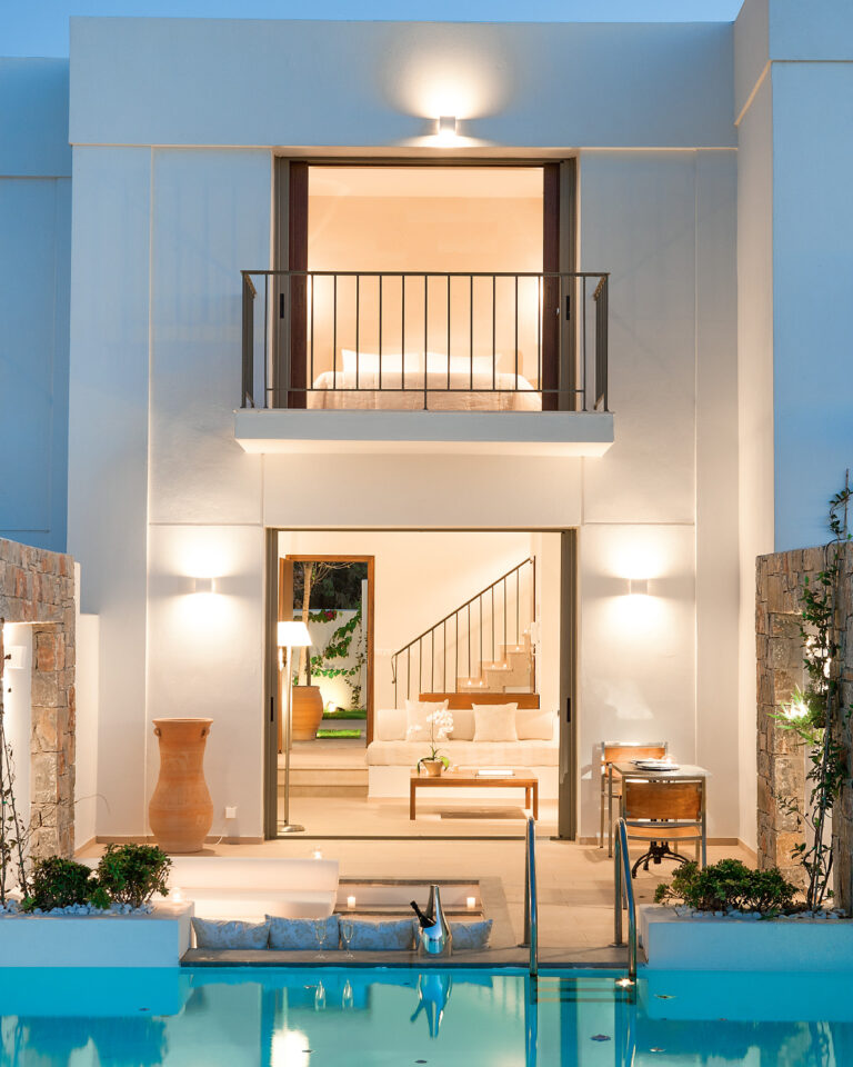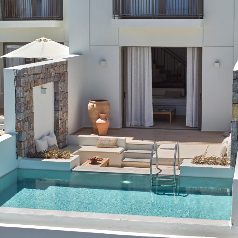 The villa is set in an elegantly landscaped courtyard and a private terrace with a luxurious infinity pool. The yard entrance, and in some villas a small fountain, gives a first impression of the inviting scenery. Perfect for a family or a couple who want the maximum privacy.