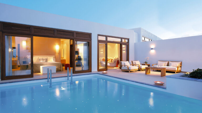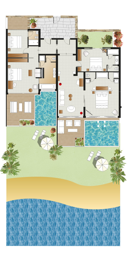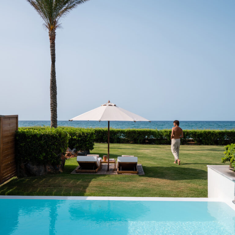 The cool and contemporary design reminiscent of a Mediterranean Beach House makes these villas ideal for a family or couples of friends who want to share their vacation. This unique accommodation offers over 300m² of sleeping and living space with two private swimming pools, extensive gardens on the beachfront and two entrances.
