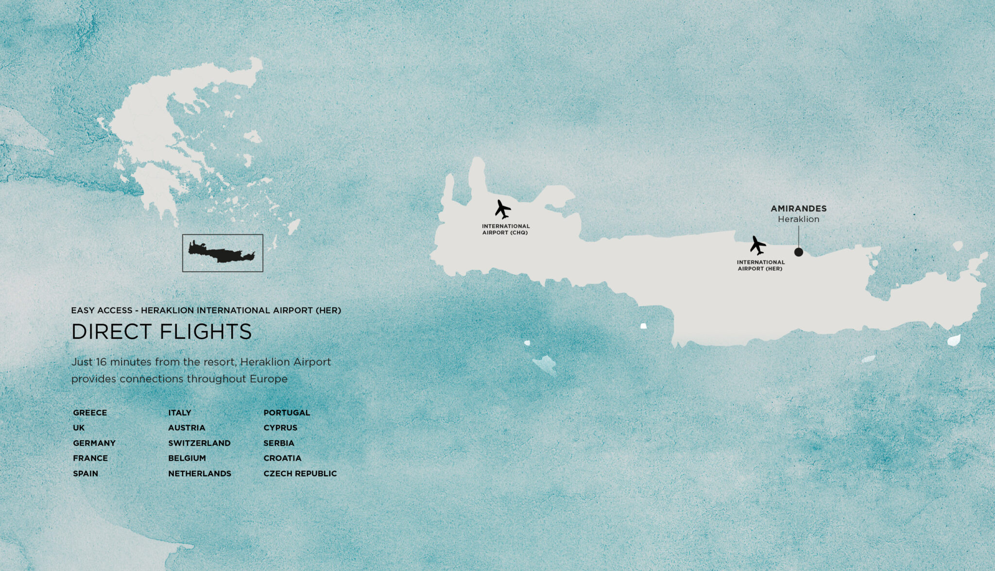 Amirandes lies on the Crete’s stunning north coast 18 km from Heraklion International Airport and 23 km from Heraklion town & port.