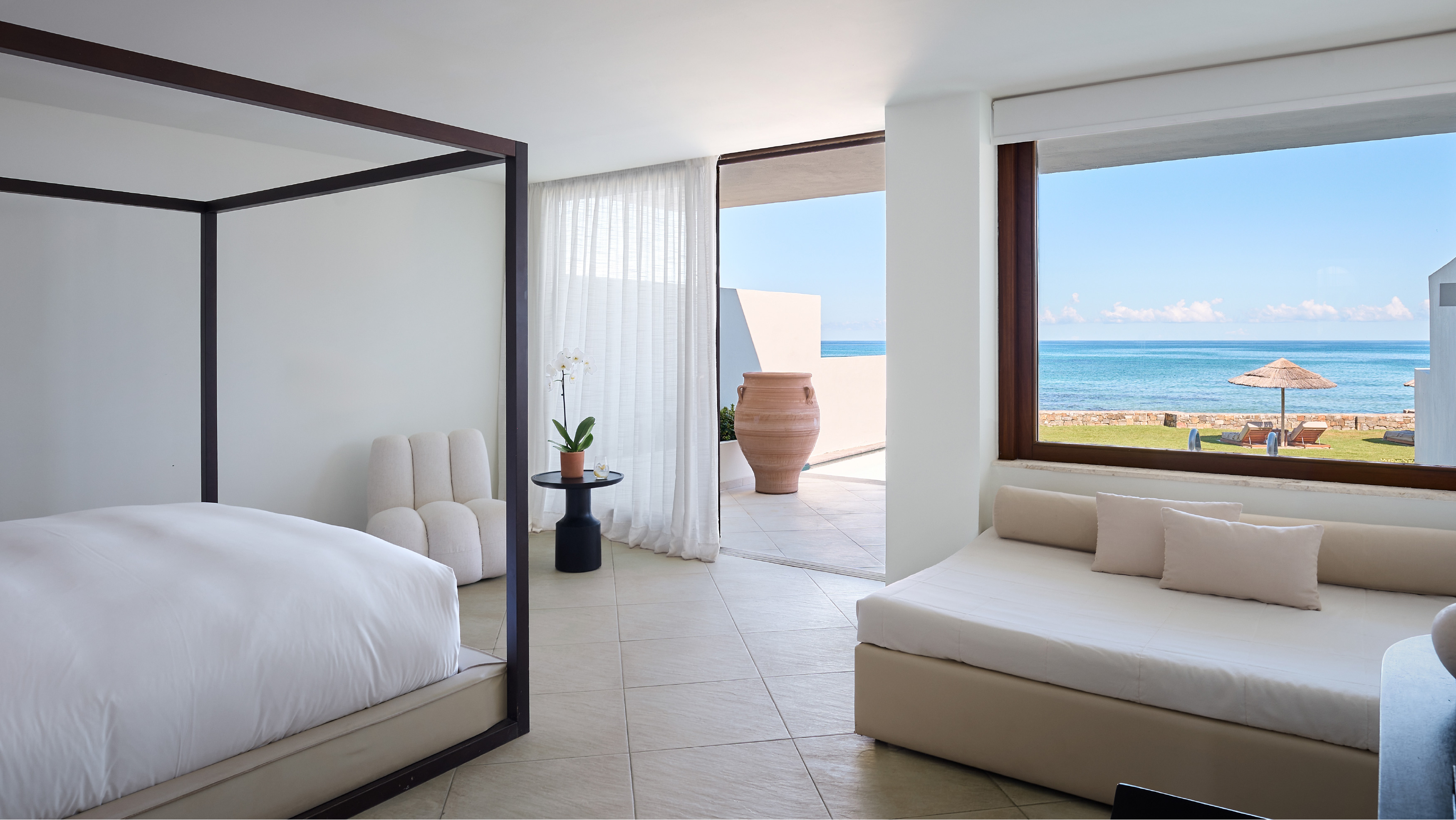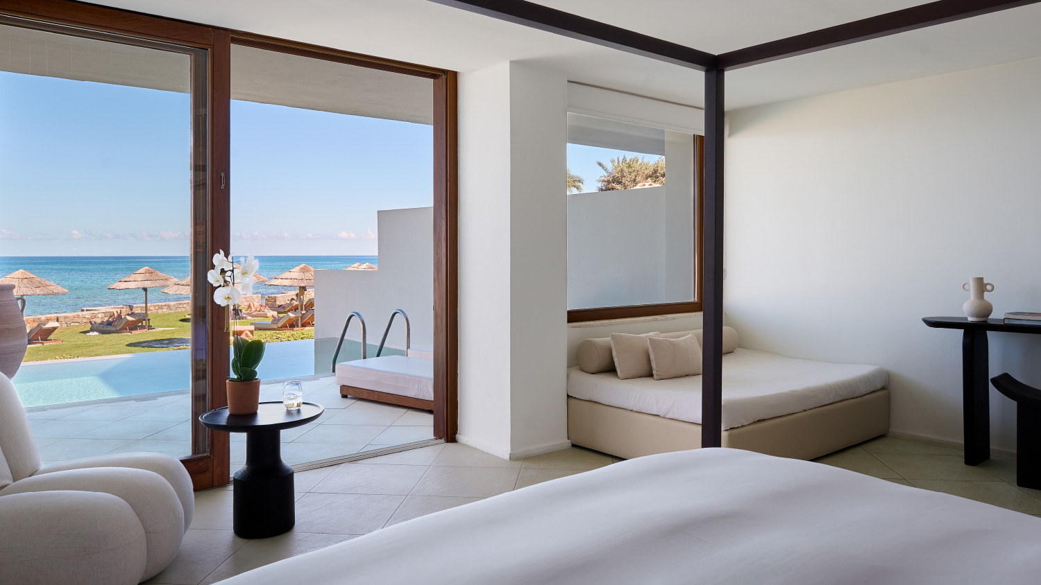 Diese luxuriöse Bugalowsuite direkt am Meer eignet sich mit ihrem stilvollen Schlafzimmer und der privaten Terrasse mit beheiztem Pool mit Meerblick perfekt für die Flitterwochen.