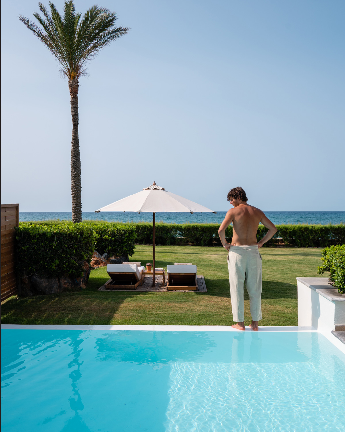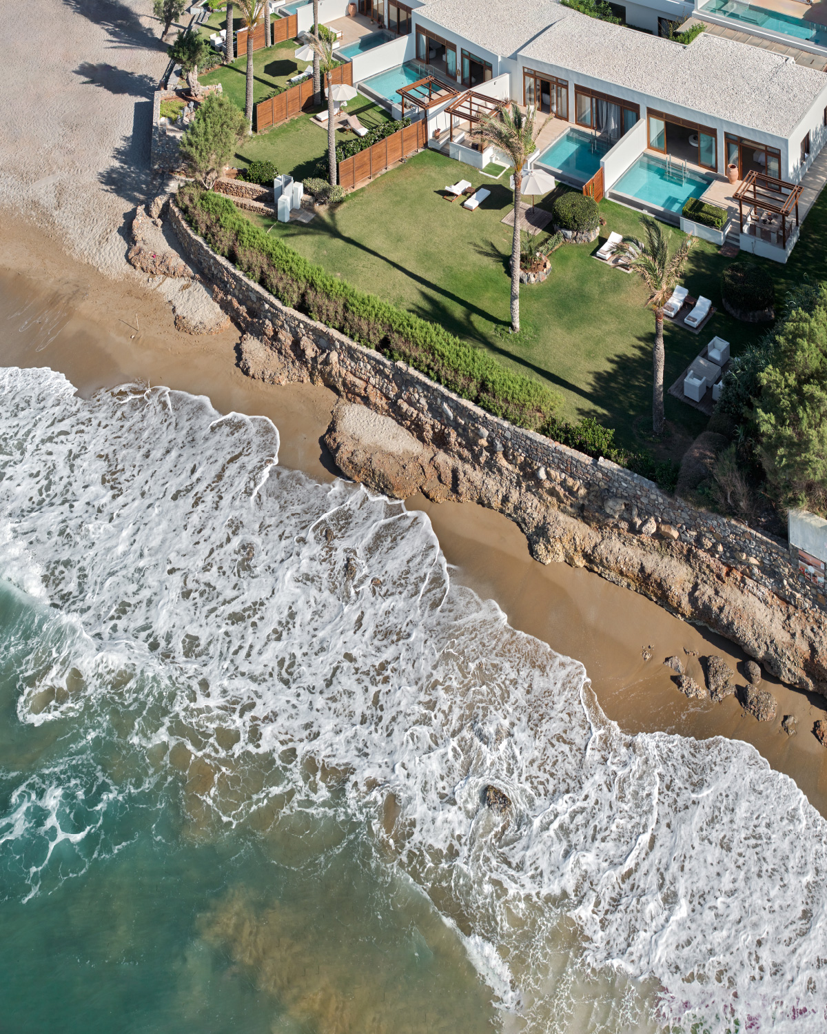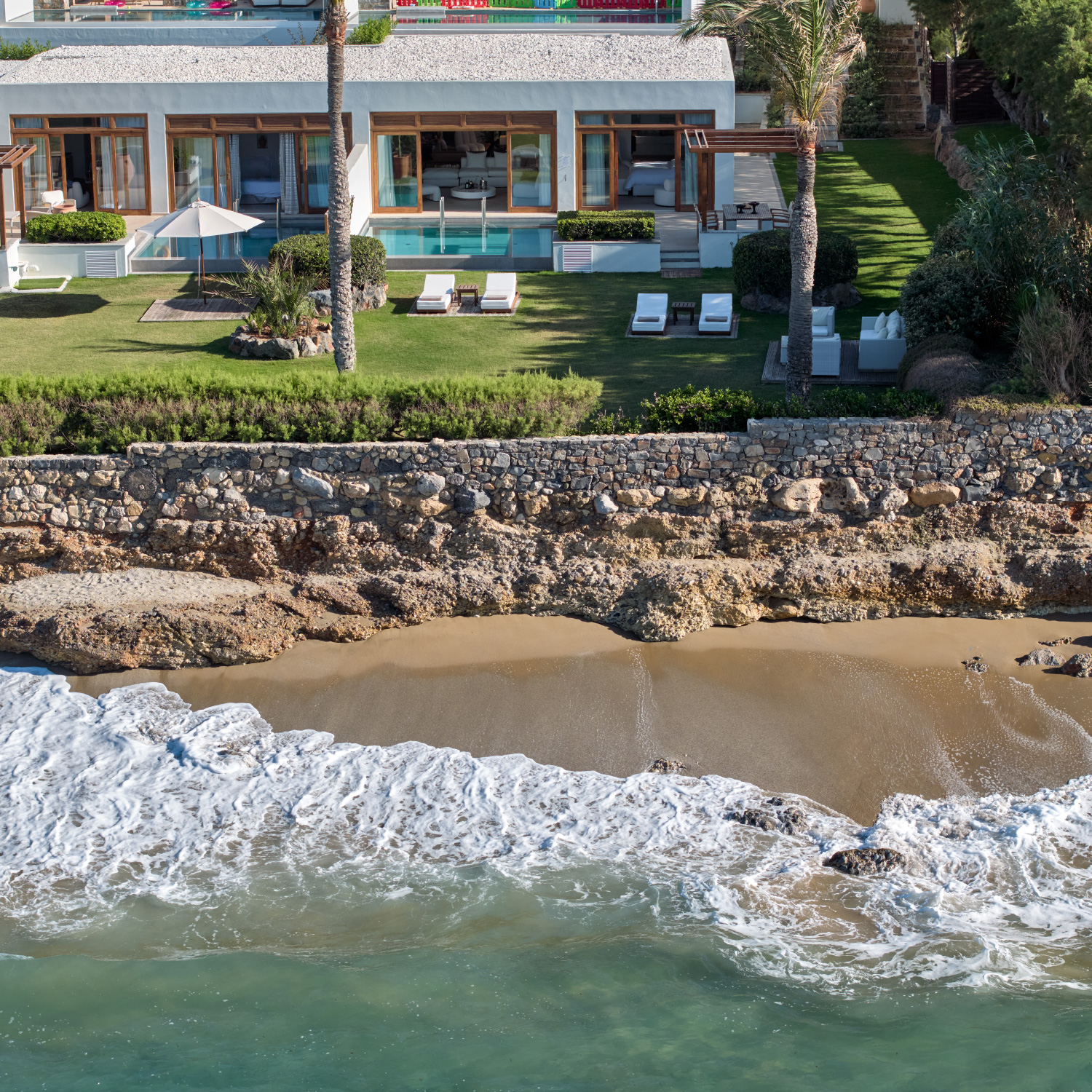 Die ultimative Unterkunft im Grecotel Amirandes! Einzigartige Unterkunft mit ansprechender Architektonik für alle, die diskreten Luxus und Komfort wünschen. Die Unterkunft besteht aus zwei Bereichen, die durch einen mit Steinen gepflasterten Privatweg getrennt sind, und befindet sich in der ersten Reihe des Dorfes direkt am Strand.