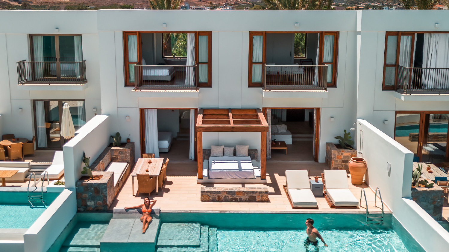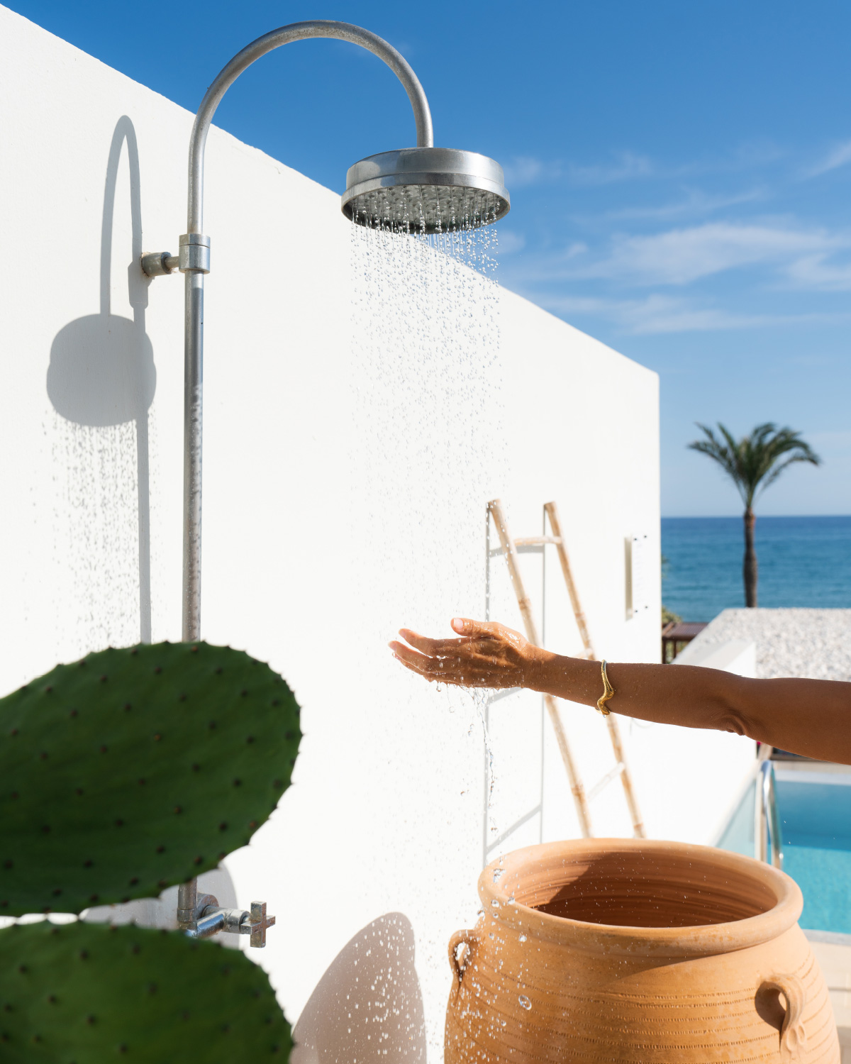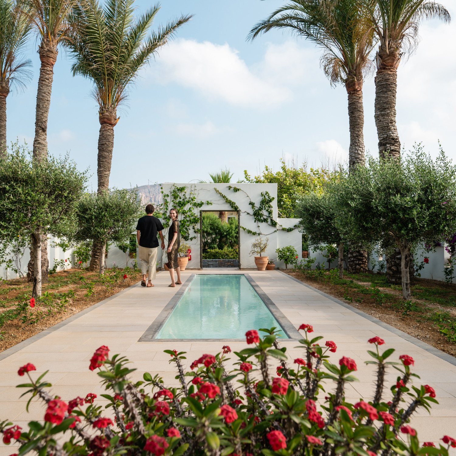 Mit ihrem kühlen und modernen Design, das an ein mediterranes Strandhaus erinnert, eignen sich diese Villen ideal für eine Familie oder befreundete Paare, die ihren Urlaub gemeinsam verbringen möchten. Der Hof mit Privatparkplatz und kleinem Teich vermittelt einen ersten Eindruck von der einladenden Kulisse.