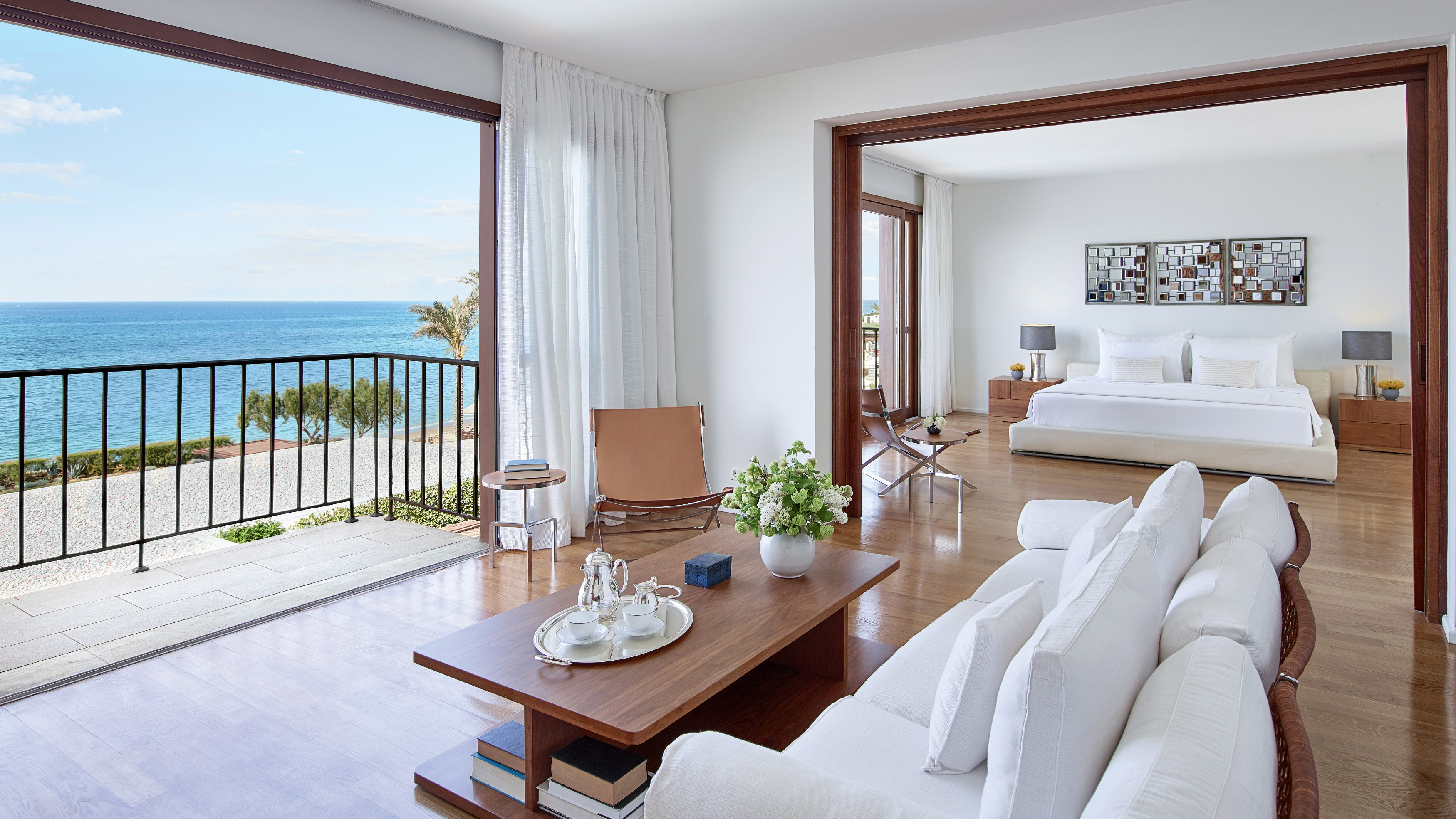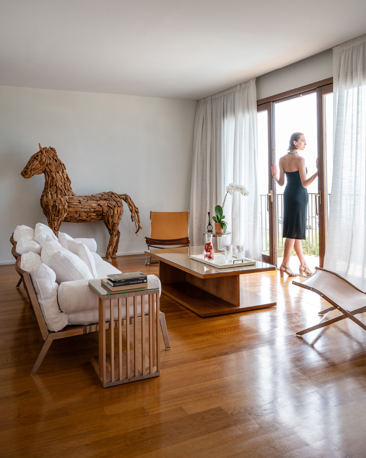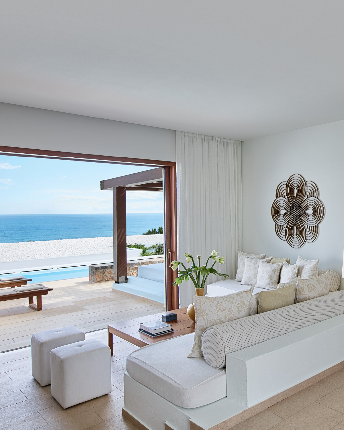 Mit ihrem kühlen und modernen Design, das an ein mediterranes Strandhaus erinnert, eignen sich diese Villen ideal für eine Familie oder befreundete Paare, die ihren Urlaub gemeinsam verbringen möchten. Der Hof mit Privatparkplatz und kleinem Teich vermittelt einen ersten Eindruck von der einladenden Kulisse.