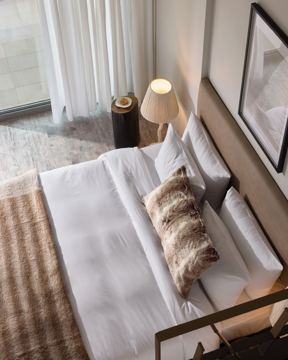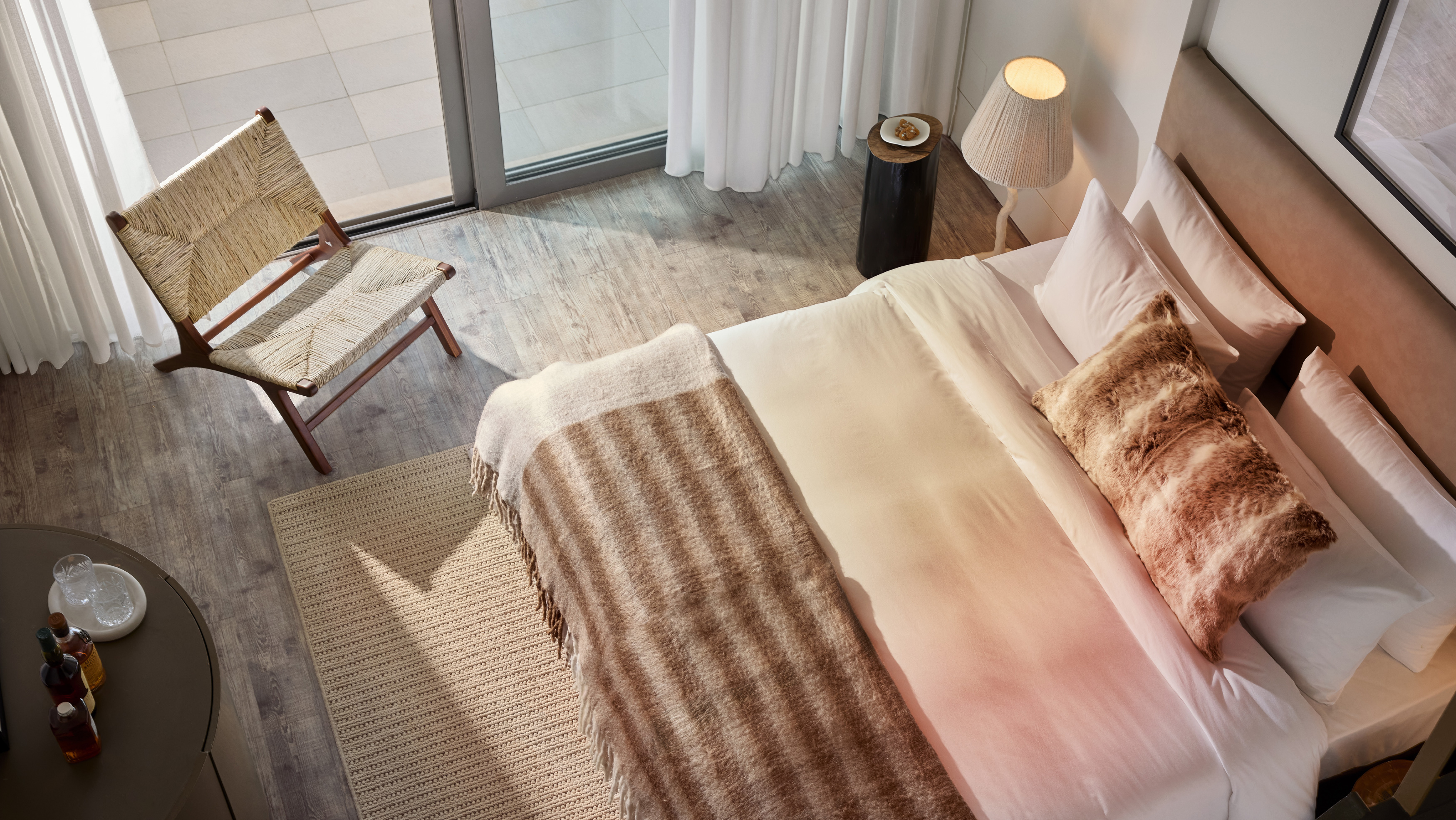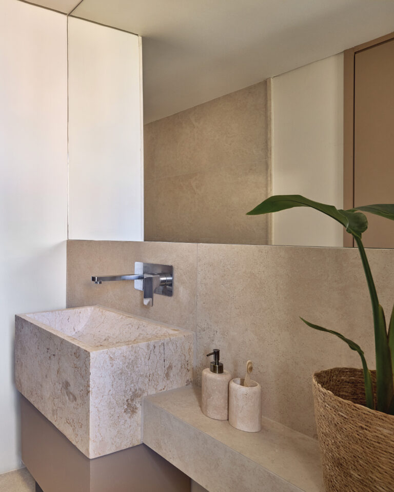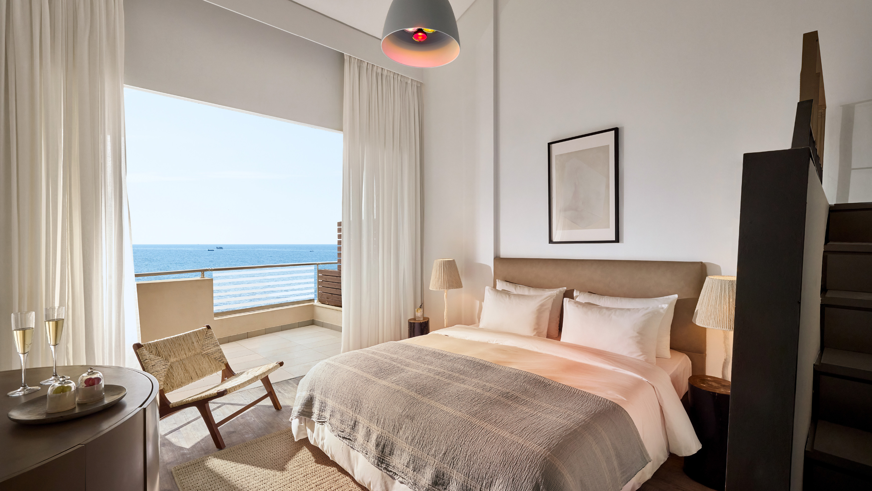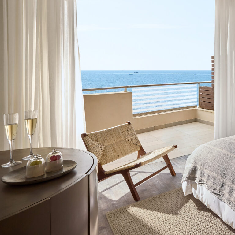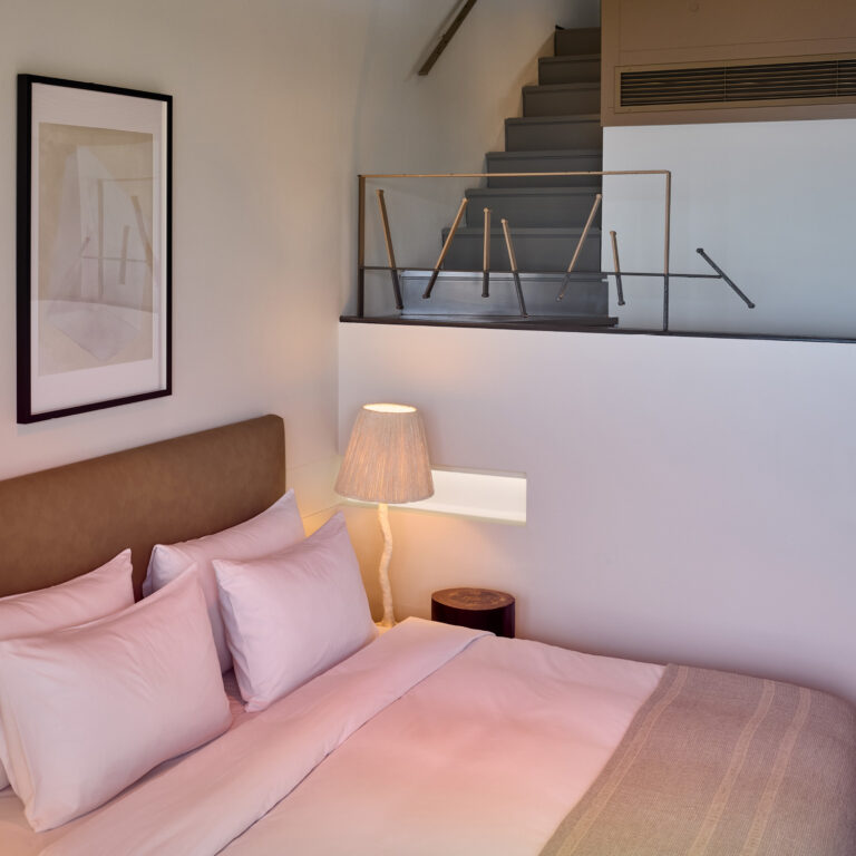 Spacious and layered with natural textures, this family suite offers a warm, inviting setting designed for comfort. A wooden staircase separates the two levels, providing privacy for all, while guests can unwind with peaceful coastal views or enjoy quiet moments overlooking the resort’s lush garden.