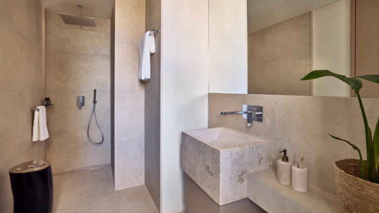 With soft lighting and open space across two levels, this suite gives a feeling of quiet elegance. The upper bedroom overlooks the sea, while the living area below invites connection. Enjoy a quiet night of reading on the plush couch, or a relaxed conversation over drinks.