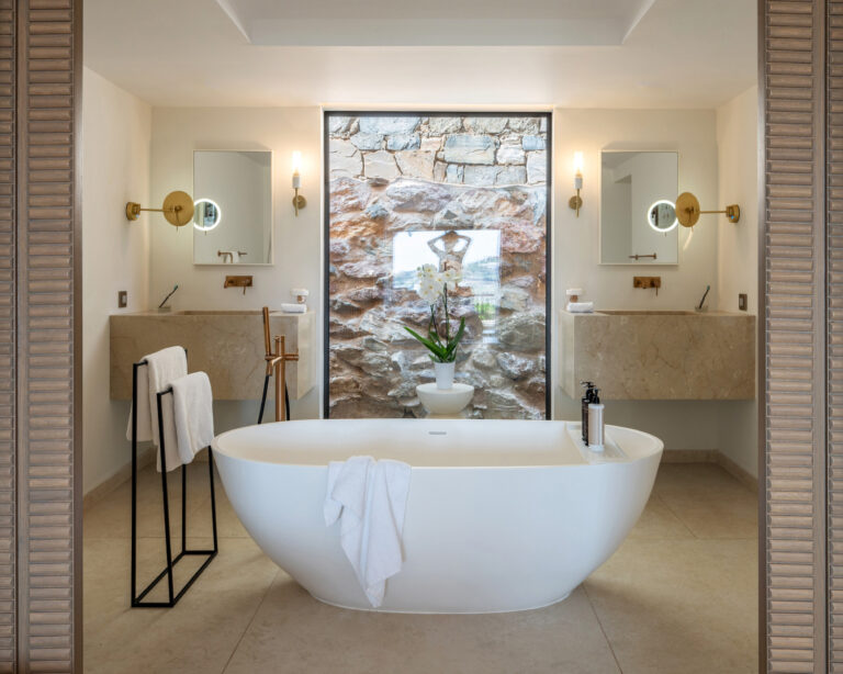 Guests are greeted on arrival by handcrafted pitharia — large ceramic vessels inspired by ancient Greek artisan traditions. The redesigned landscape is a verdant sanctuary of pine forests, palm groves, and olive trees, enriched by year-round blooms of native flora. Vineyards and organic gardens yield fresh fruits and vegetables, while timeworn stones and ancient rocks from the archaeological site, form an enchanting tapestry of history and nature.