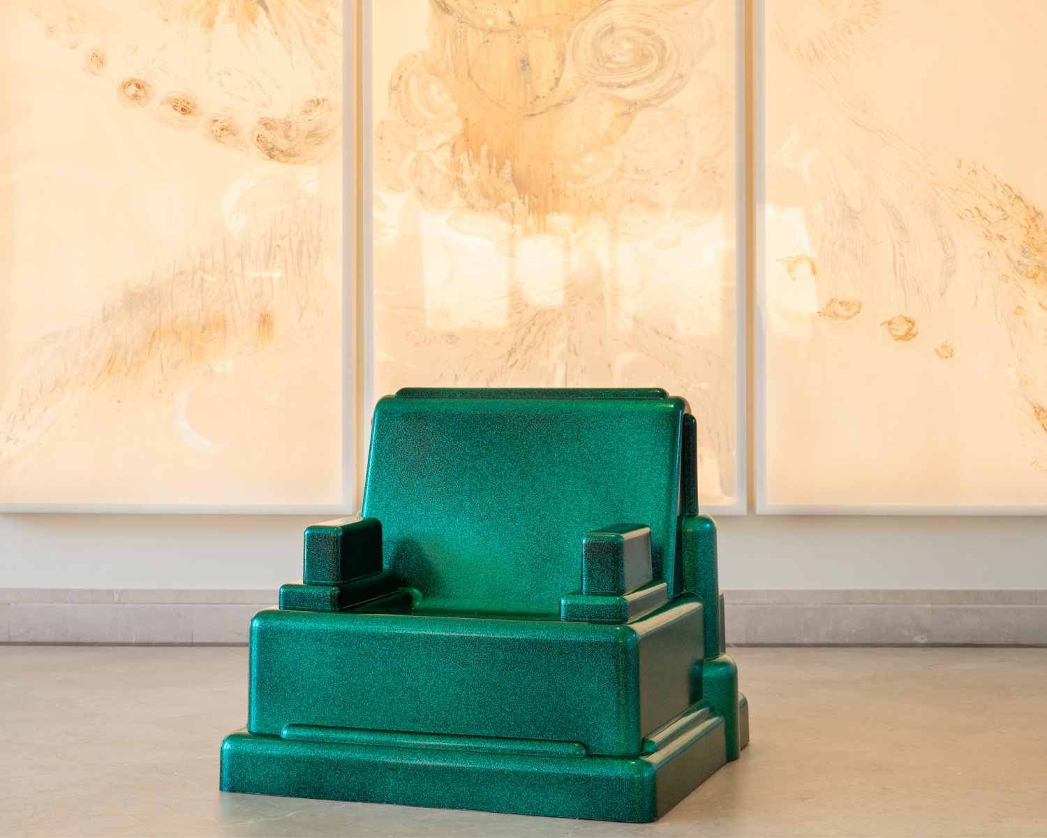 The striking art-filled lobby is surrounded by a luminous site-specific installation by contemporary Greek artist Nefeli Massia, depicting the Golden Triangle’s ancient landmarks: the Temple of Poseidon, the Parthenon, and the Temple of Athena Aphaia. The reception features Takis’s Signals, his iconic kinetic sculptures, along with rare design pieces, including T.H. Robsjohn-Gibbings’s 1940s Greek-inspired chairs, handcrafted by Saridis of Athens — reflecting the resort’s commitment to cultural authenticity.