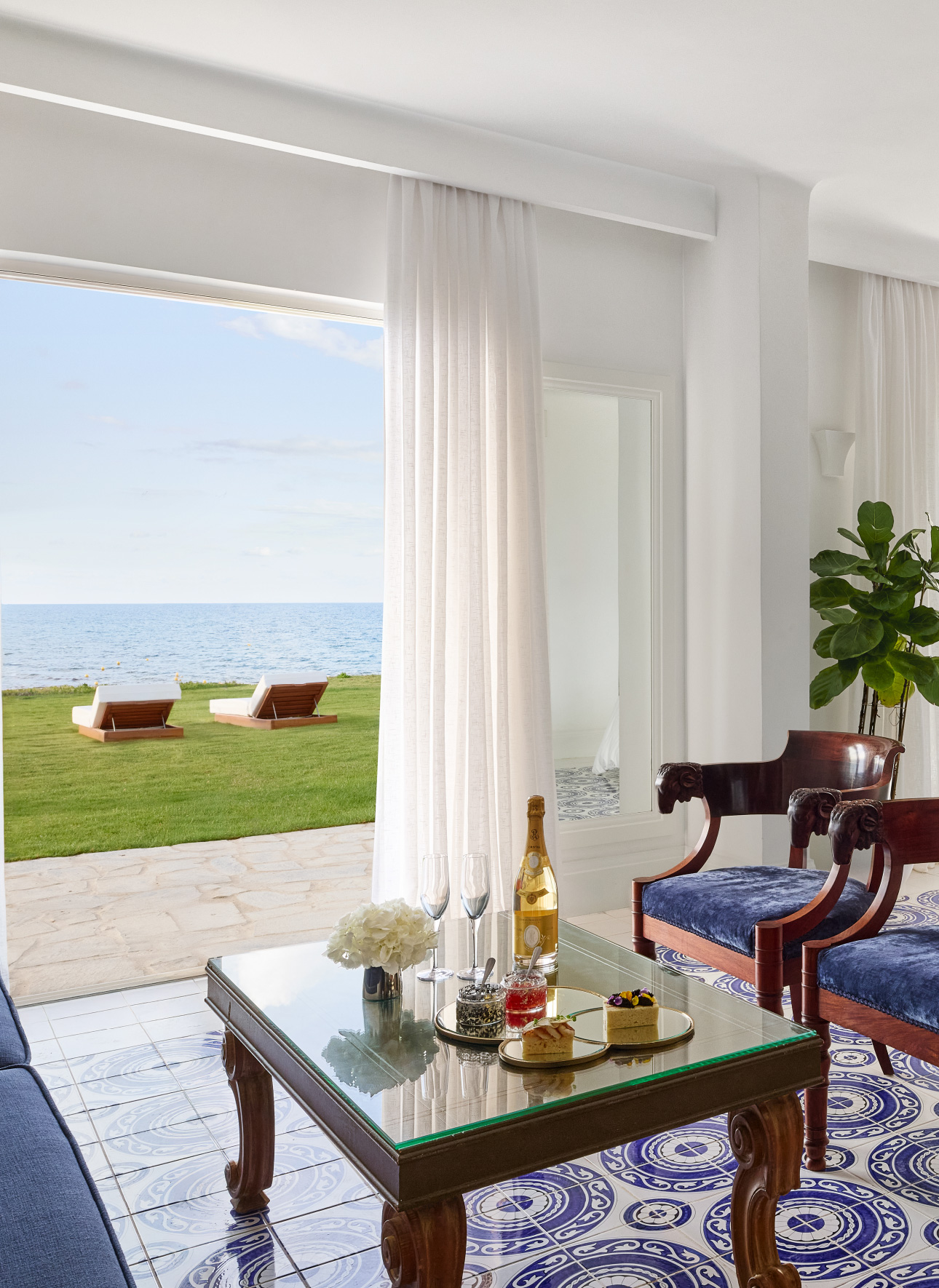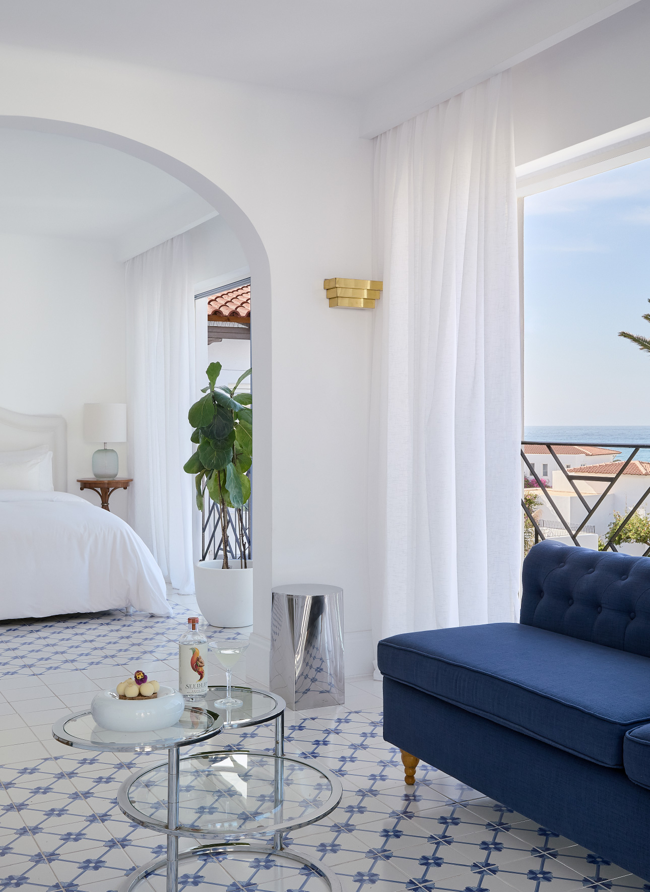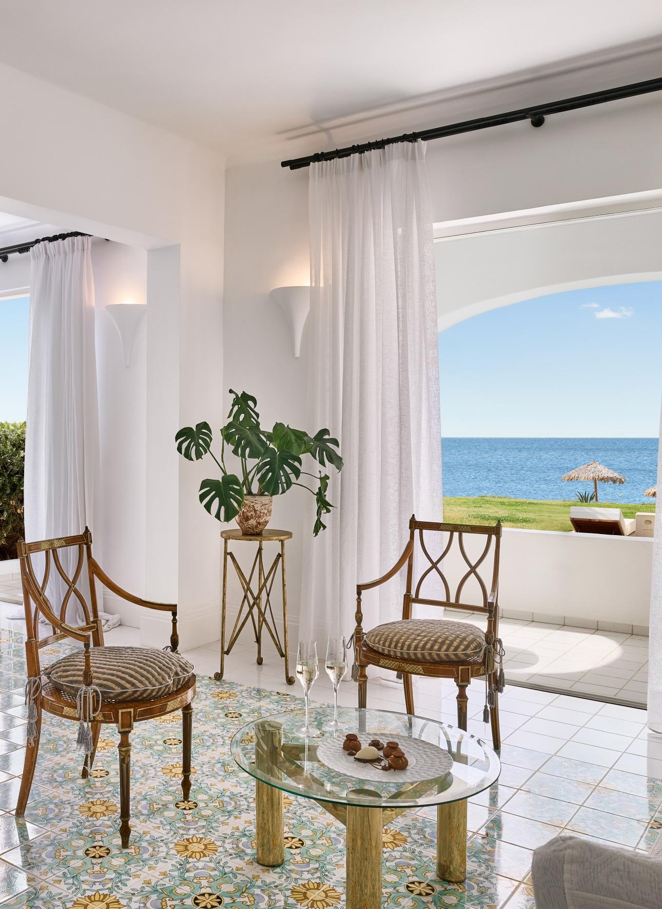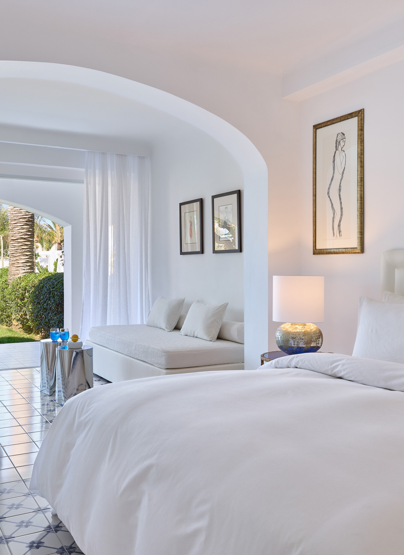 Main house suites, bungalow suites, maisonettes, villas: each one is unique, encapsulating a welcoming and comfortable feeling. All with exhilarating views, an aura of privacy and exquisite flair. Thoughtfully designed with an intrinsic play of colours, textures and patterns. Spaces furinished gracefully with antique and contemporary furniture, handmade floor tiles, exceptional designer fabrics, enticing spa-inspired bathrooms, capturing the allure of a perfect holiday.