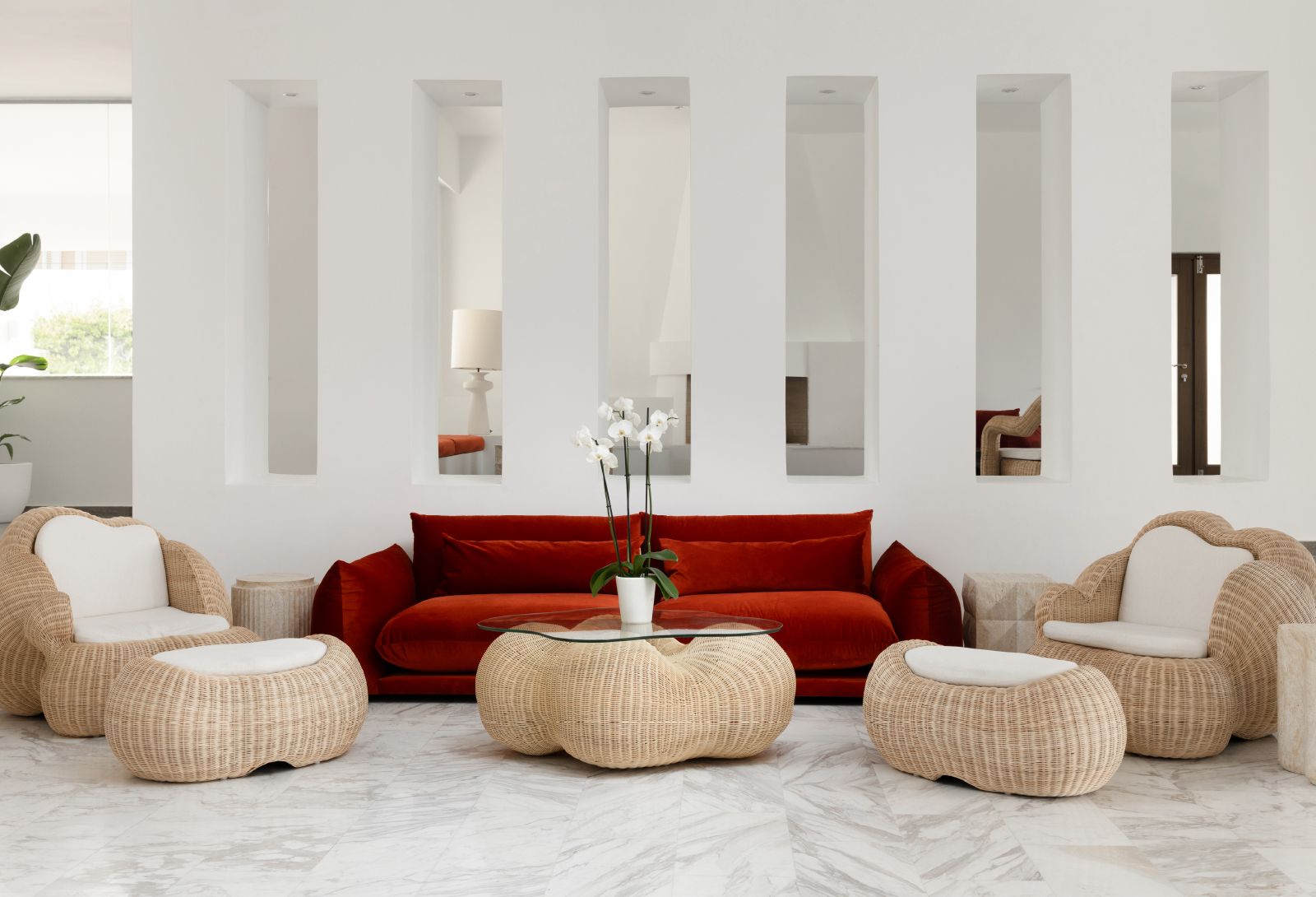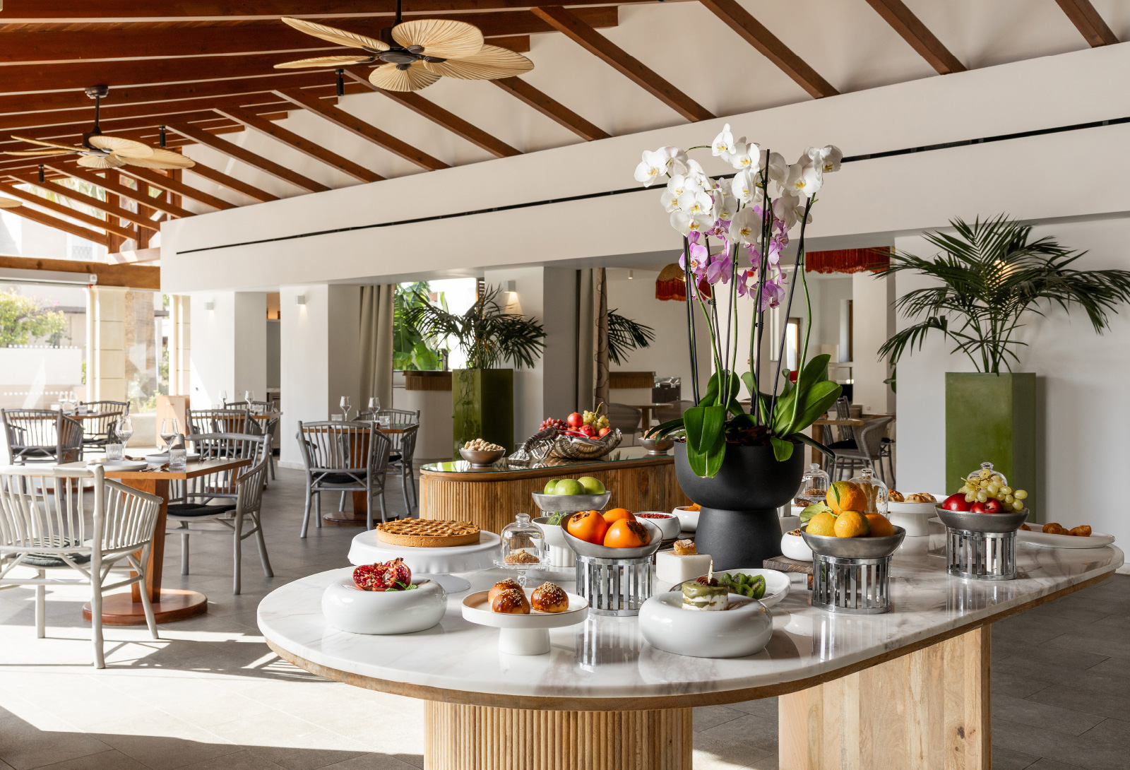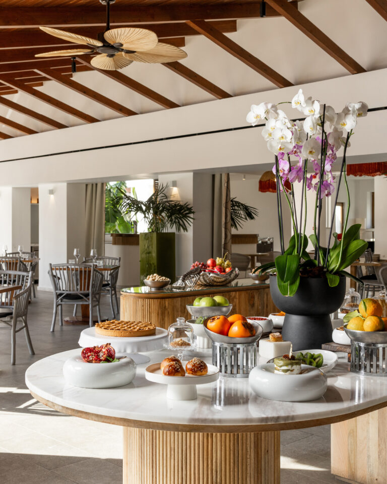 Dining at Casa Adele is a relaxed celebration of Mediterranean flavours. Mornings begin with a generous breakfast buffet featuring local produce and freshly baked goods, served in garden and poolside settings. Italian and Greek cuisine takes centre stage at the all-day al fresco restaurant, from classic dishes and fresh pizzas from the wood-burning oven to light snacks and street-food favourites, while signature cocktails and refreshing drinks are served at the Bianca Bar and the Lobby Bar.