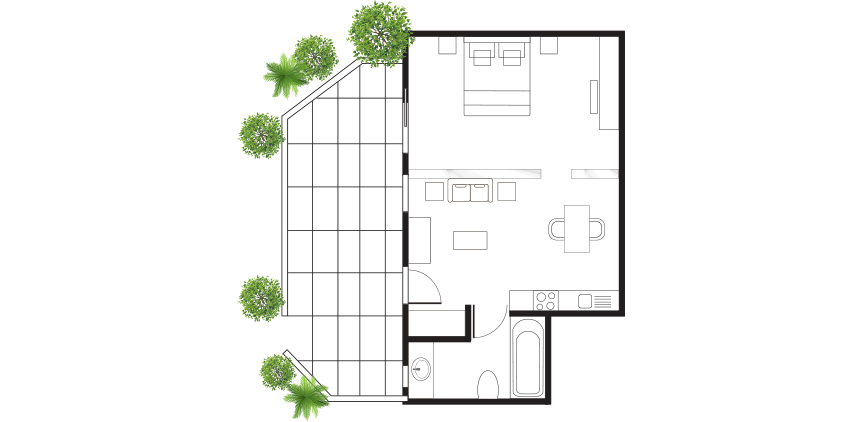 Beautifully light-filled and village-styled, these Studios with garden views have a homey feeling.