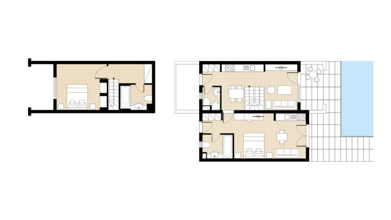 Maisonettes with garden views, village-styled décor and two fully furnished levels of comfort, featuring two master bedrooms and all amenities for a family of six.