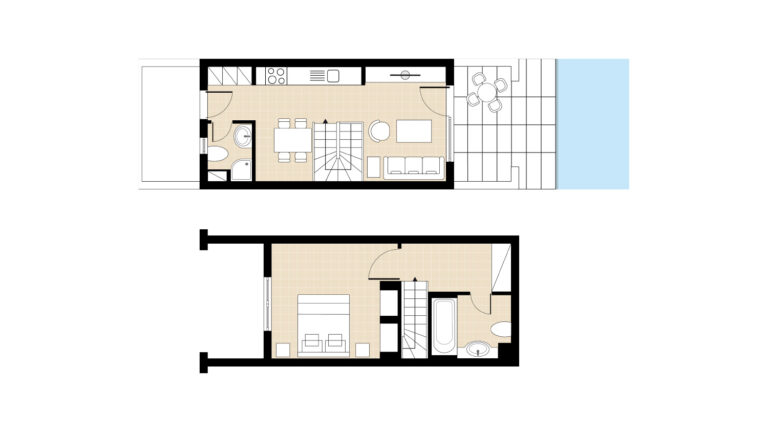 Maisonettes with garden views, village-styled décor and two fully furnished levels of comfort, featuring a master bedroom suite and all amenities for a family of four.