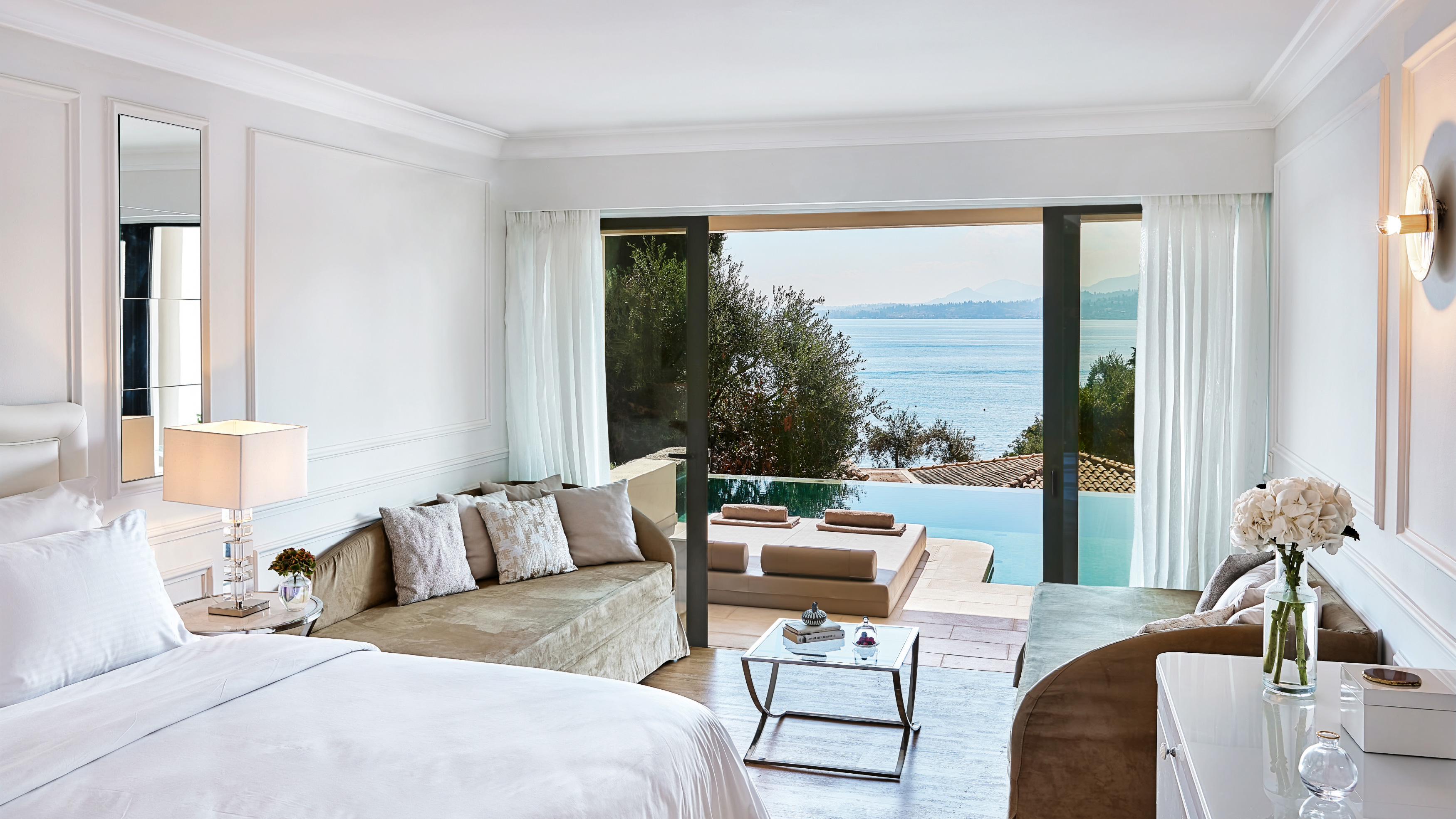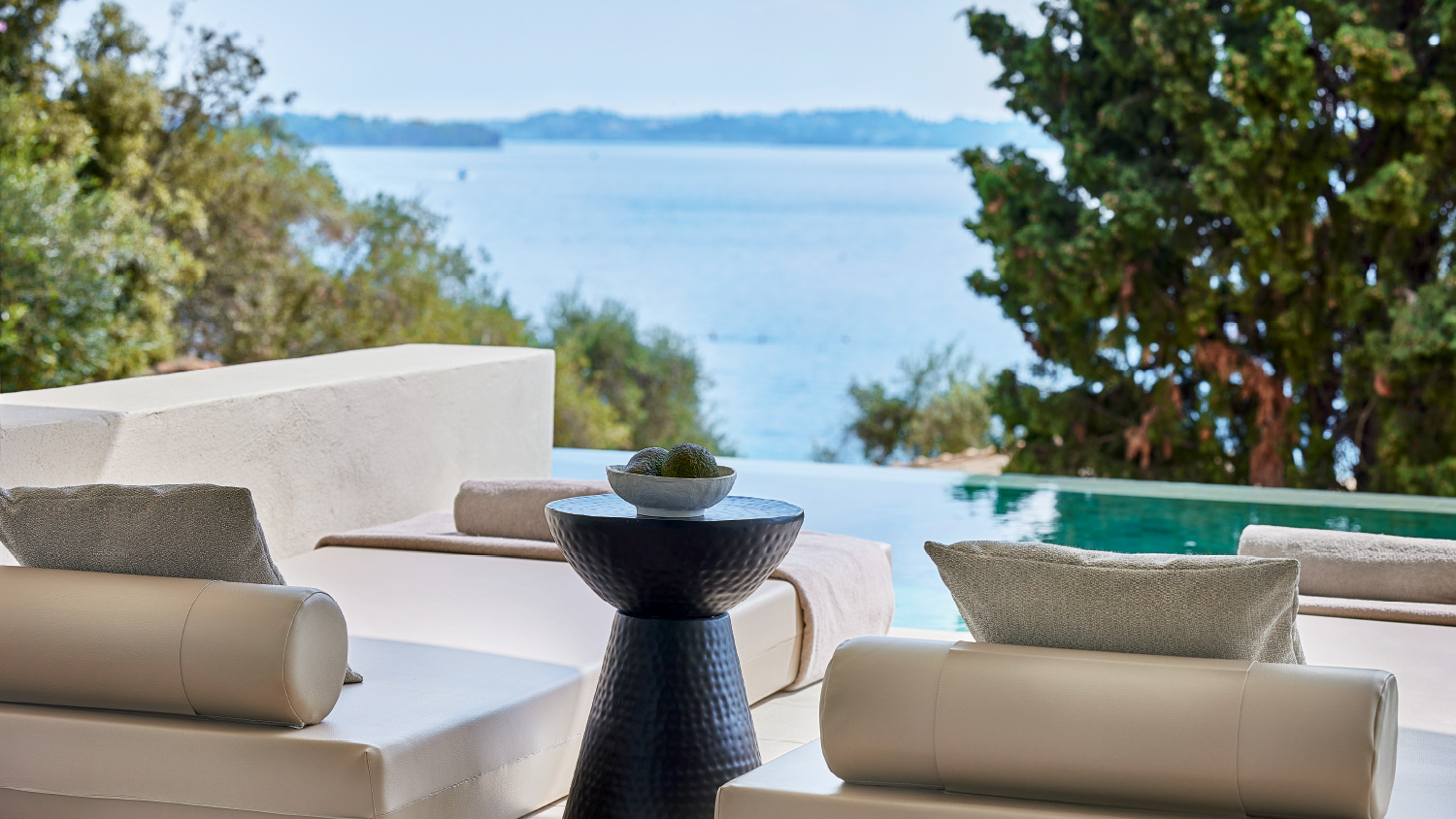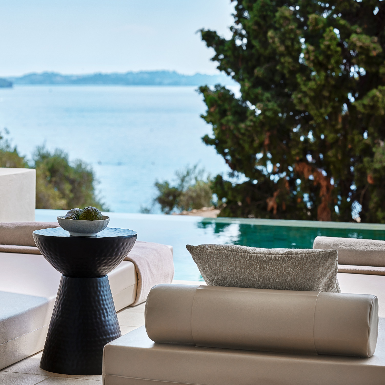 Newly transformed Swim Up Family Bungalows Open Plan feature prime location and a recently added sharing pool. Nestled alongside the fragrant blooming gardens facing the Ionian Sea, these refreshed and well-appointed contemporary accommodations are designed with complete comfort in mind.