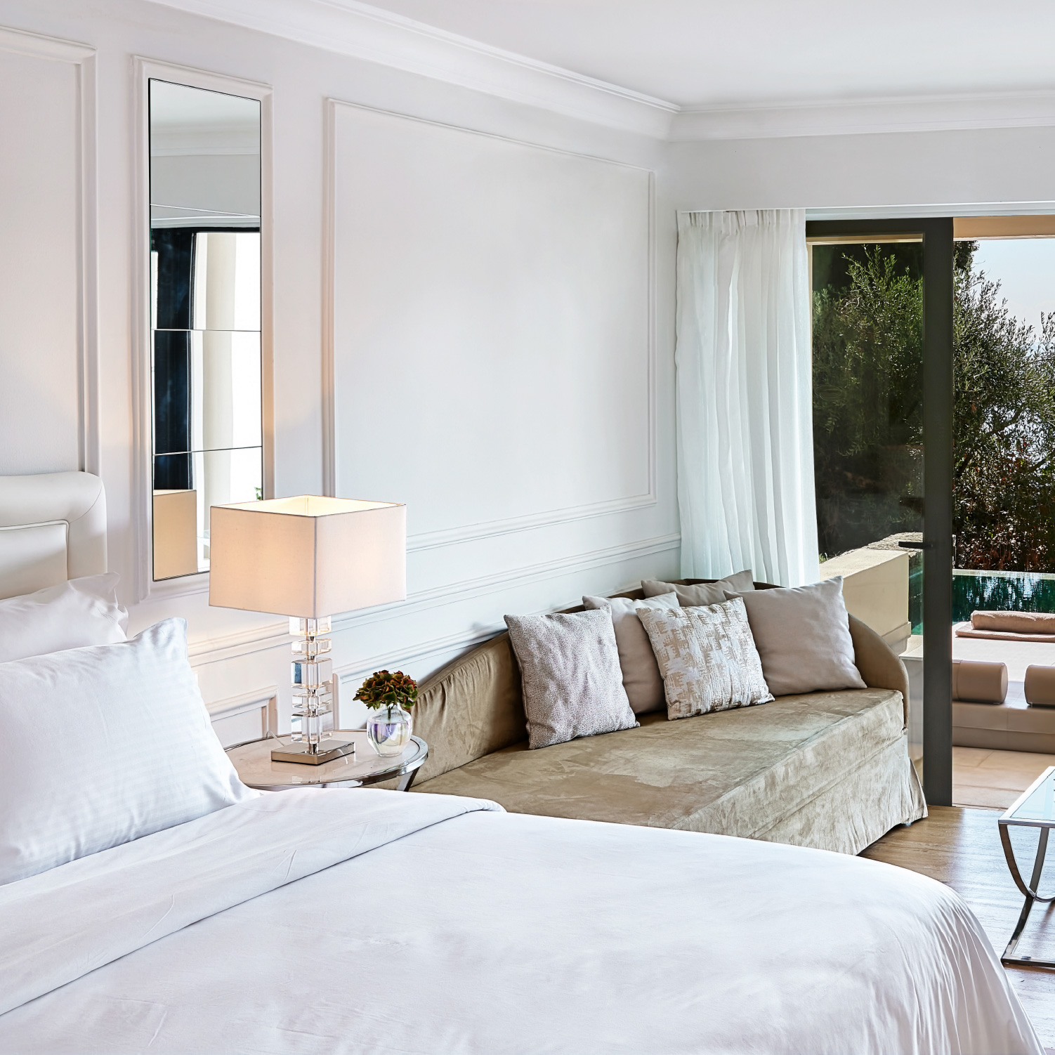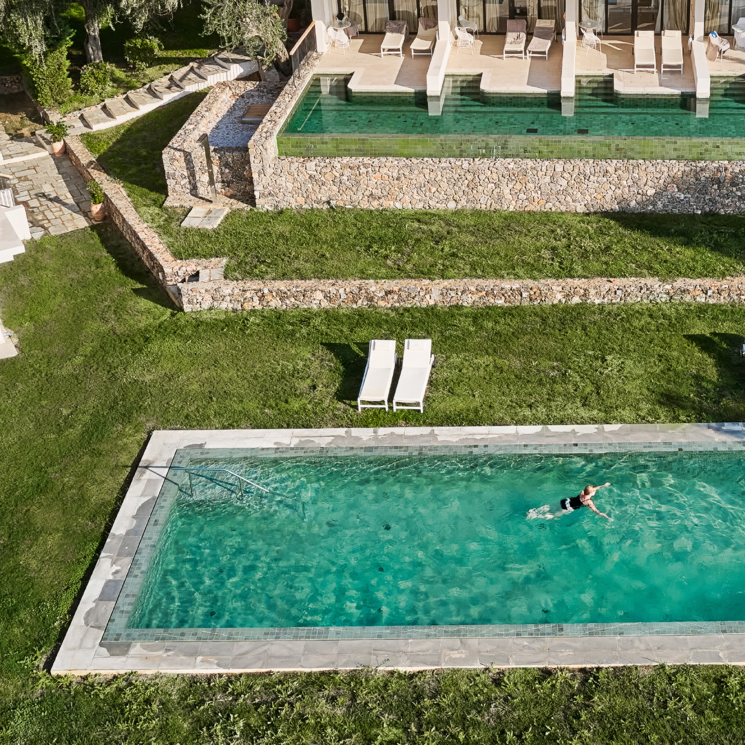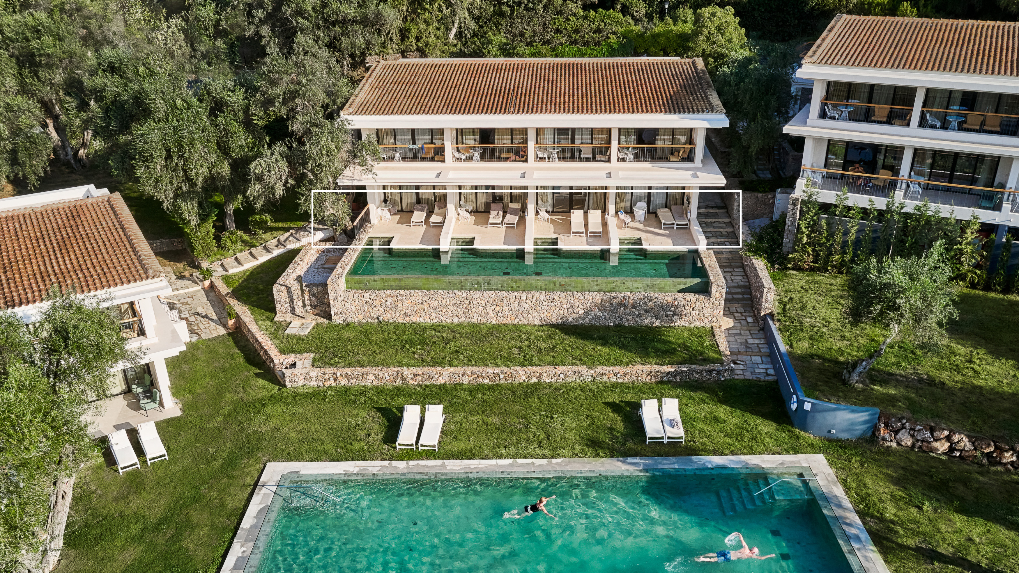 Newly transformed Swim Up Family Bungalows Open Plan feature prime location and a recently added sharing pool. Nestled alongside the fragrant blooming gardens facing the Ionian Sea, these refreshed and well-appointed contemporary accommodations are designed with complete comfort in mind.