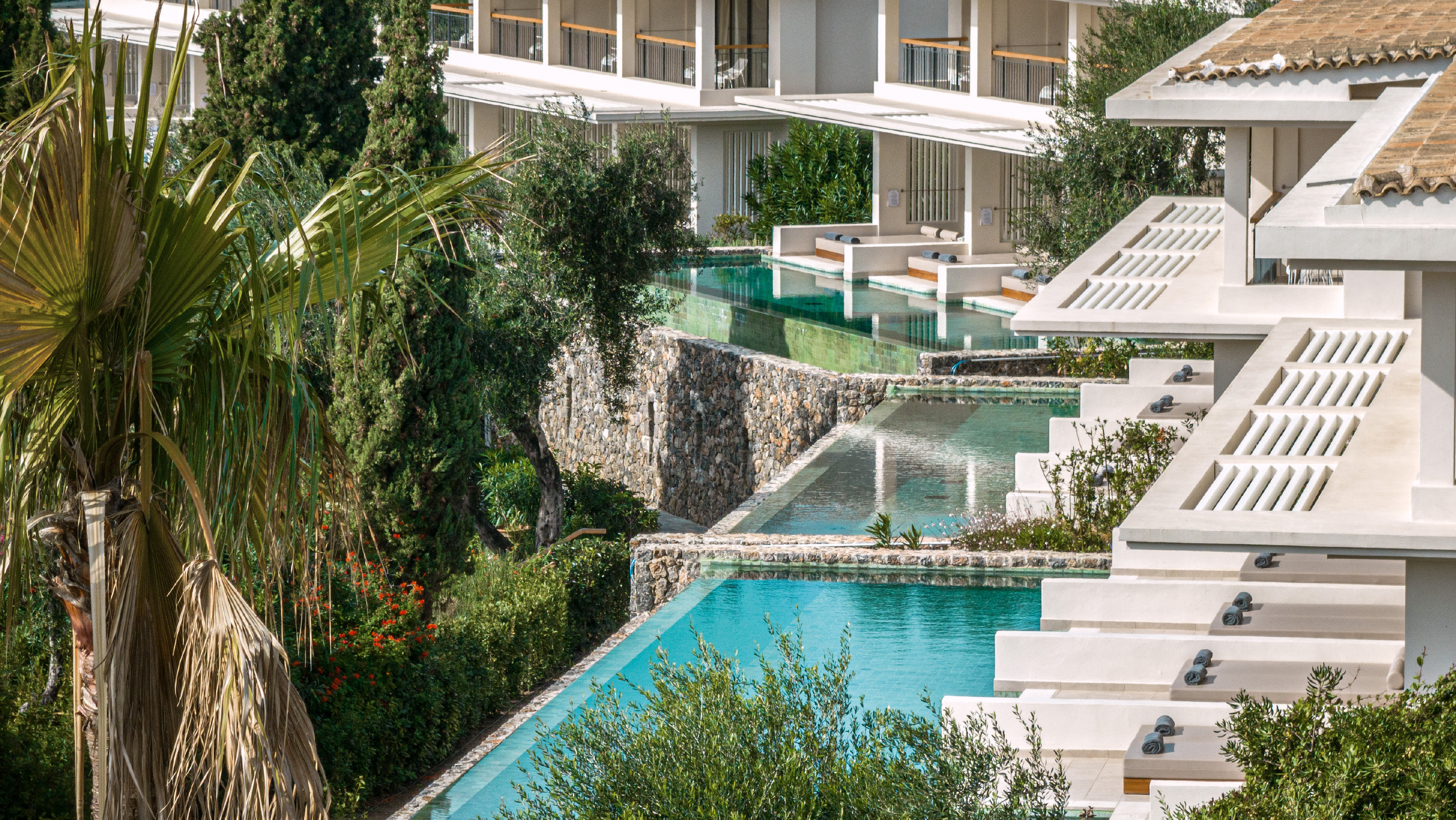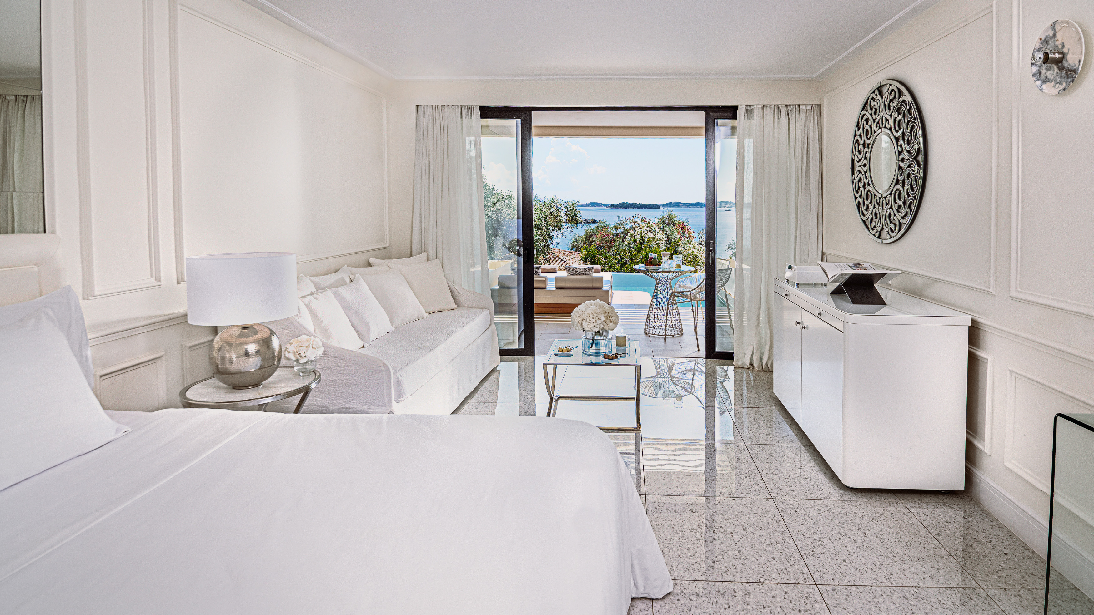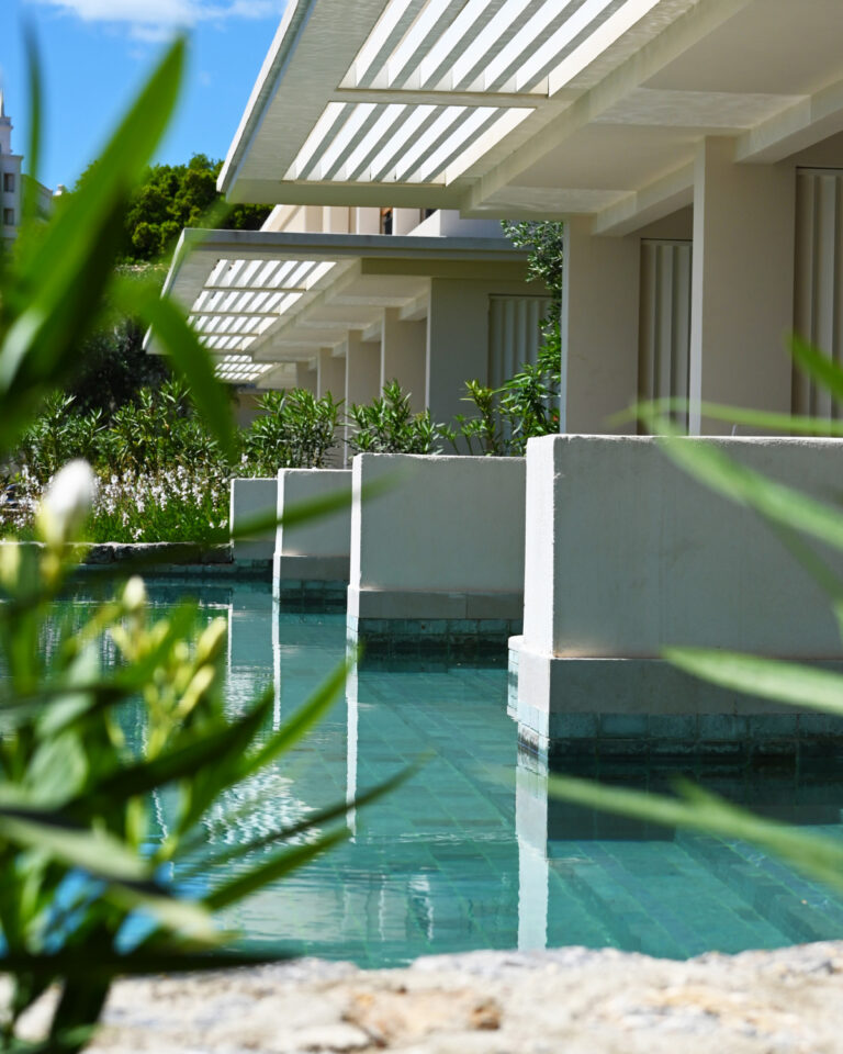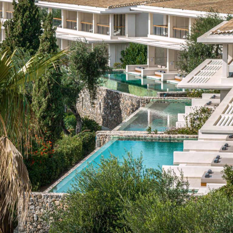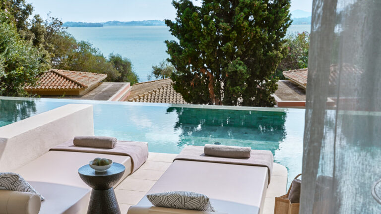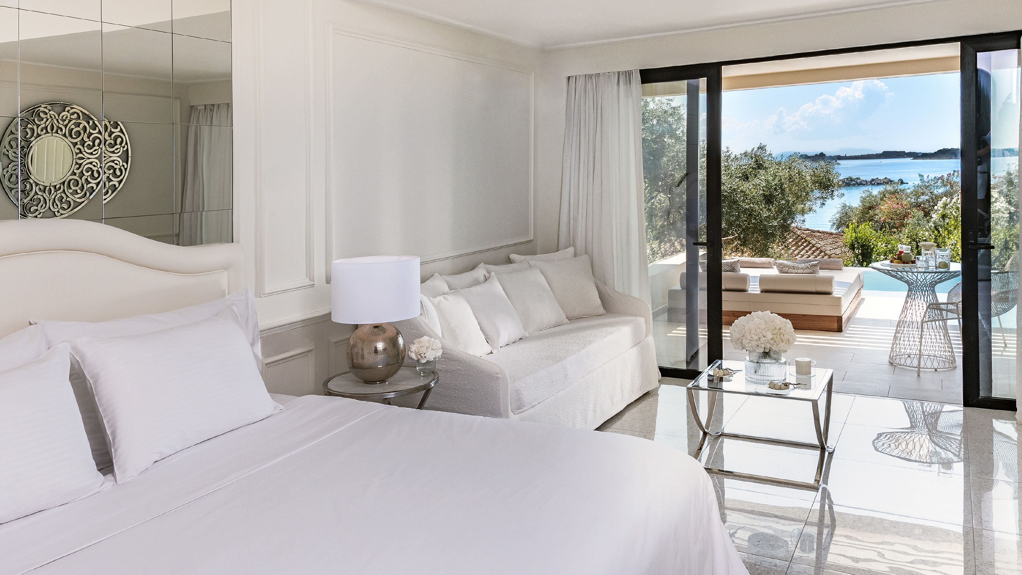 Drifted with the pure air and the clean blue Ionian waters, the Swim Up Junior Bungalows Suites are cozy guestrooms, with newly added sharing pool, nestled among the fragrant blooming gardens that face the sea. Surrounded by a pristine, lush scenery with thoughtful design & brand new décor, while spacious open plan layouts tempt for welcome seclusion.