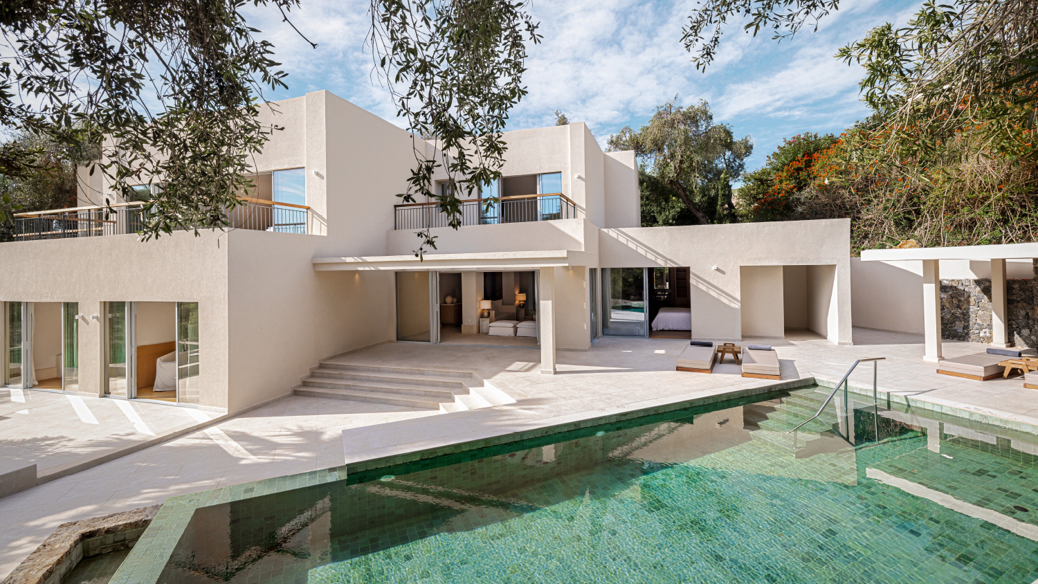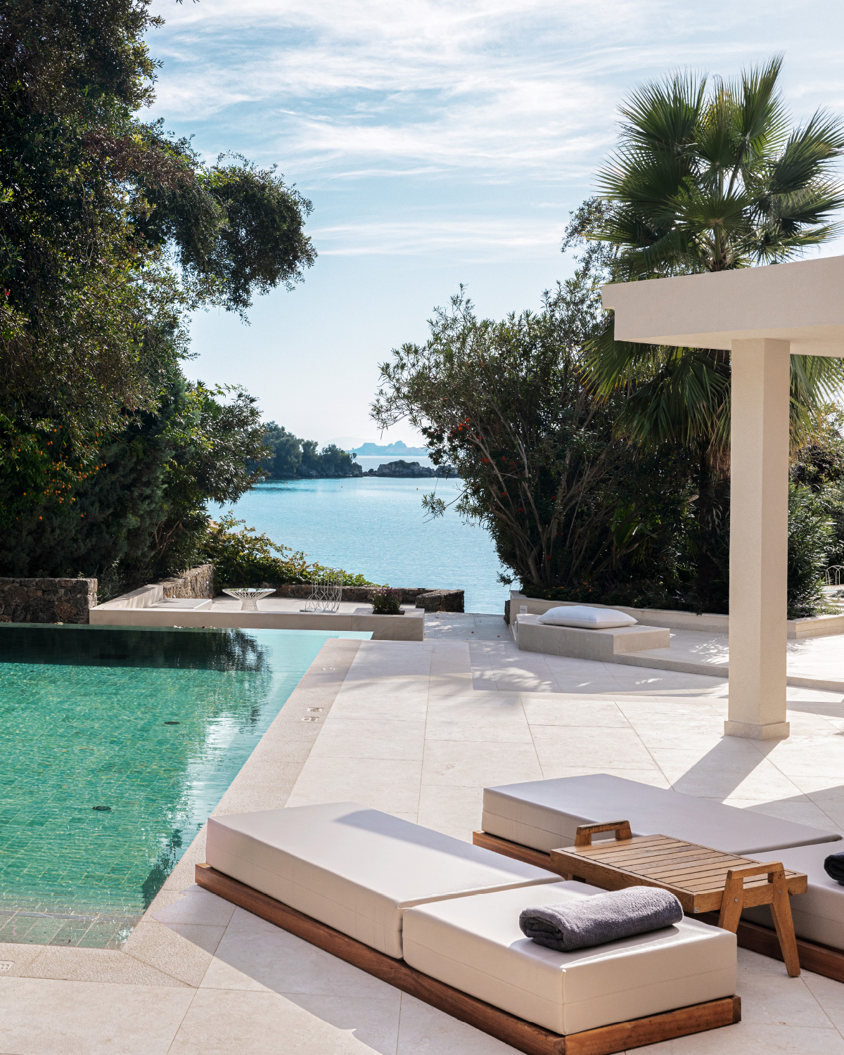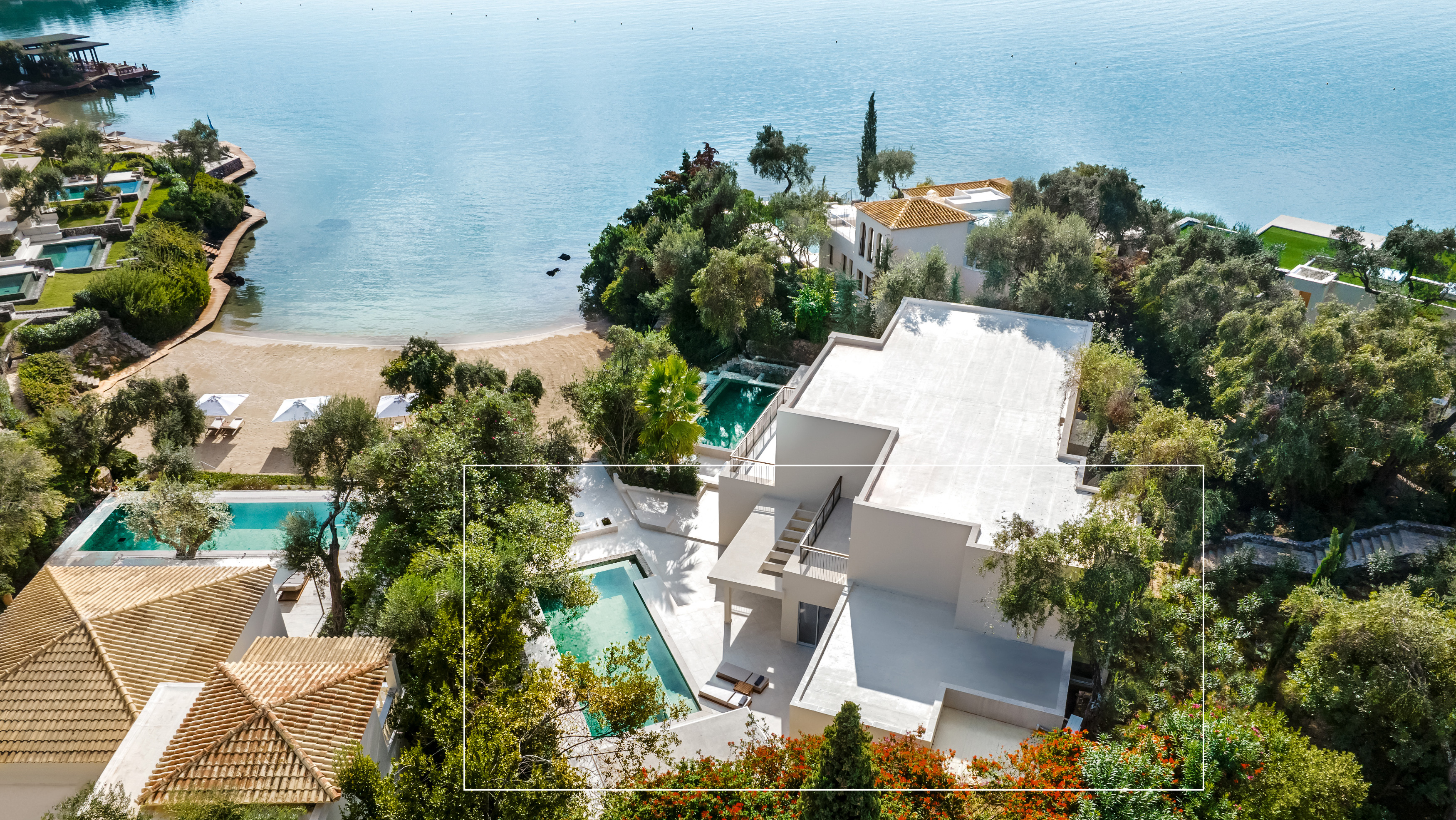 On a sun-drenched tip of Kommeno Peninsula, our dream villa is a welcoming place where horizons of blue mix with chic contemporary décor. The living room’s high ceilings and large windows bring you the Ionian breeze and azure sea views. Entertain al fresco on your vast garden terrace and your own swimming pool framed by lawns, lush vegetation and direct access to the beach.
