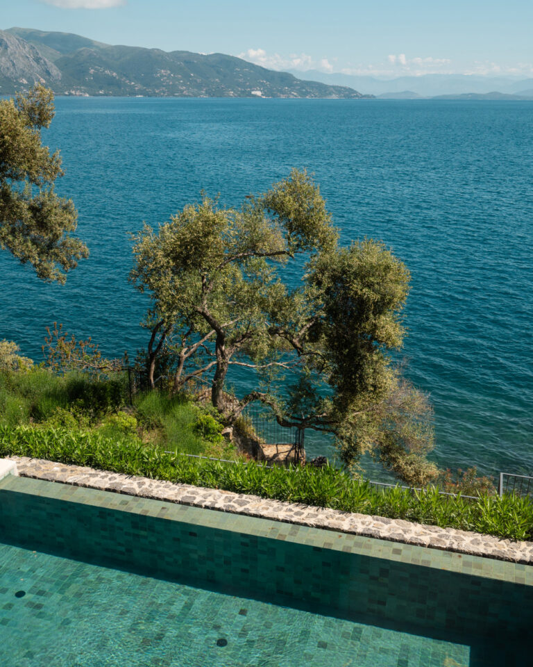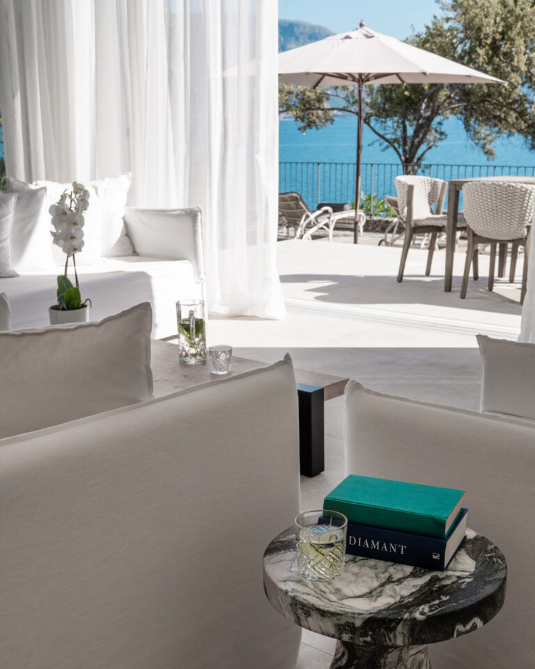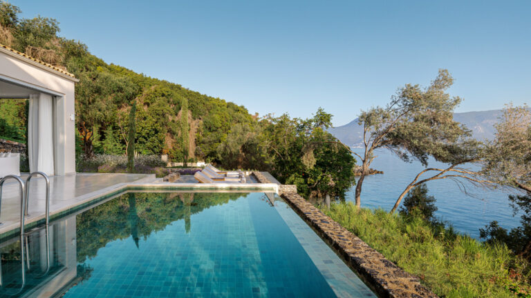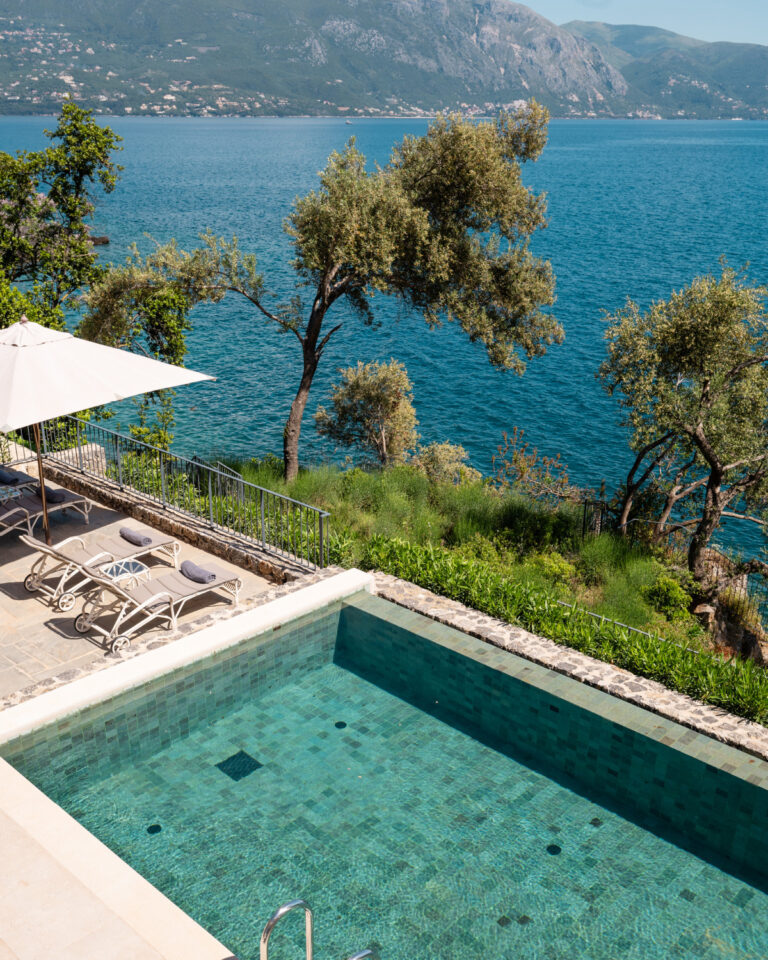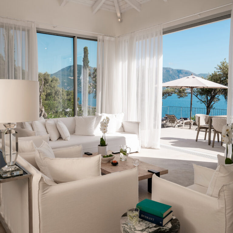 The essence of La Bella Vita, Palazzo di Lago sets on a cliff boasting a private terrace with unparalleled views of the Ionian Sea. Brand new elegant décor featuring serenity’s white and luxury details. Tucked away among cypress trees with a private pool and an outdoor lounging area exuding Ionian charm. A private wooden deck to the pristine sea is the perfect setting for relaxation, sunbathing or simply sea gazing.