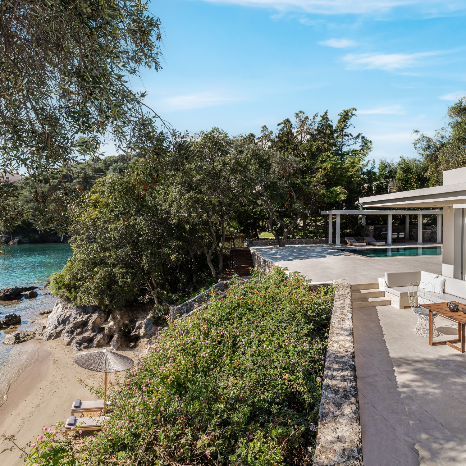 Stylishly posh, yet modern and contemporary…this stunning villa celebrates simplicity in its most luxurious form. The newly renovated Villa Waterfront with Private Pool and Private Beach is the epitome of elegance and grace. The white tone canvas in its interiors is adorned with tasteful decorative details and luxurious materials. The generous indoor and outdoor spaces, featuring separate sleeping quarters and marble bathrooms, spacious living areas and a private swimming pool overlooking your own private beach, set the tempo for an unforgettable stay backdropped by the eternal blue of the Ionian Sea.