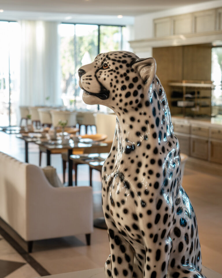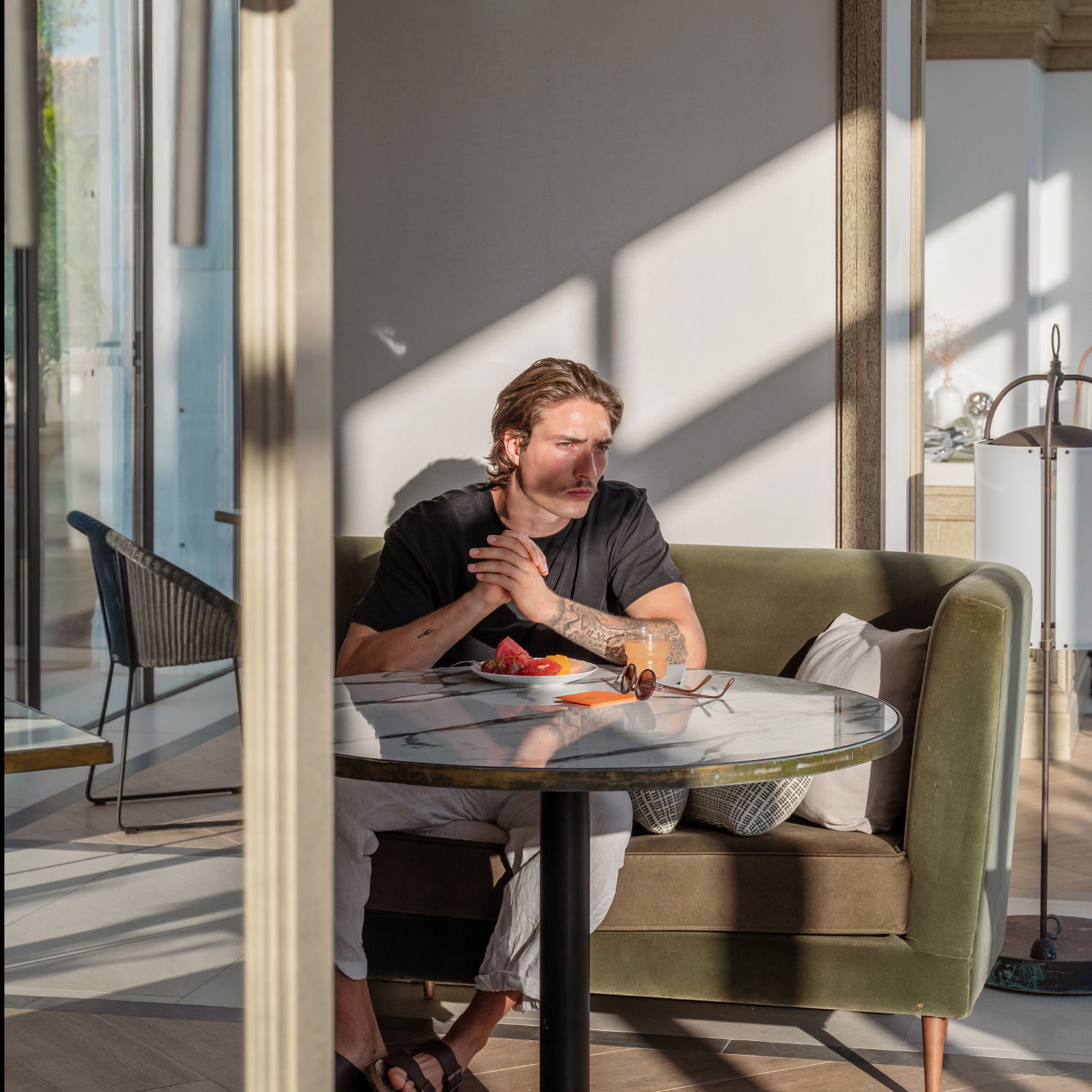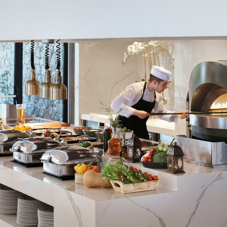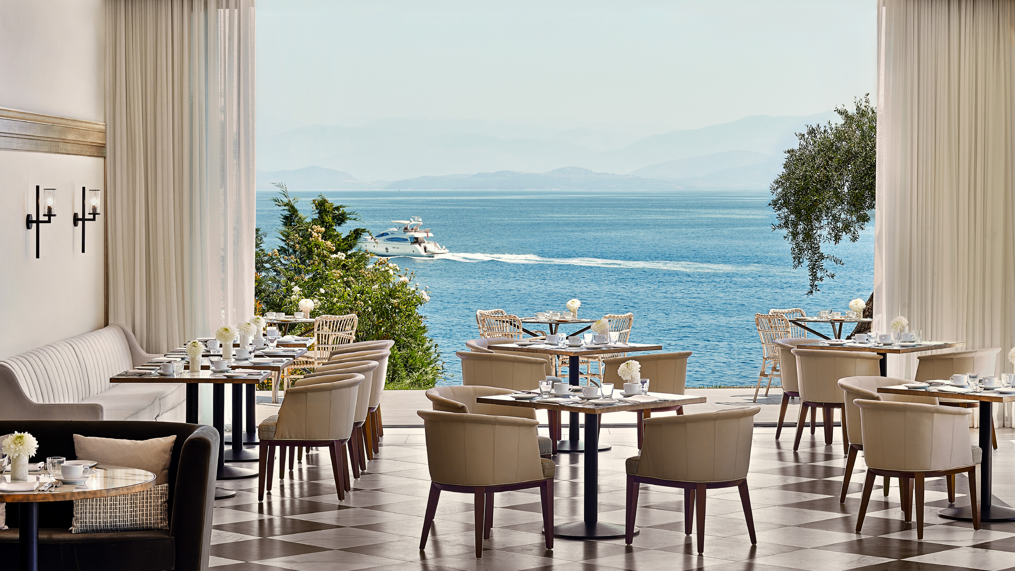 “Mon repos” references the verdant colonial estate of the same name outside Corfu with its light and airy palette with neoclassical details and rich, slightly worn floor finishes. Individual buffet stations display a bountiful Mediterranean spread at the entrance of the space. Woven throughout and integrated into the architecture of the space are artful displays of antiquities and curated collections. Move out to the lush patio to enjoy the expansive views of the sea.