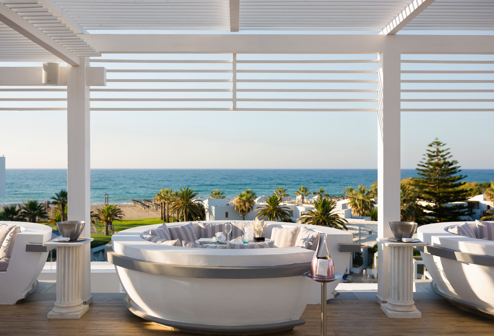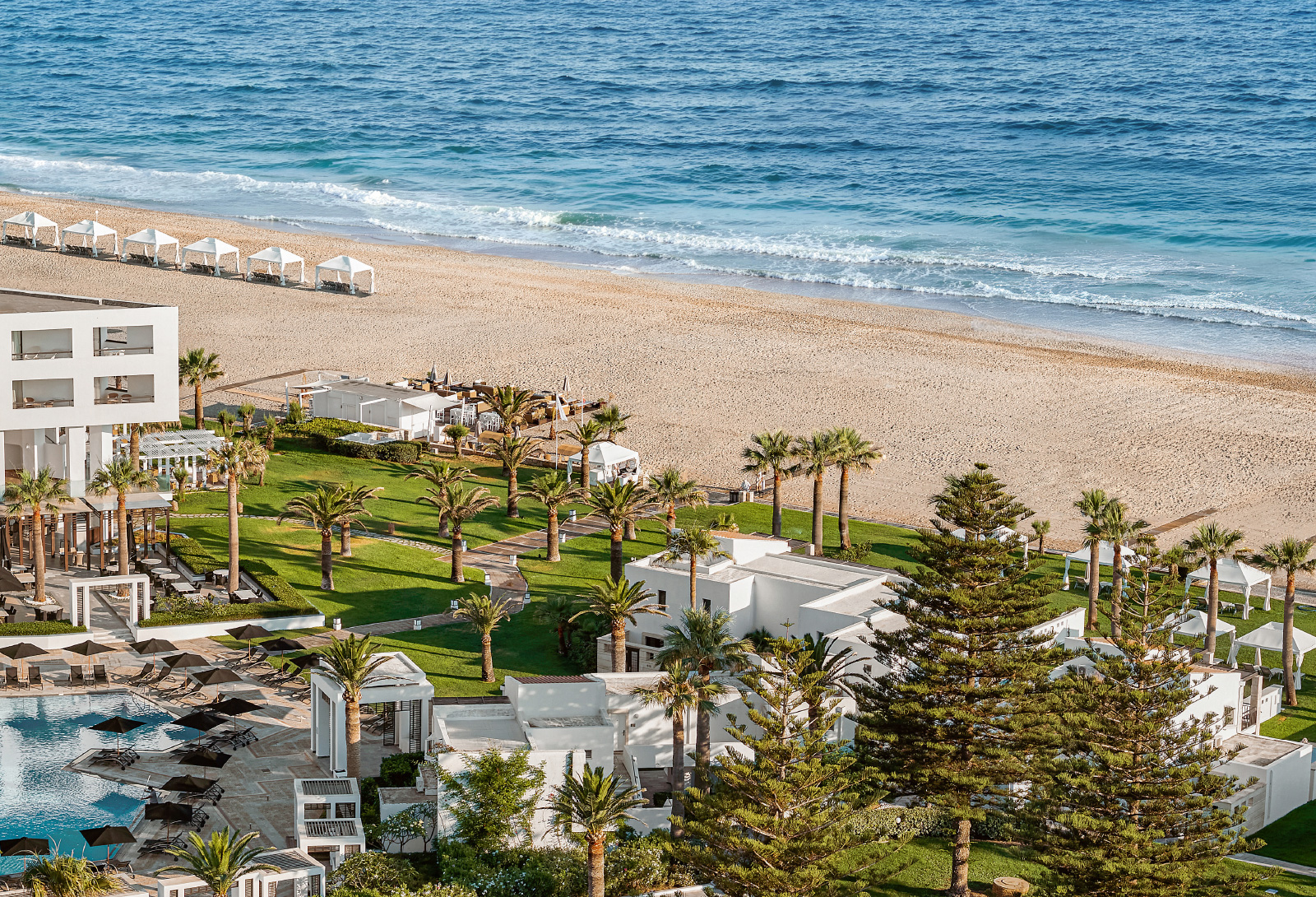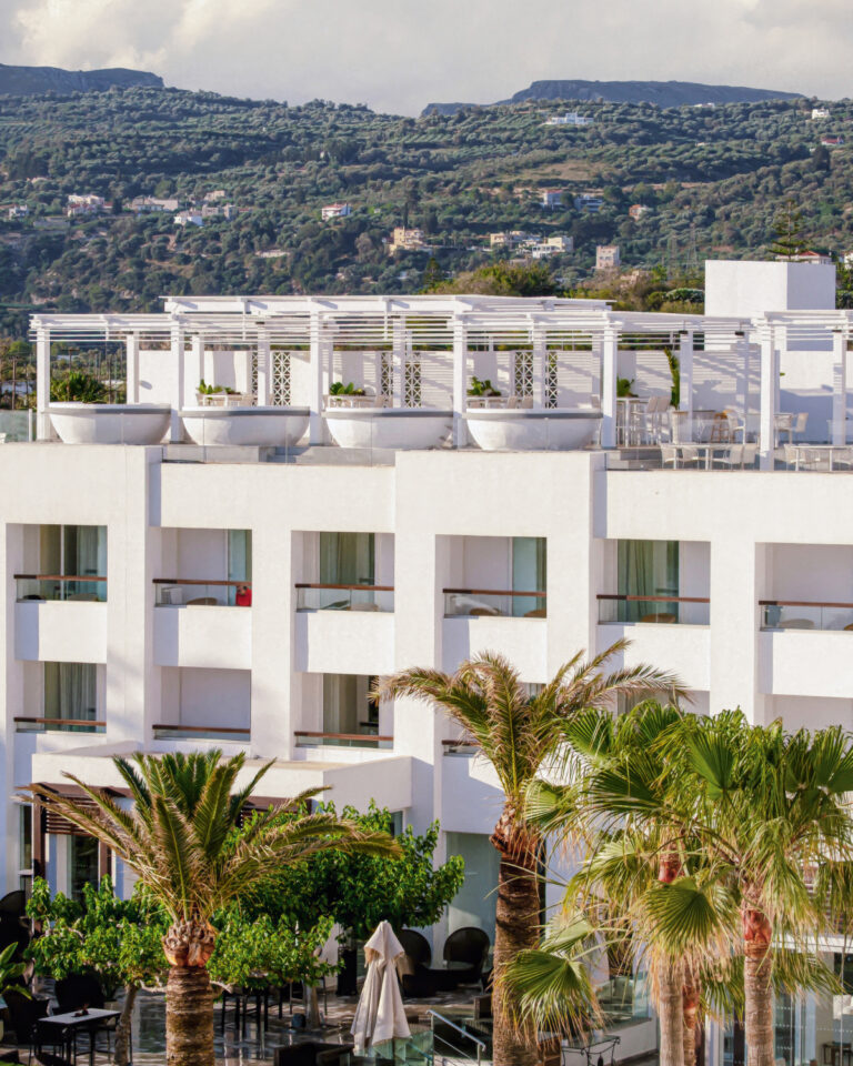 Creta Palace rises renewed along Crete’s longest sandy beach — a 12-kilometre stretch of golden coastline on the island’s north shore. Four overflowing pools gaze out to the Cretan Sea, glass-wrapped lounges open to gardens of frangipani and palm trees, and the old town of Rethymno is just a beach walk away.