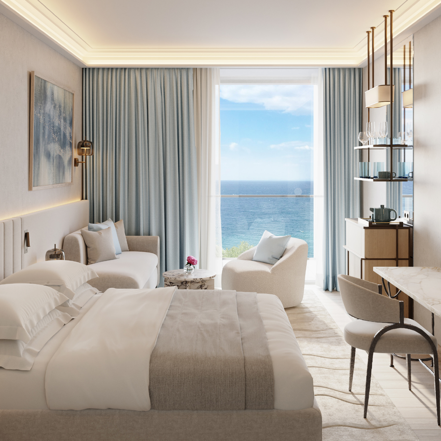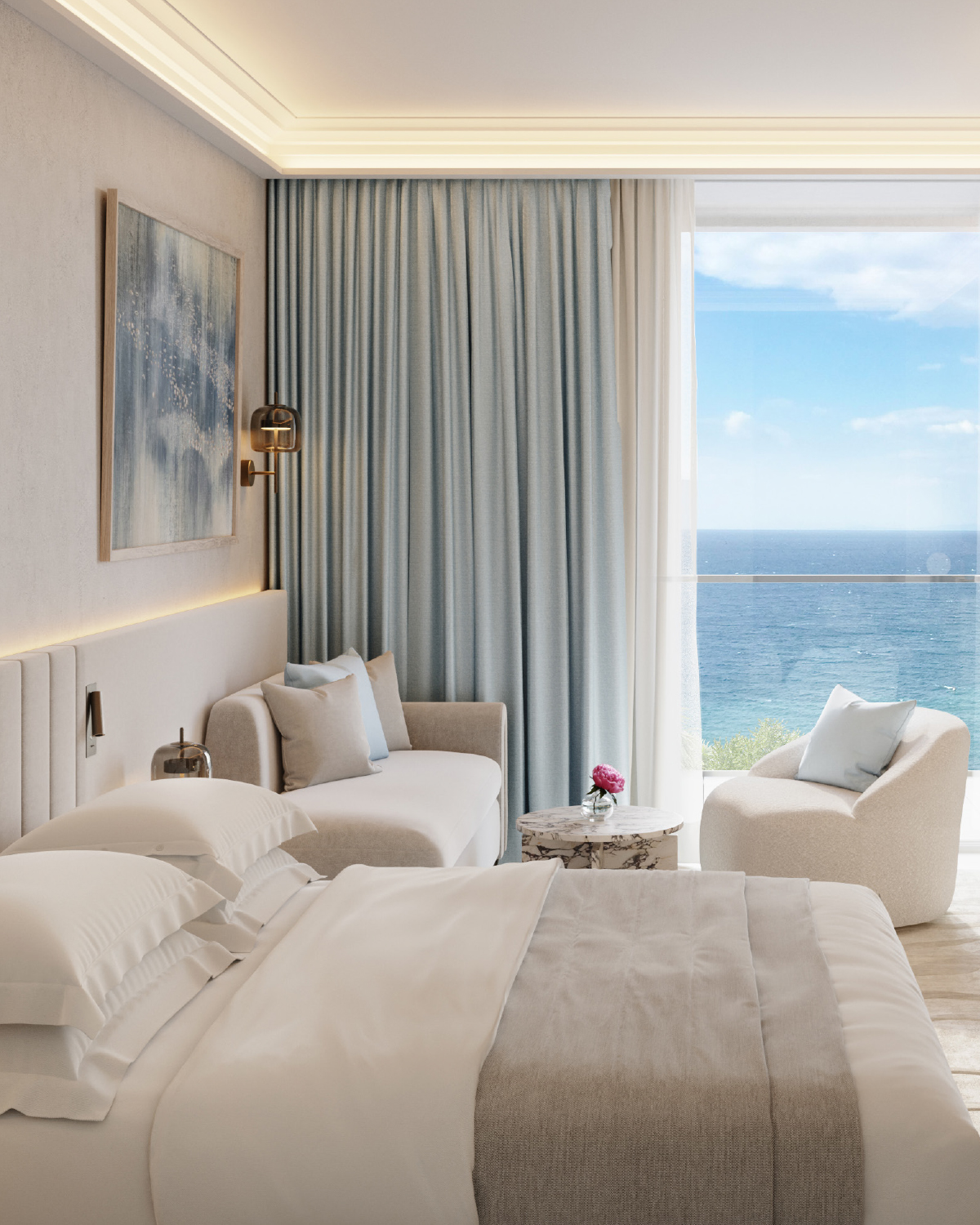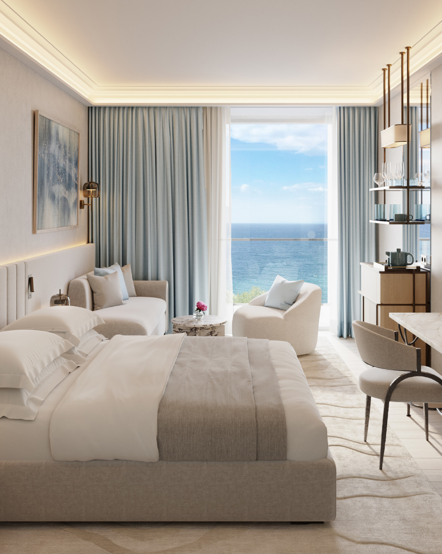 Creta Palace presents newly designed guestrooms, suites and interconnecting family options, introducing lighter wooden finishes, custom room bars, and unrivaled views of the Cretan Sea. All new bathrooms featuring crystal-onyx vanity counters and extra-large walk-in showers fuse with palettes of blue pastels and cool creams.