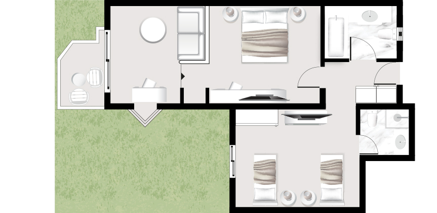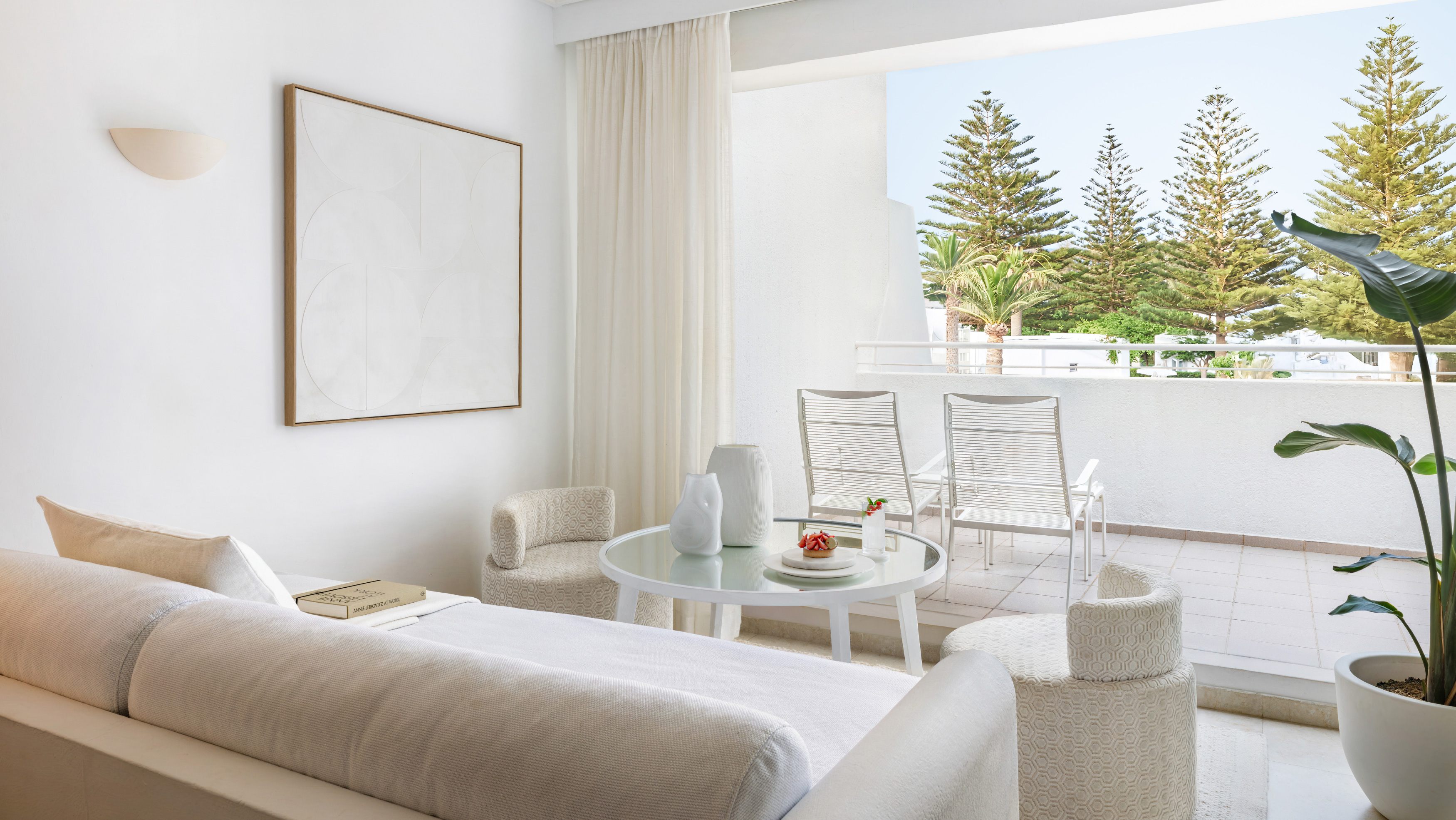 Overlooking the lush Mediterranean gardens from an airy balcony, these family accommodations conveniently offer two separate bedrooms, each with en-suite bathroom, for enhanced comfort and optional privacy.