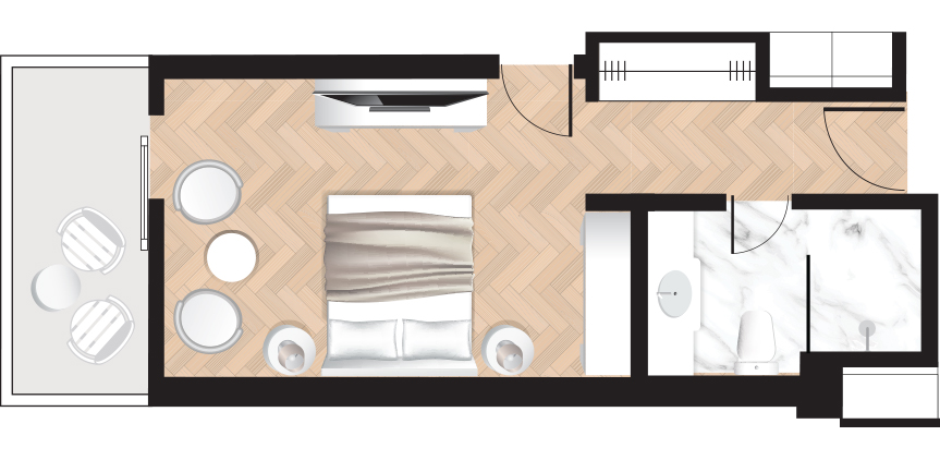 Ideally appointed in the Main Building, exquisite rooms decorated in gold, silver and ivory shades with stone or wooden floors, open onto a comfortable balcony offering relaxing views of the sea.