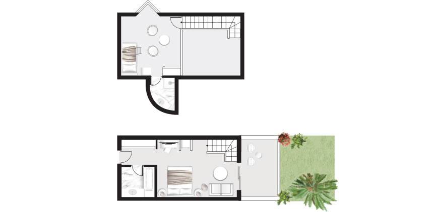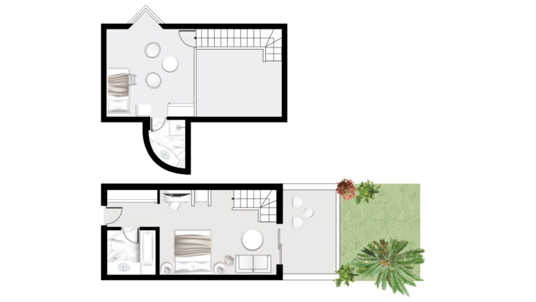 Fashioned in the quaint style of village bungalows and expertly renovated across two levels, the Garden View Maisonettes exhibit a tastefully modernized layout. Featuring a cozy master bedroom on the ground floor and a beautiful wooden staircase leading to the children’s sleeping area, these maisonettes create a direct visual to the ground floor space.