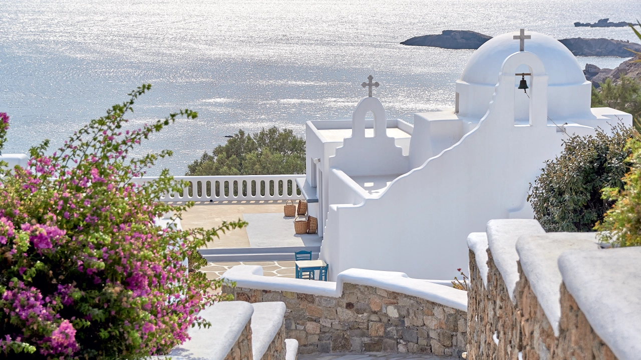 Mykonos undercover. A little hotel on a secluded private beach after Agios Sostis. The views are hallucinating. Rooms as secret cocoons. A tiny restaurant hangs above a cliff. Two whitewashed churches lingering above the Aegean.