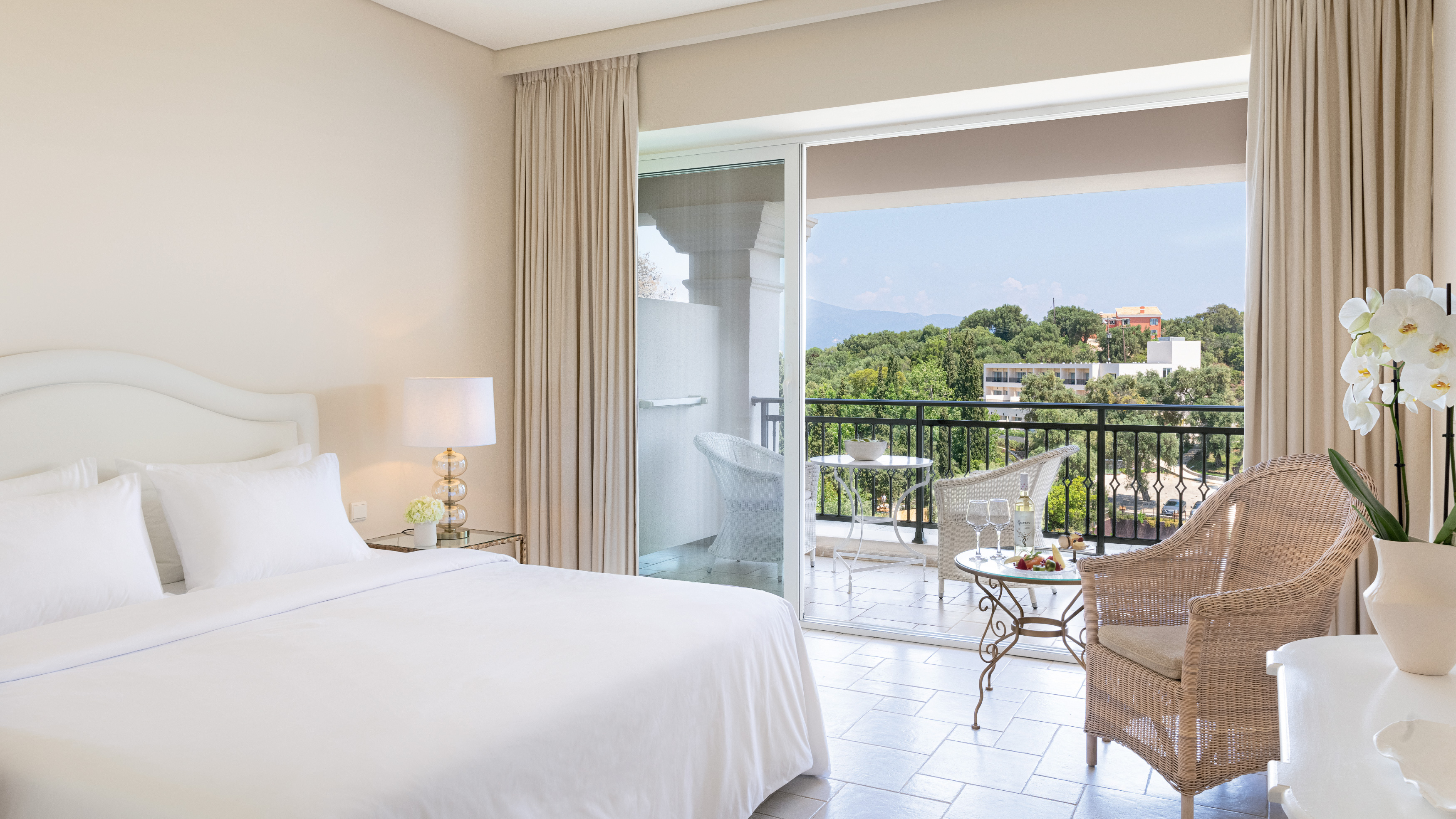 Located in the main building, these elegant open plan guestrooms are ideal for families. Step out onto the balcony to enjoy the evergreen Corfiot landscape.
