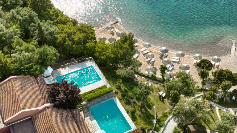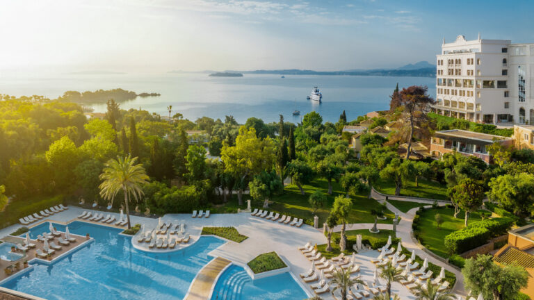 Eva Palace sits on a private peninsula along Corfu’s emerald coast, surrounded by the Ionian Sea. The lush landscape hides coves, sandy shores, and tranquil bays. Just minutes away, the charming Corfu Town’s Venetian influences shine in its architecture, cobblestone alleys, pastel-hued mantions with vividly decorated balconies, and historic fortresses.