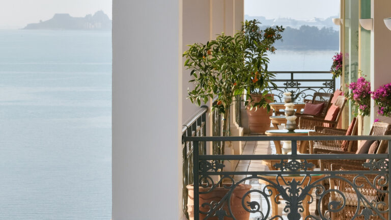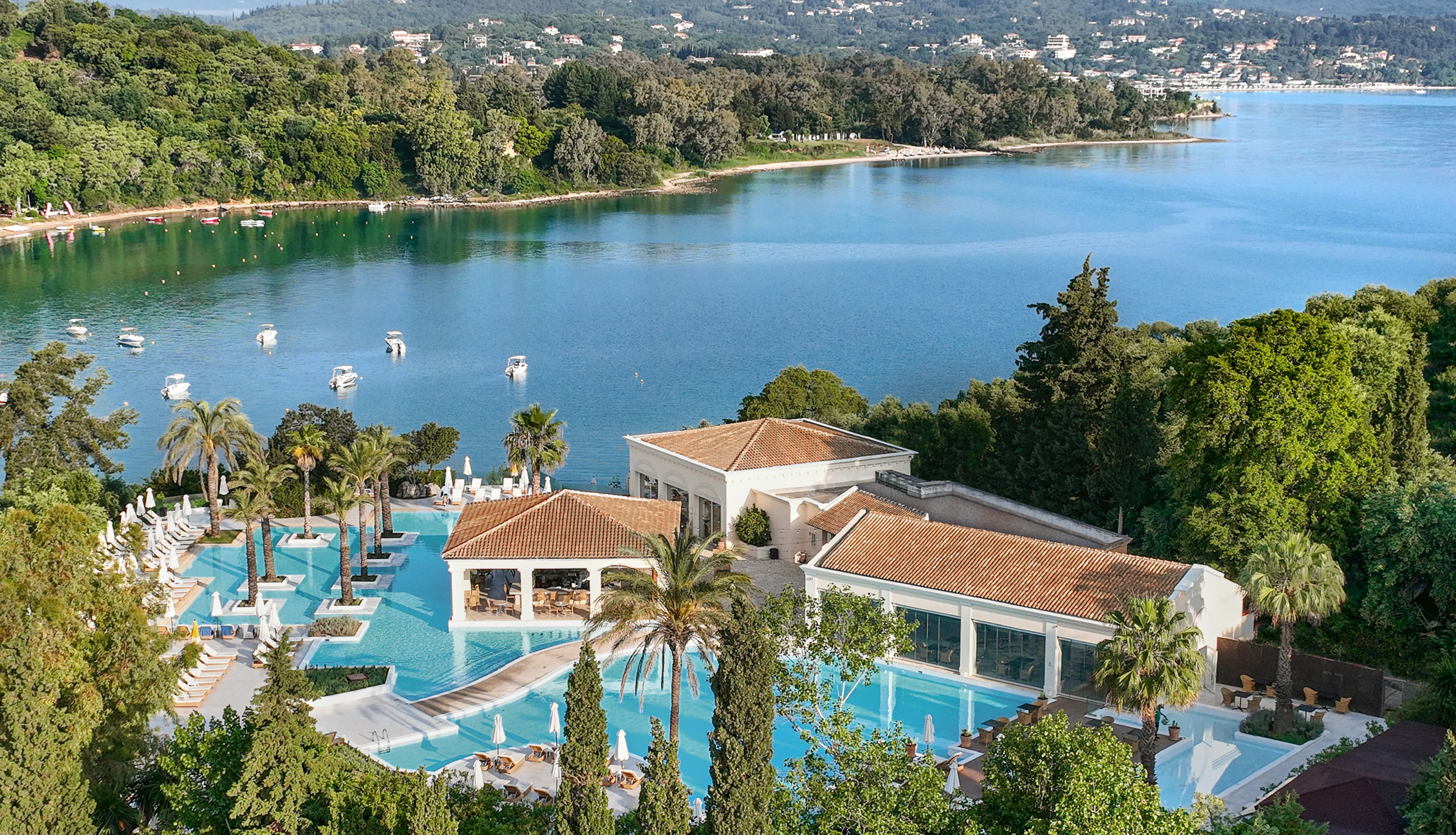 Eva Palace sits on a private peninsula along Corfu’s emerald coast, surrounded by the Ionian Sea. The lush landscape hides coves, sandy shores, and tranquil bays. Just minutes away, the charming Corfu Town’s Venetian influences shine in its architecture, cobblestone alleys, pastel-hued mantions with vividly decorated balconies, and historic fortresses.