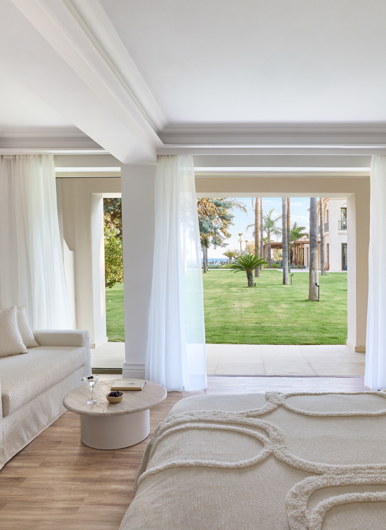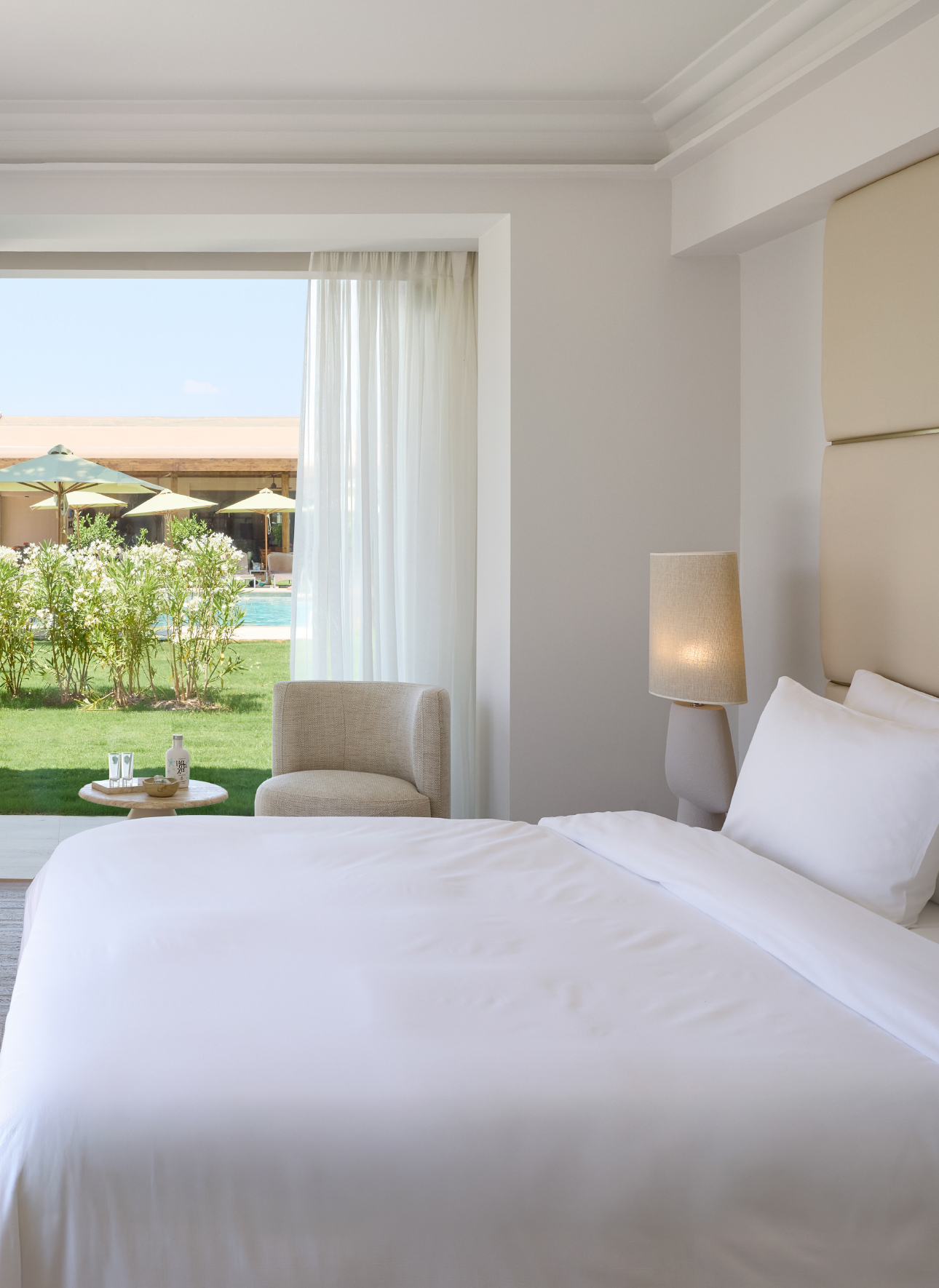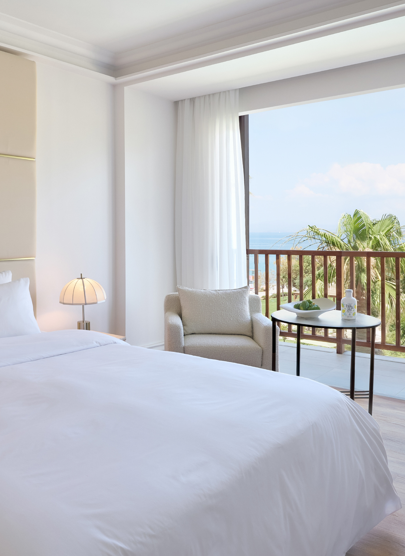 The gentle sea breeze and the coastline’s golden hues set the scene for your stay. Step onto your private balcony or lounge in sophisticated interiors, where plush furnishings and elegant details create a comfortable atmosphere.