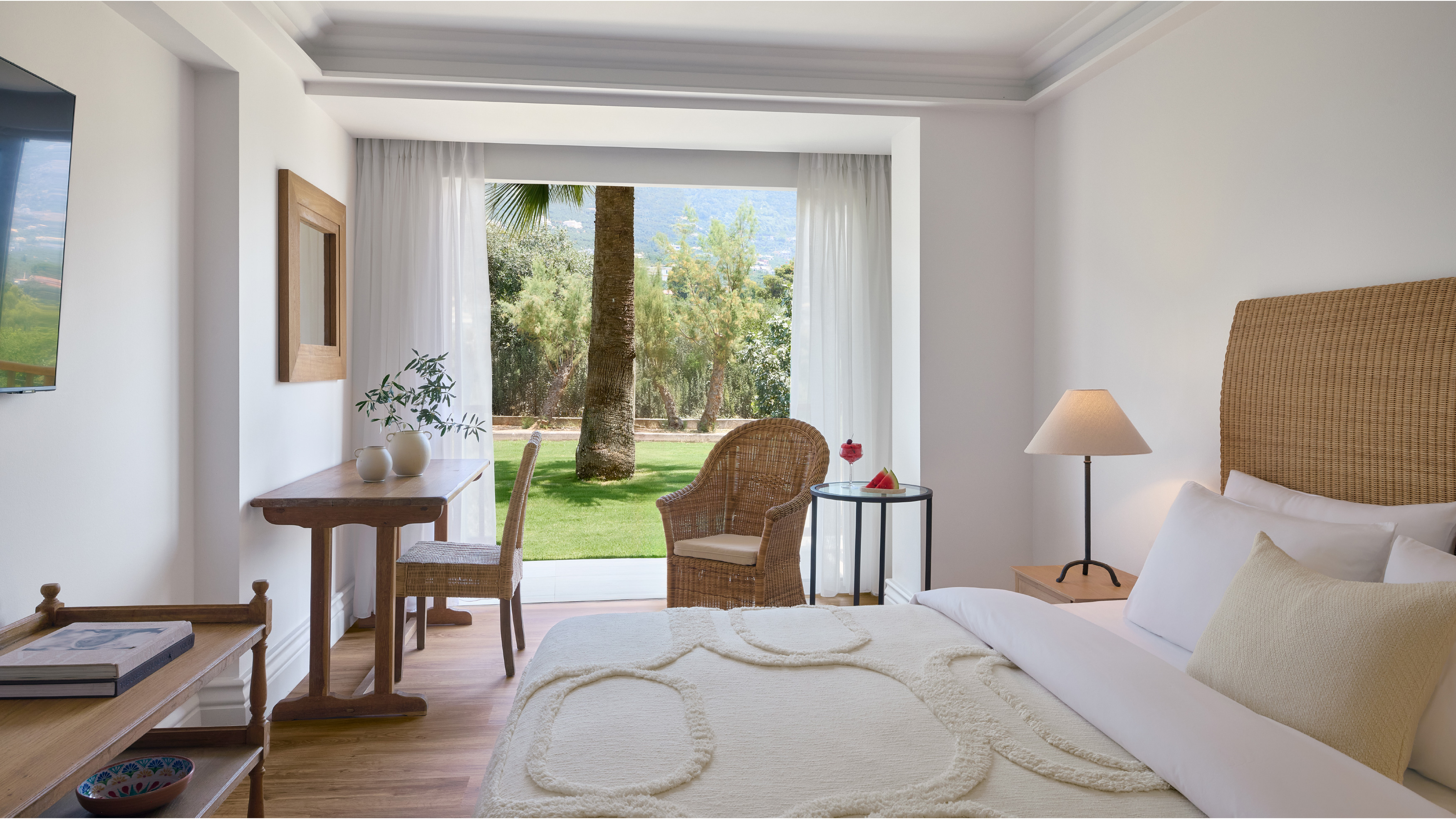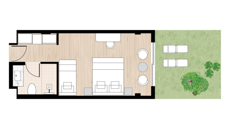 Step into a haven of comfort where floor-to-ceiling glass doors open onto a private covered veranda, and the resort’s exotic gardens and swaying palm trees create a dreamy, nature-infused escape. Inside, organic textures, soft fabrics, and earthy hues invite you to sink into relaxation.