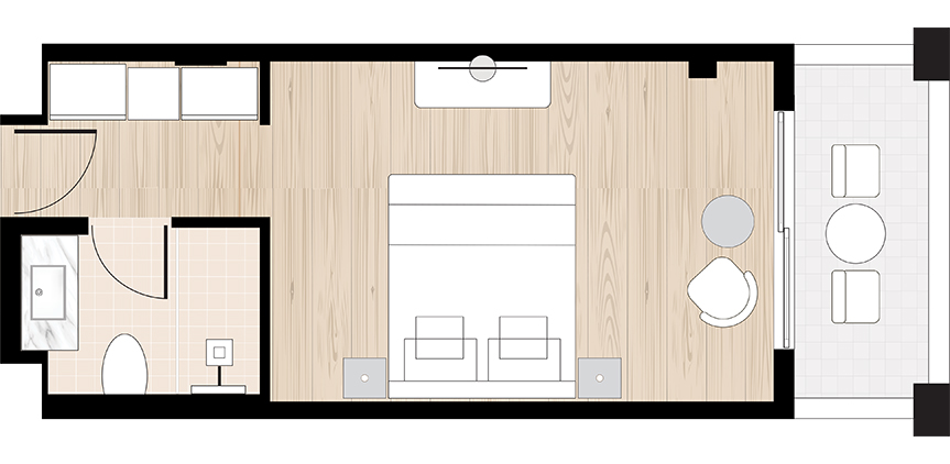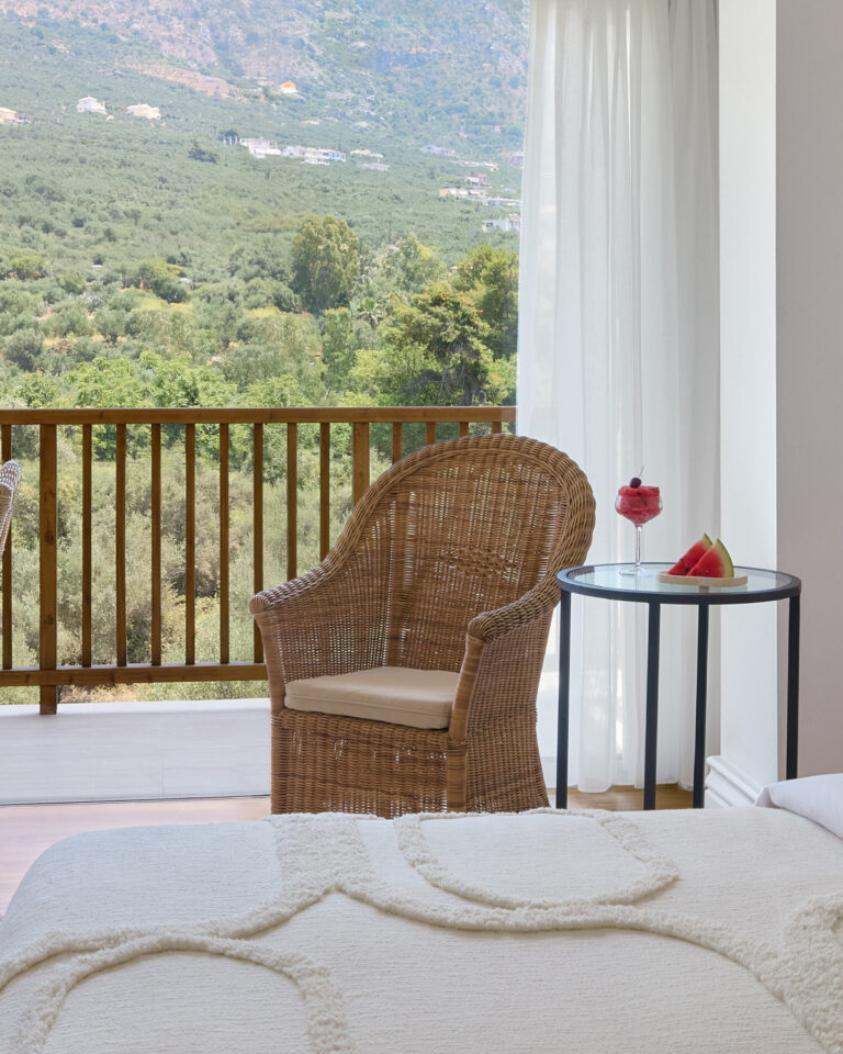 Awaken to the gentle glow of sunlight streaming through large windows, filling this stylish room with warmth. A private balcony extends your living space into nature, surrounded by garden and mountain vistas. The open-plan design, in soft neutral tones, is both inviting and sophisticated, featuring plush furnishings, a cozy seating area, and a sleek walk-in shower.