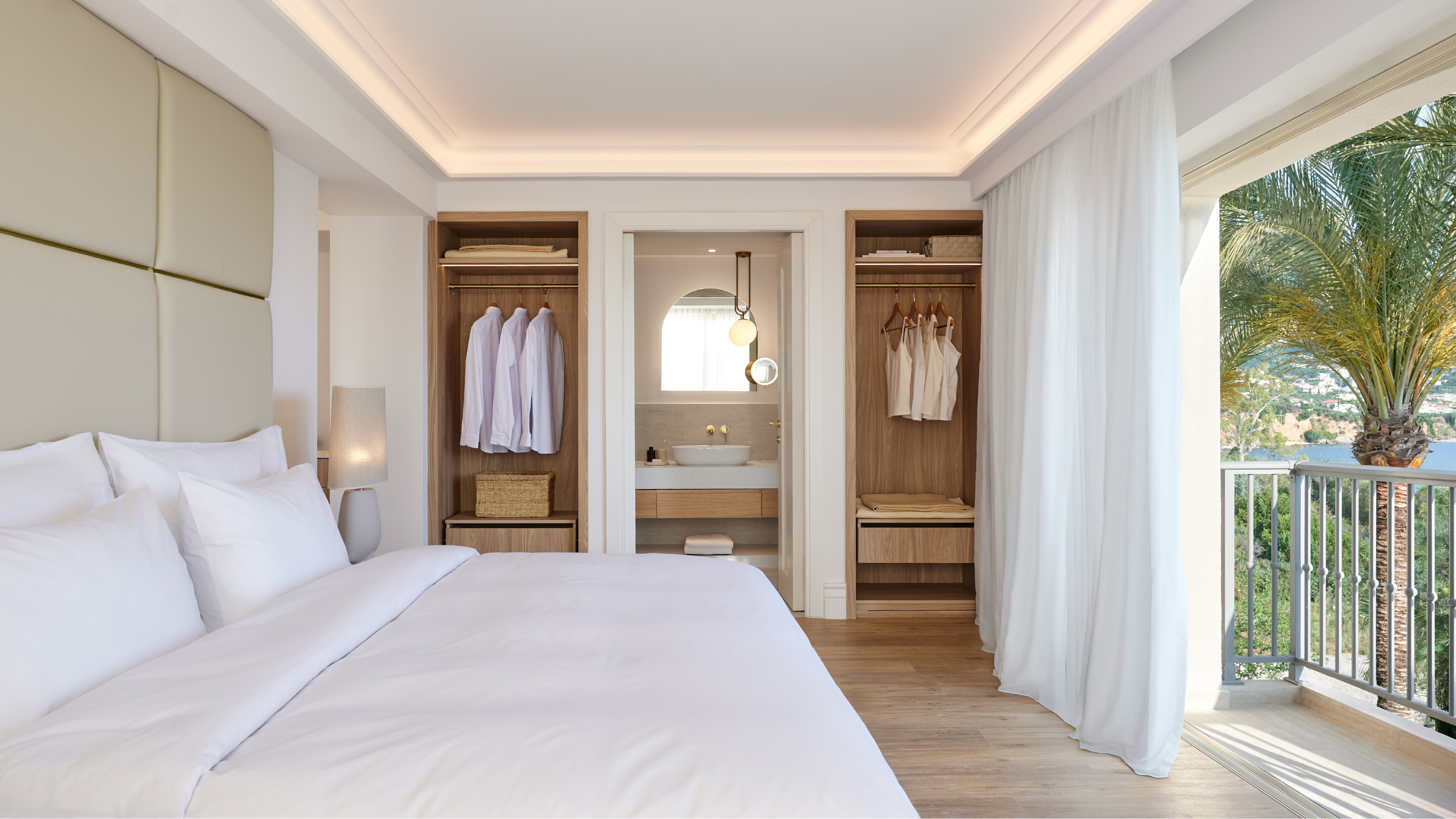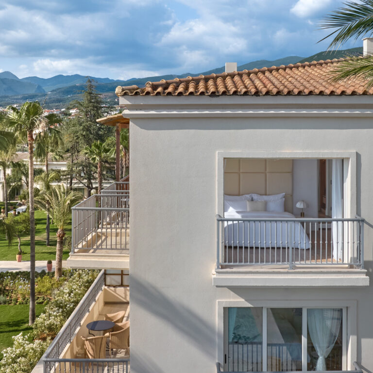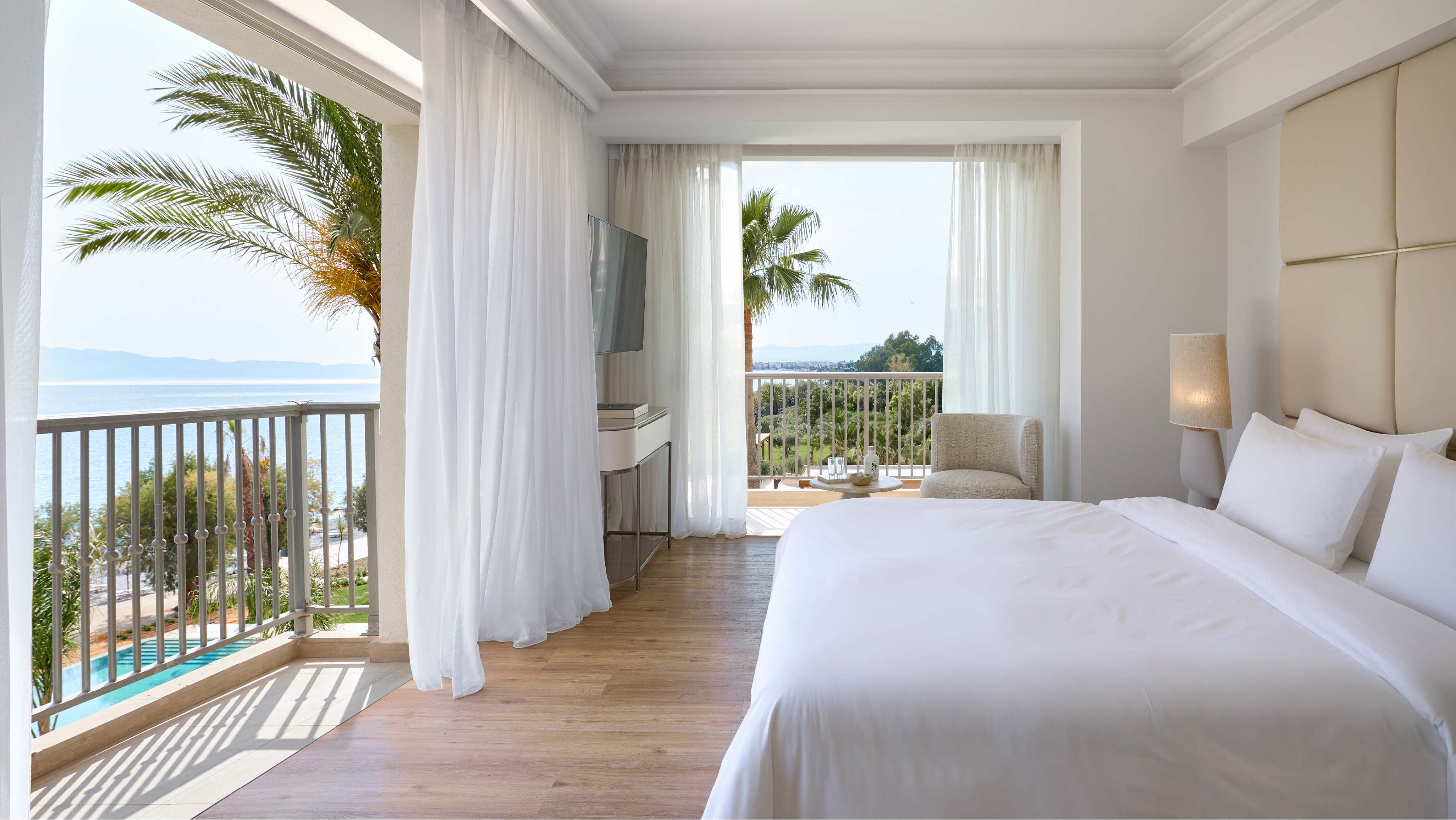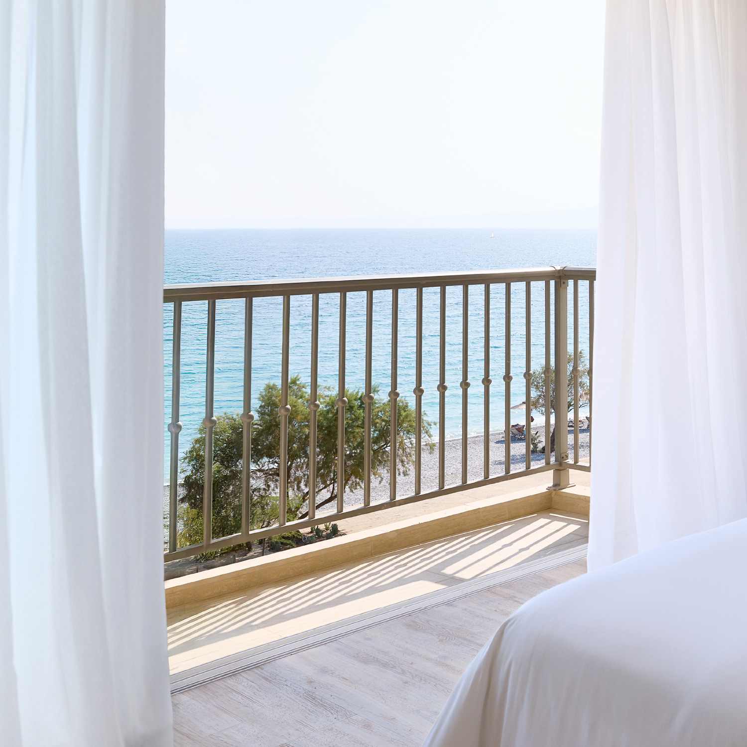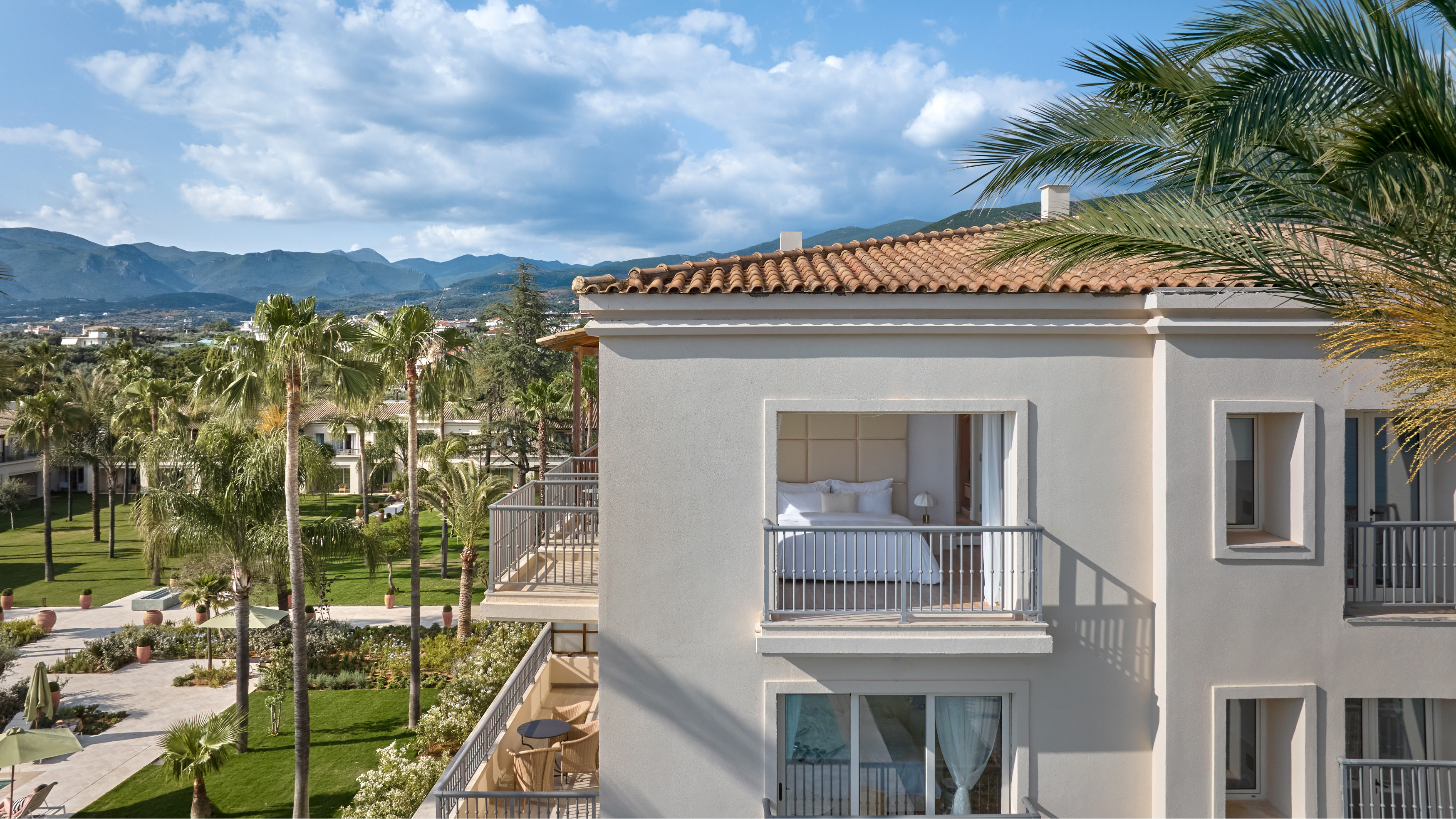 Situated in the resort’s most coveted corners, this suite offers uninterrupted panoramic views of the dazzling Messinian Gulf. The sophisticated, neutral-toned interiors create a refined coastal escape. From your private balcony, gaze at the horizon stretching endlessly before you.