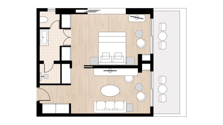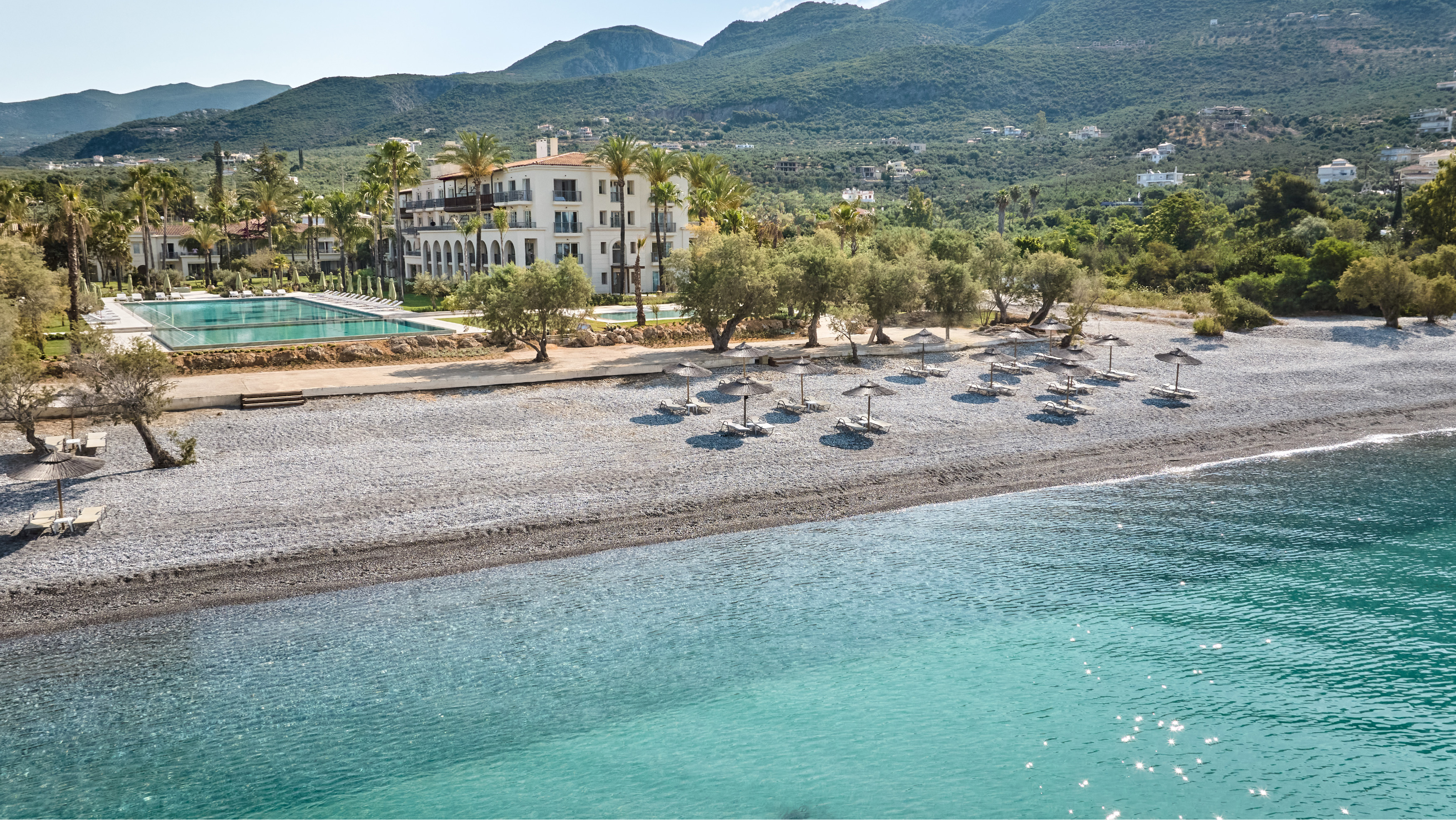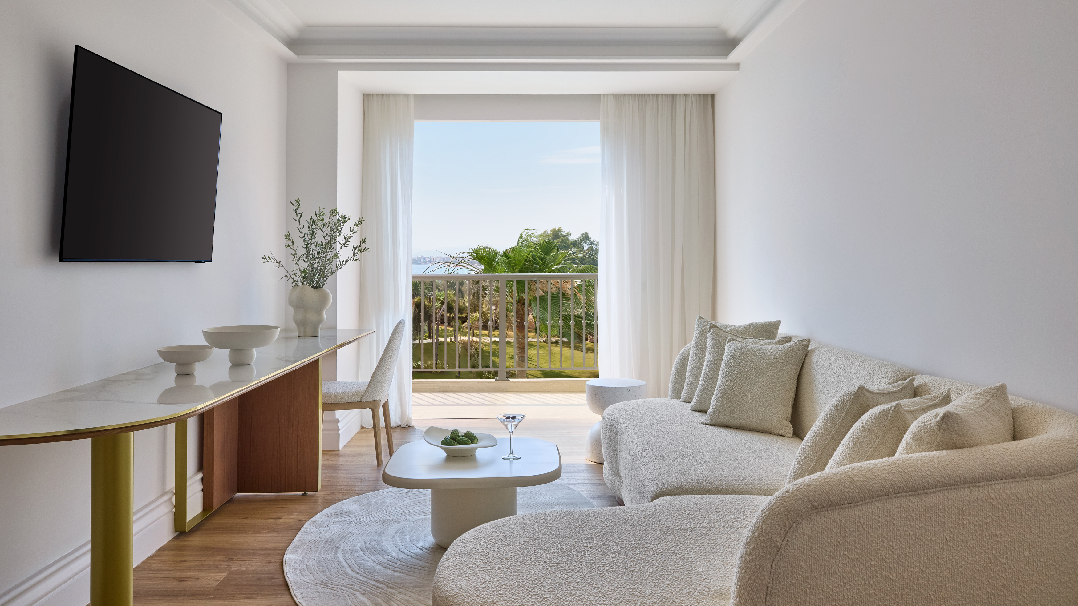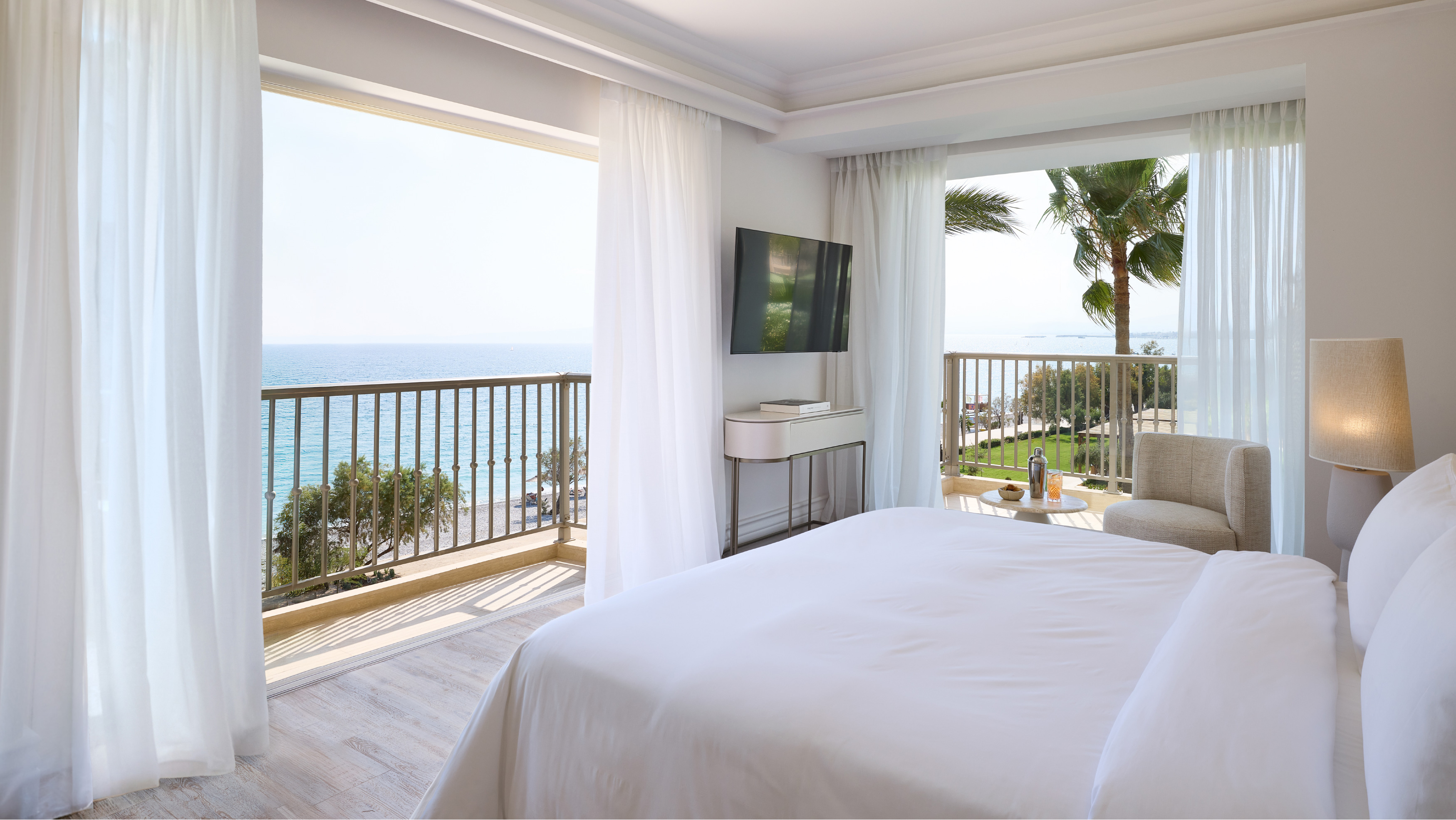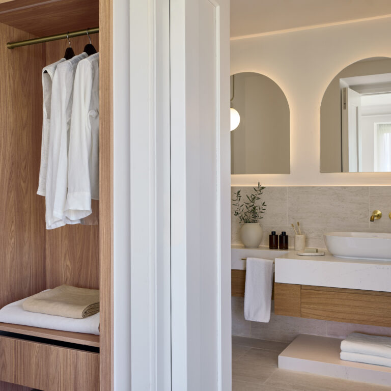 Situated in the resort’s most coveted corners, this suite offers uninterrupted panoramic views of the dazzling Messinian Gulf. The sophisticated, neutral-toned interiors create a refined coastal escape. From your private balcony, gaze at the horizon stretching endlessly before you.