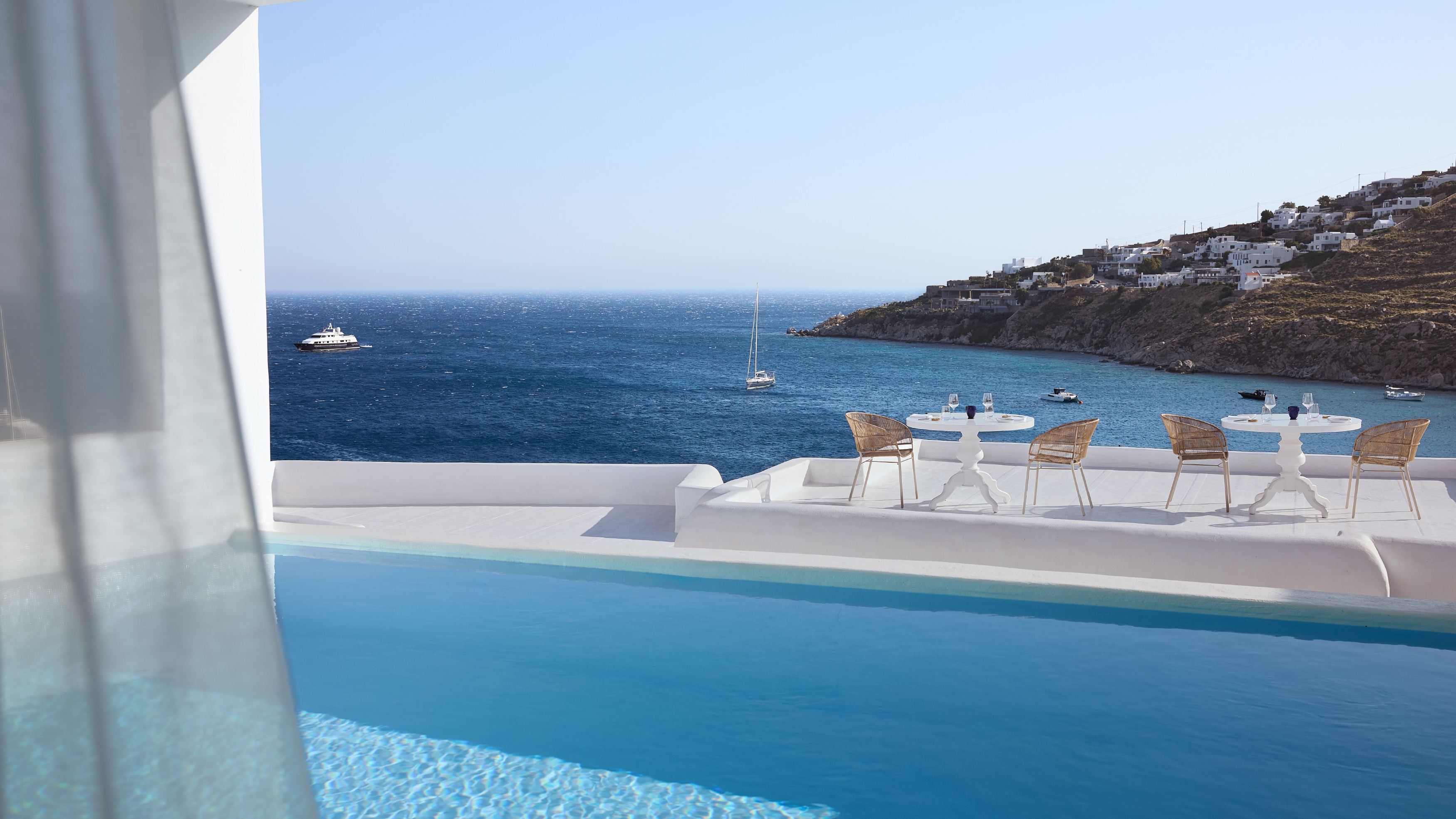 A Cycladic Icon on the most celebrated beach of the island. Mykonos Blu gazes at the Aegean Sea and the superyachts. Its Cycladic architecture enhanced, it's where the Glitterati meet and breathe in the views – the best in Mykonos.