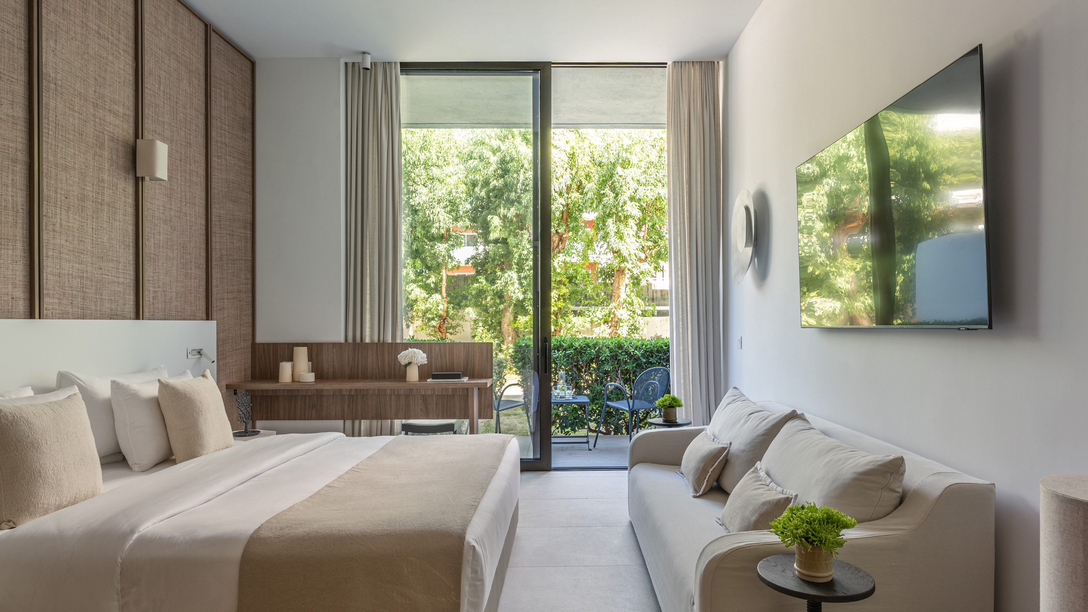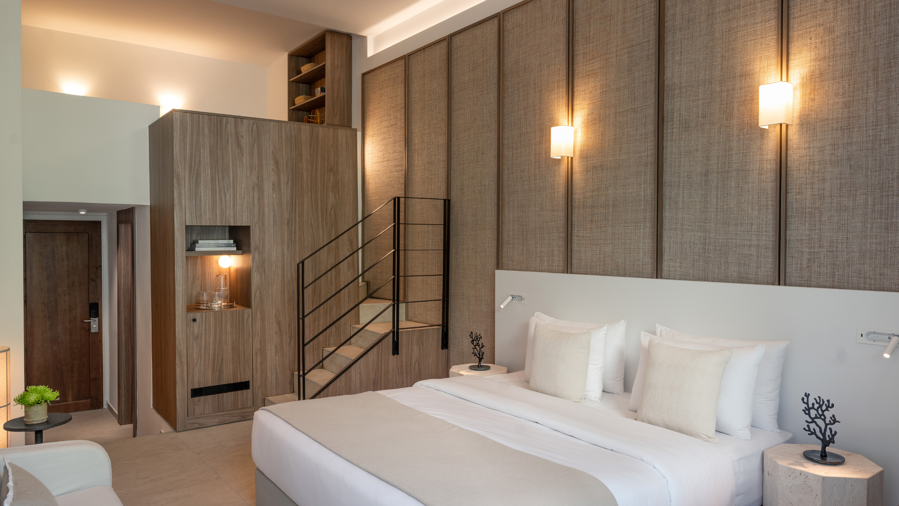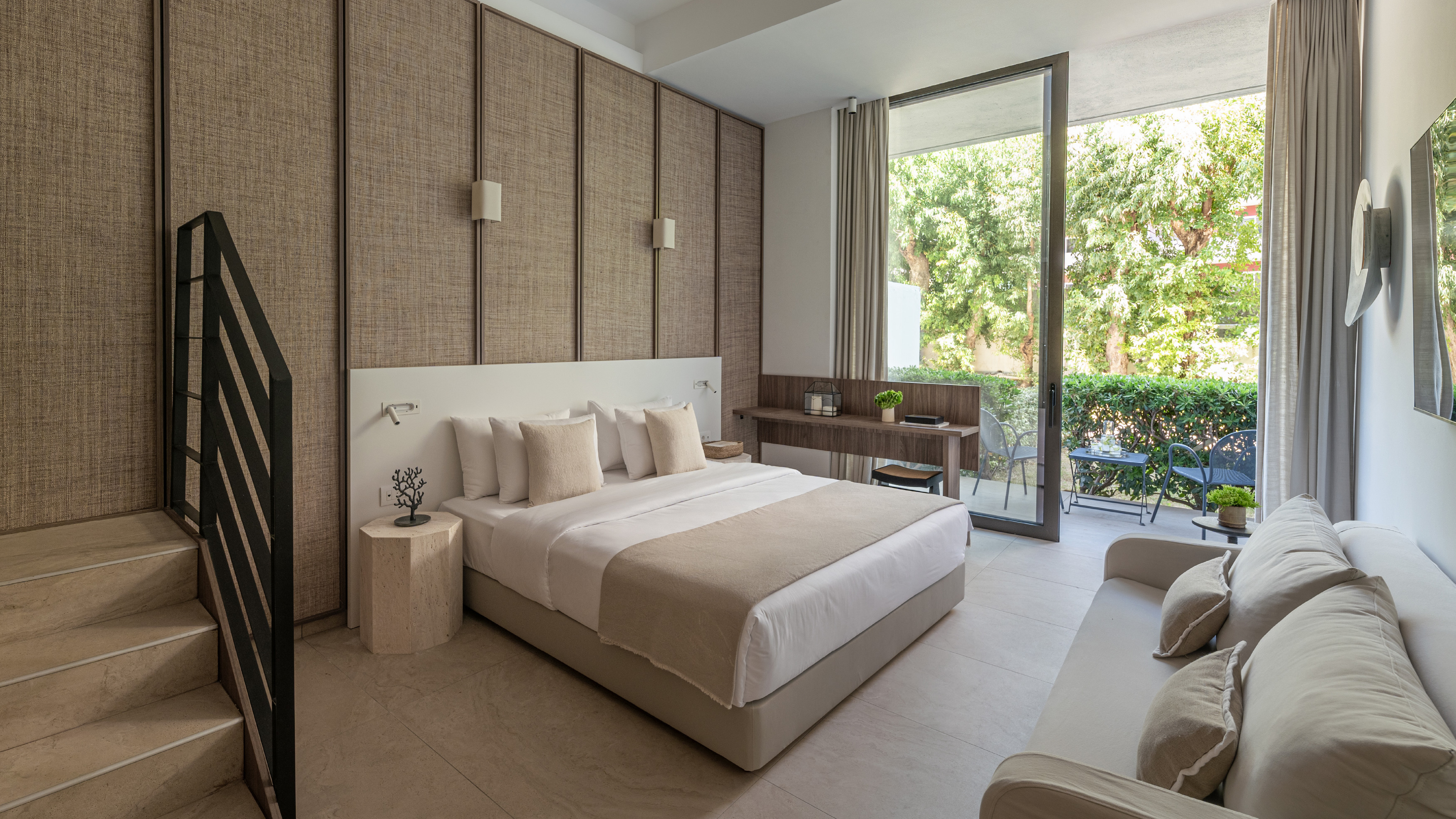 Updated family accommodation ideally located on the ground floor for seamless indoor-outdoor living. An ideal choice for relaxed family holidays, the Premier Loft Family Guestroom Garden View provides 2 separate sleeping spaces, one on the ground floor and one in the loft area, connected through a wooden staircase. The direct access to the lush garden evokes the feeling of being one with nature and brings together indoor and outdoor living.