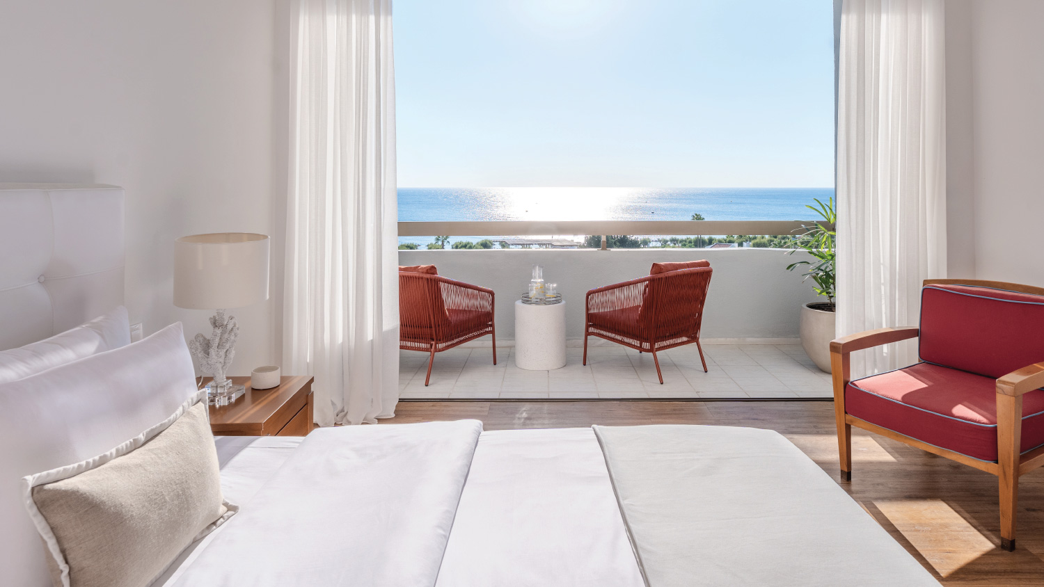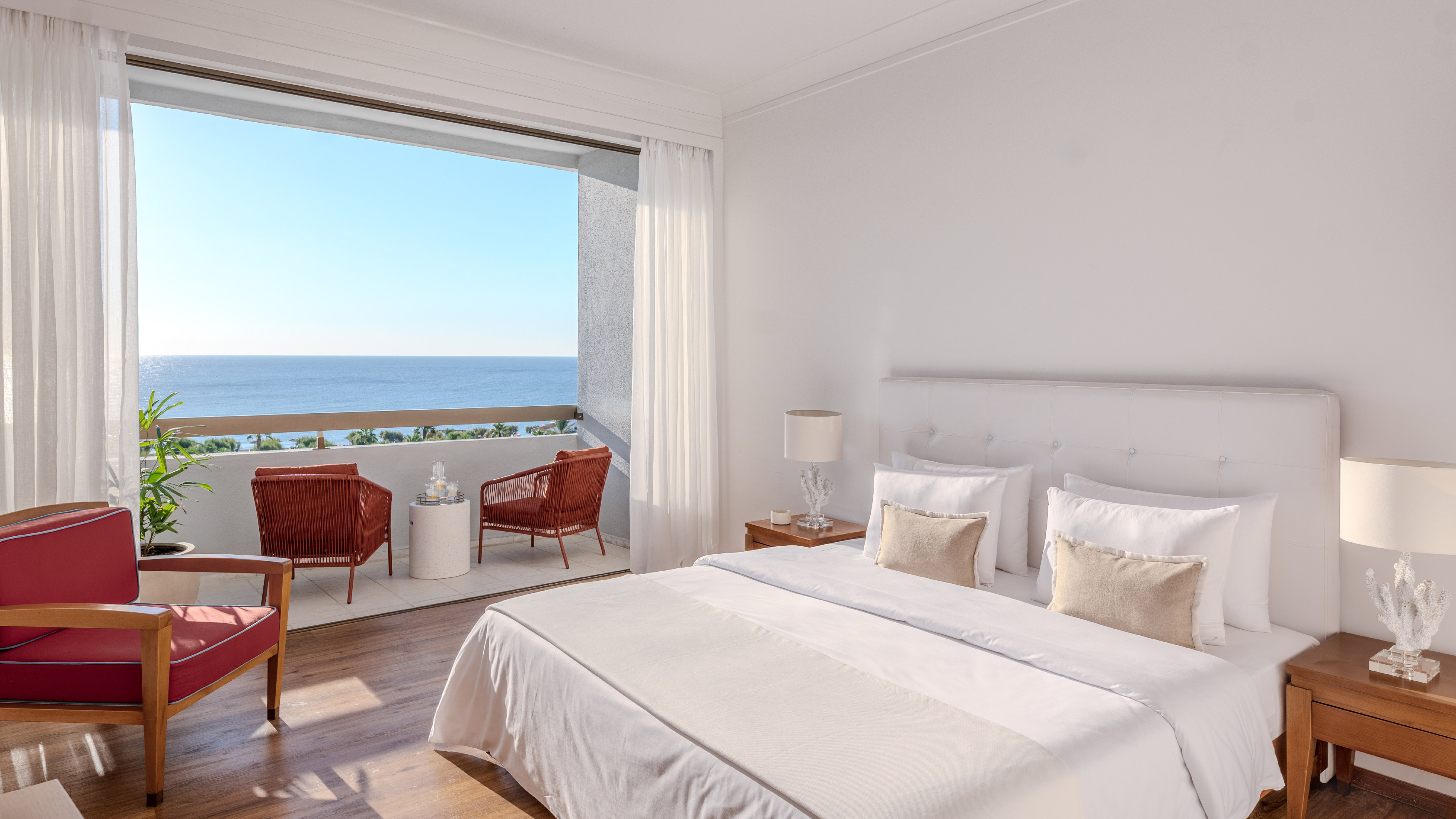 - LAYOUT: Elegantly appointed guestroom with amazing view of the Aegean Sea