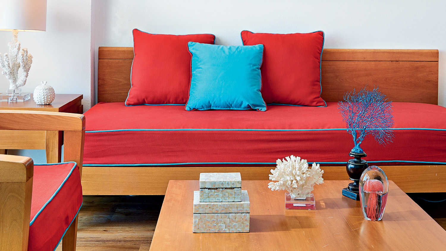 - LAYOUT: Rooms with crimson details and custom designed furniture