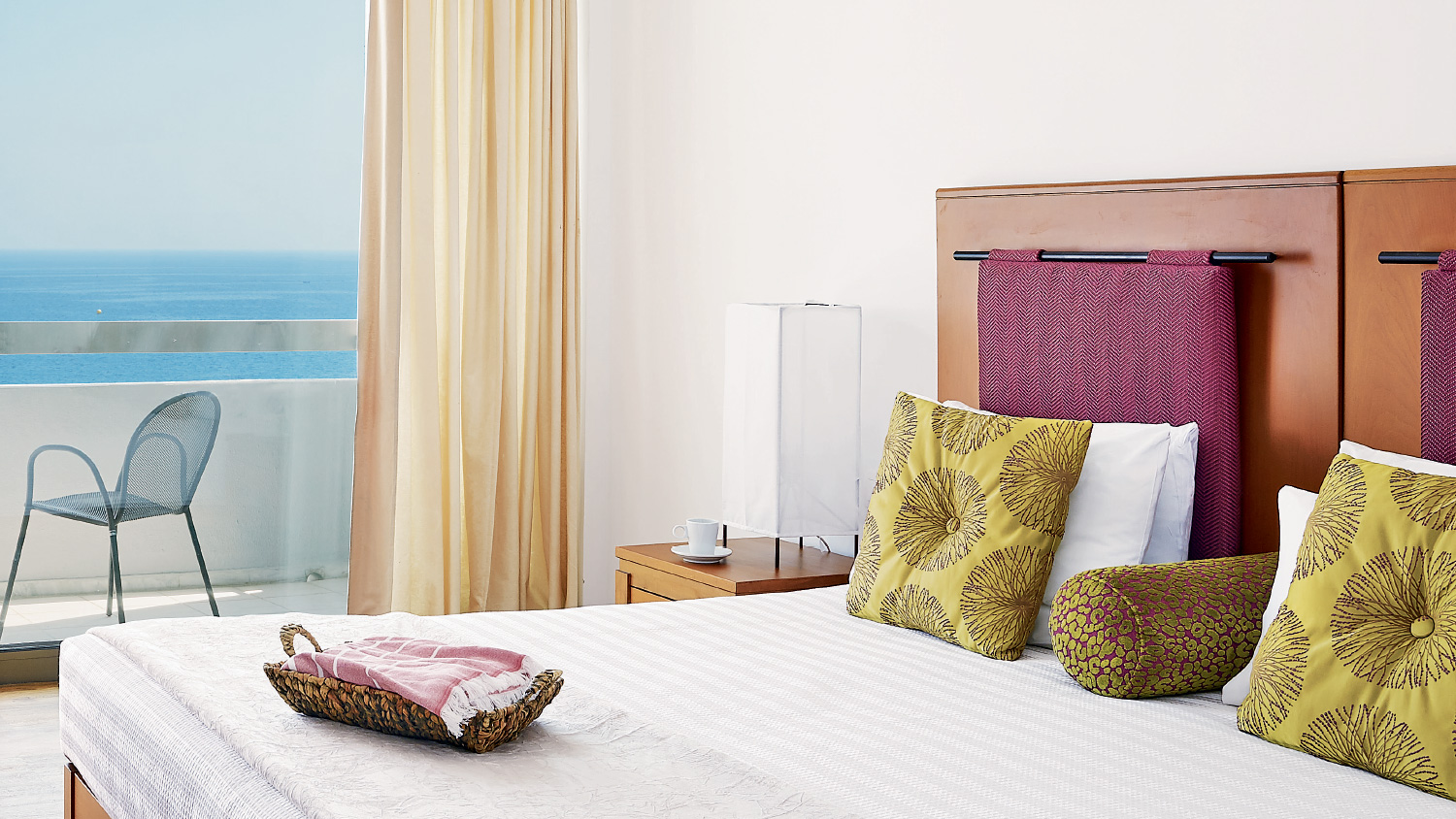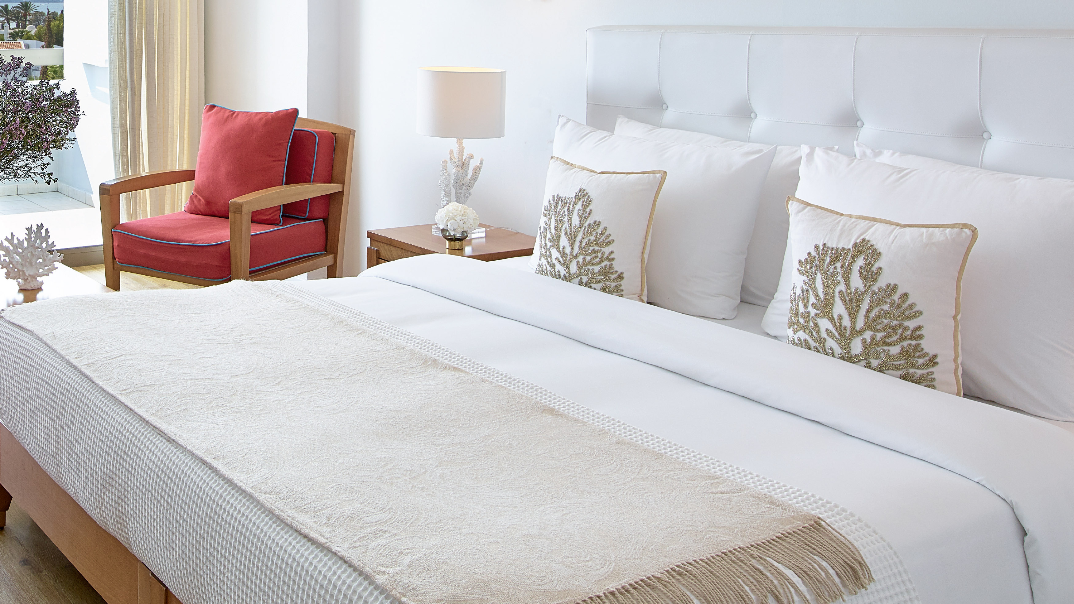 A recently updated guestroom, offering the spectacular view of the Aegean Sea and the resort’s water features, welcomes you to a space of light colors, embroidered with crimson details and custom designed furniture.