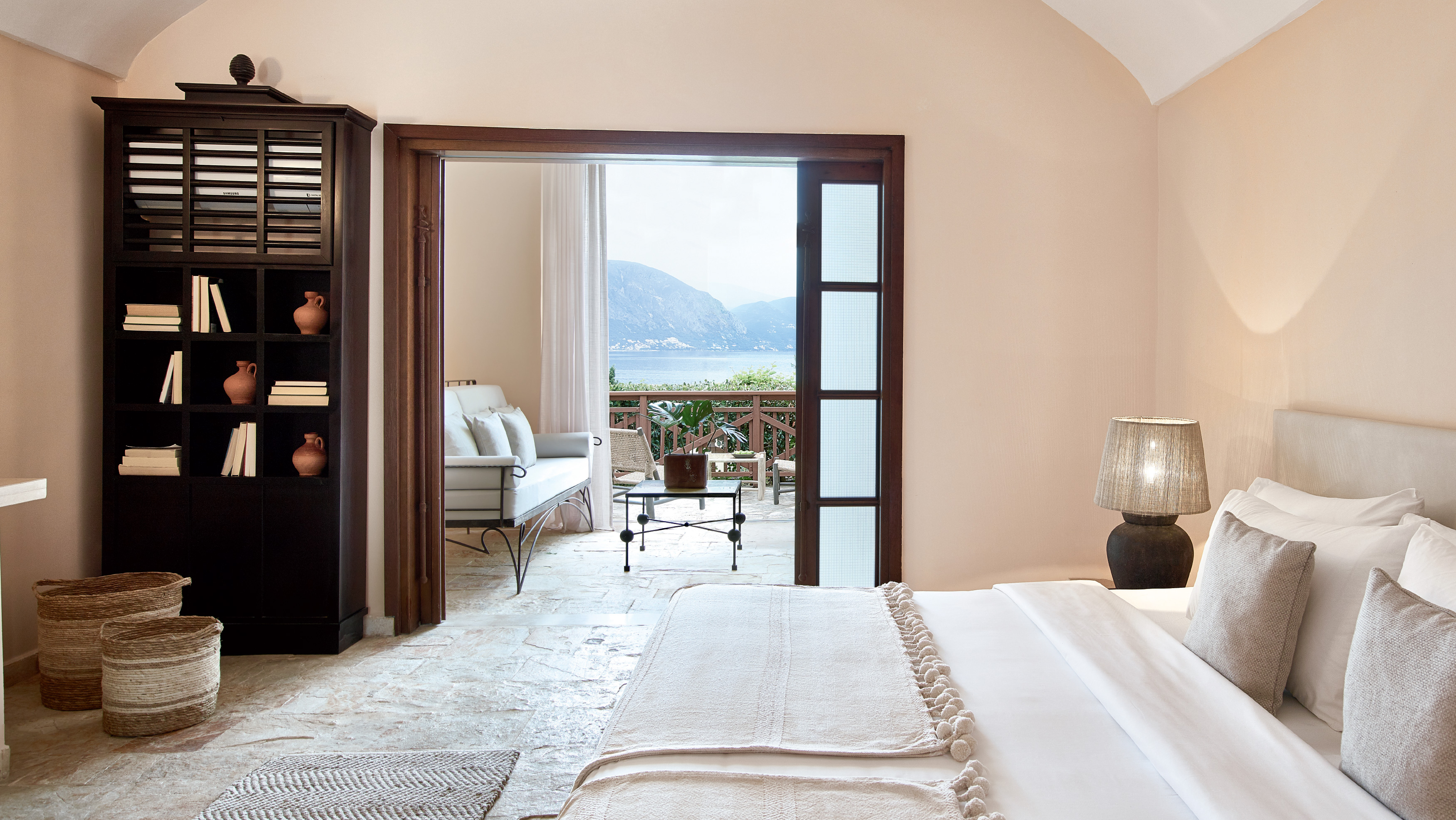 Ideally nestled in privileged elevated locations within the verdant scenery of Corfu’s hillsides, naturally luxurious family accommodations come with a master bedroom featuring a centerpiece of comfort and an adjoining lounge area that doubles as children’s sleeping quarters.