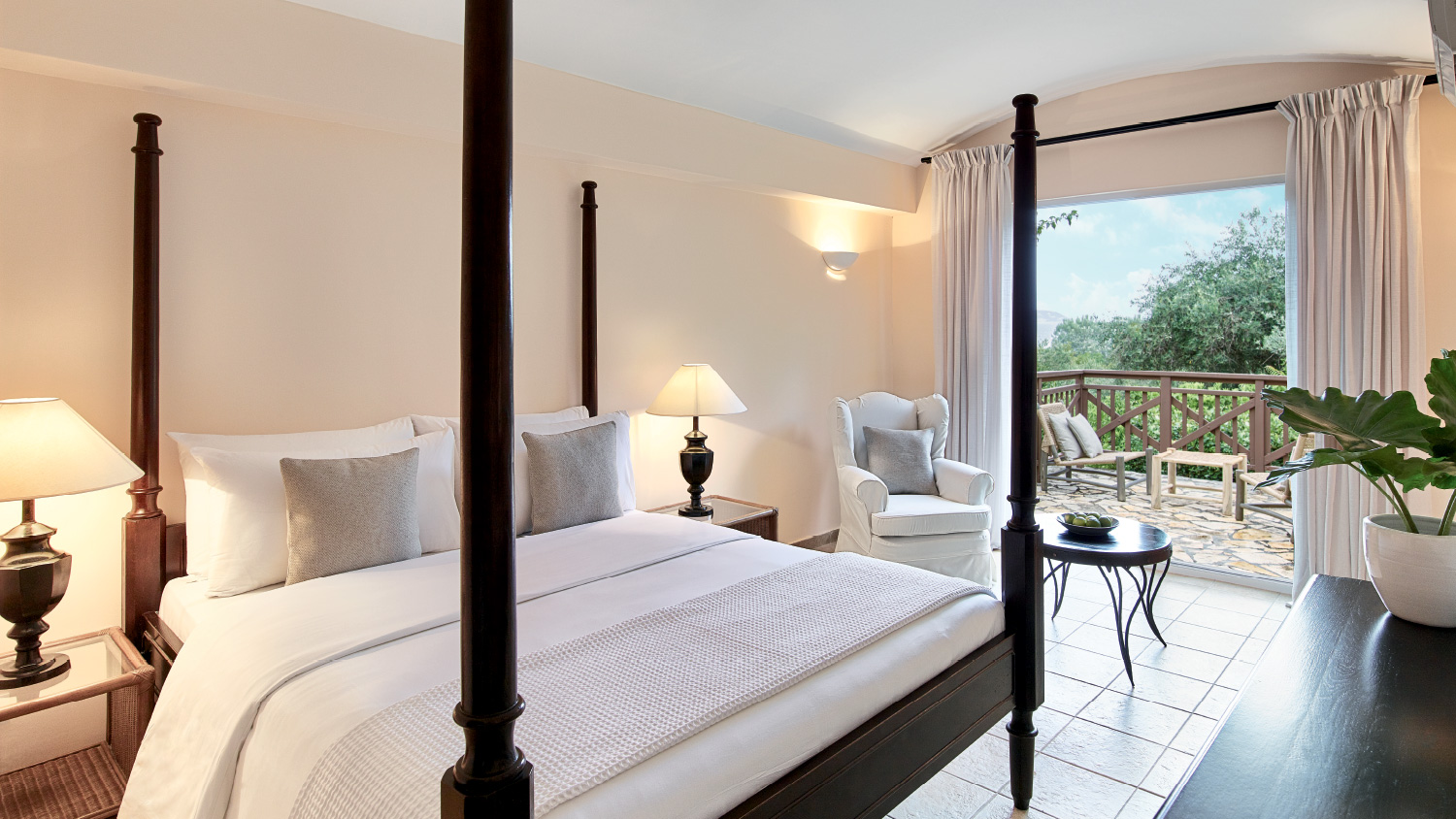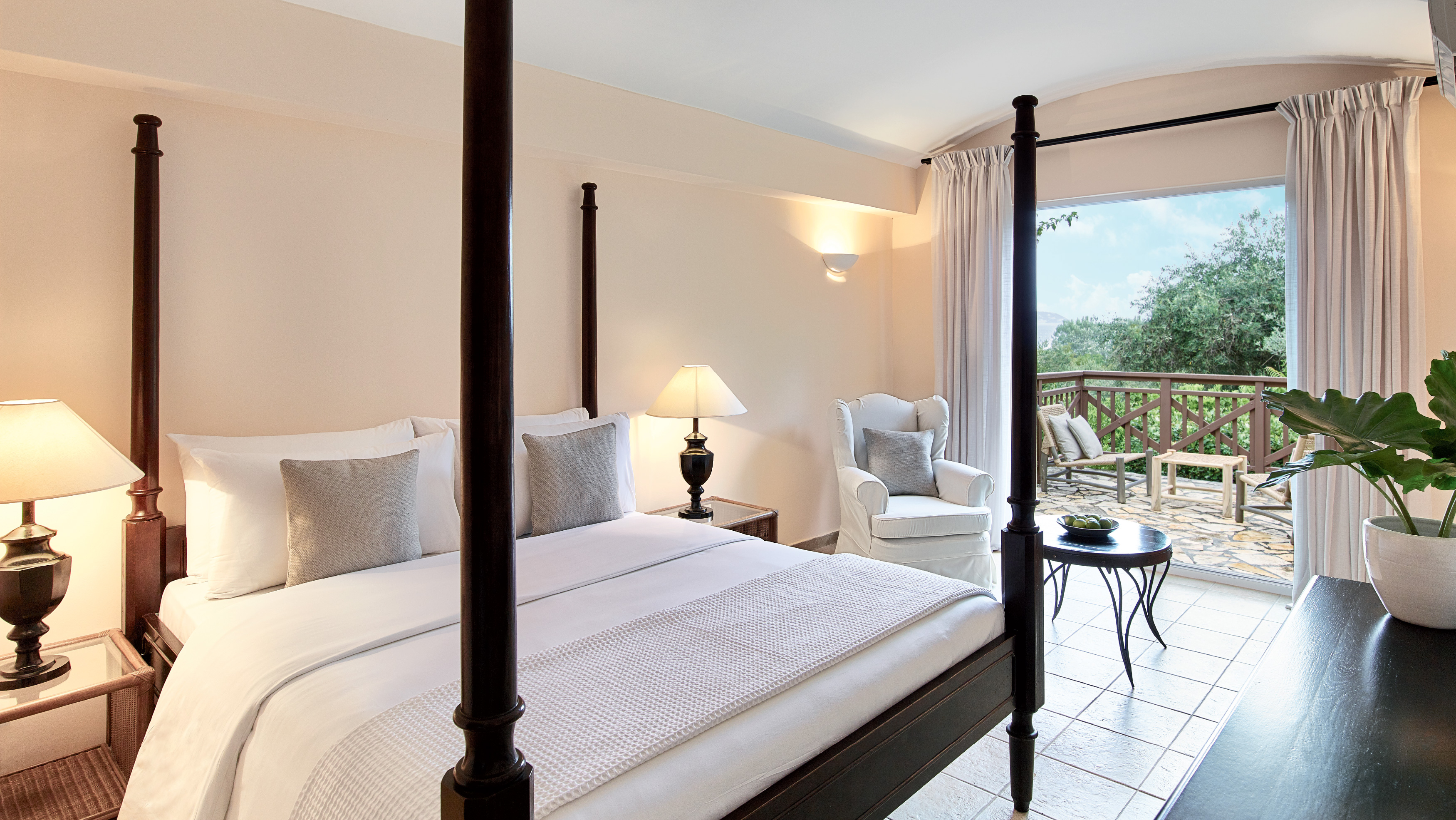 Durchdacht gestaltete, lichtdurchflutete Zimmer, die viel Platz und Komfort für Familien bieten. Sie verfügen über einen Schlafbereich für die Kinder und ein separates Hauptschlafzimmer, das sich zu einem komfortablen Außenbereich mit herrlichem Blick auf die üppigen Gärten und die wunderschöne korfiotische Landschaft öffnet.