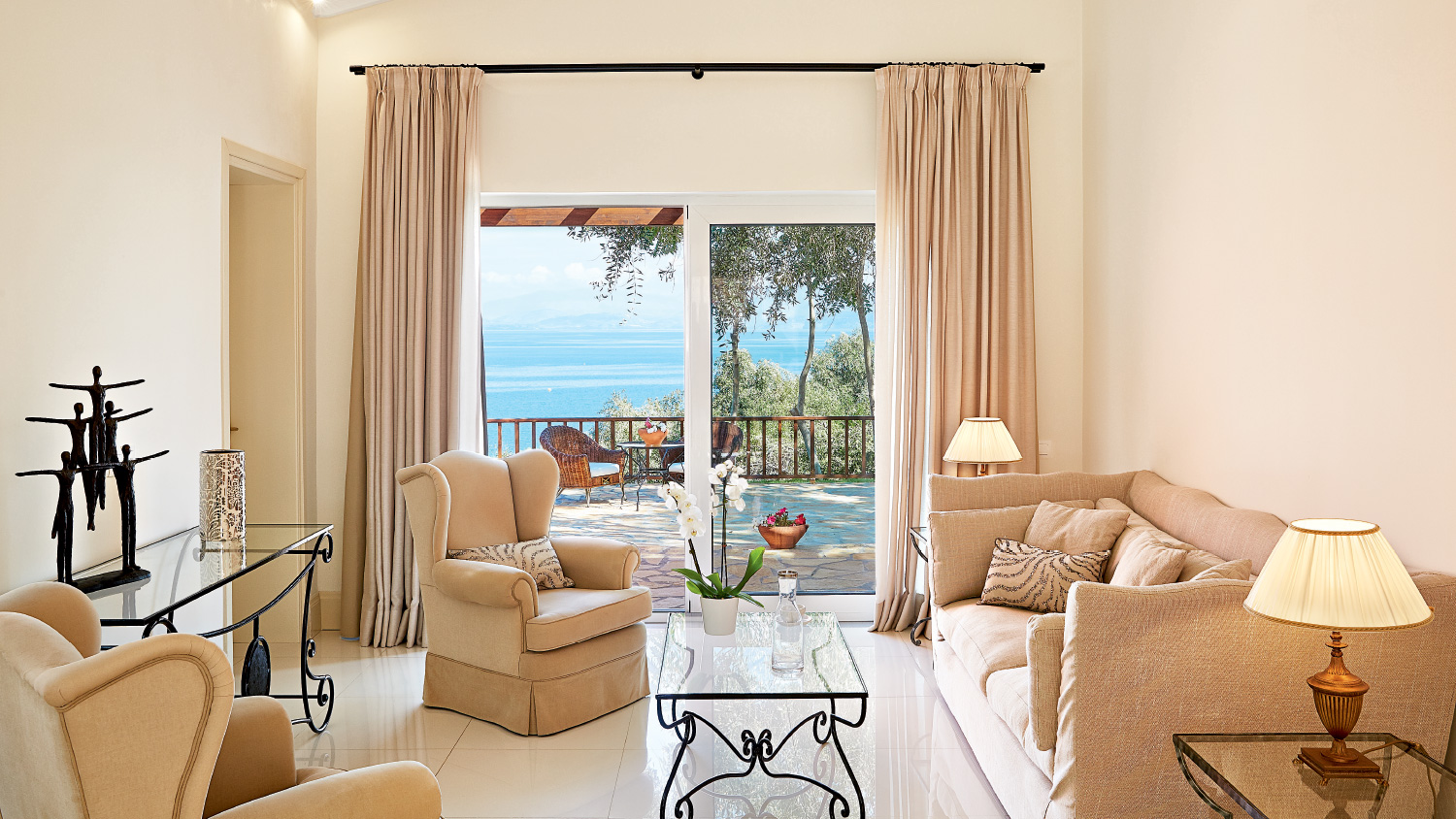 Die helle und luxuriöse Villa ist eine außergewöhnliche Daphnila-Unterkunft mit zusätzlichem Komfort für größere Gruppen oder Familien mit Kindern. Sie verfügt über zwei getrennte Schlafbereiche, zwei private Bäder, einen großen Wohnbereich und eine Küche. Inspiriert von der königlichen Ästhetik der italienischen Architektur auf Korfu, liegt diese elegante korfiotische Villa hoch über dem Meer inmitten der üppigen Gärten auf dem Gelände des Resorts.