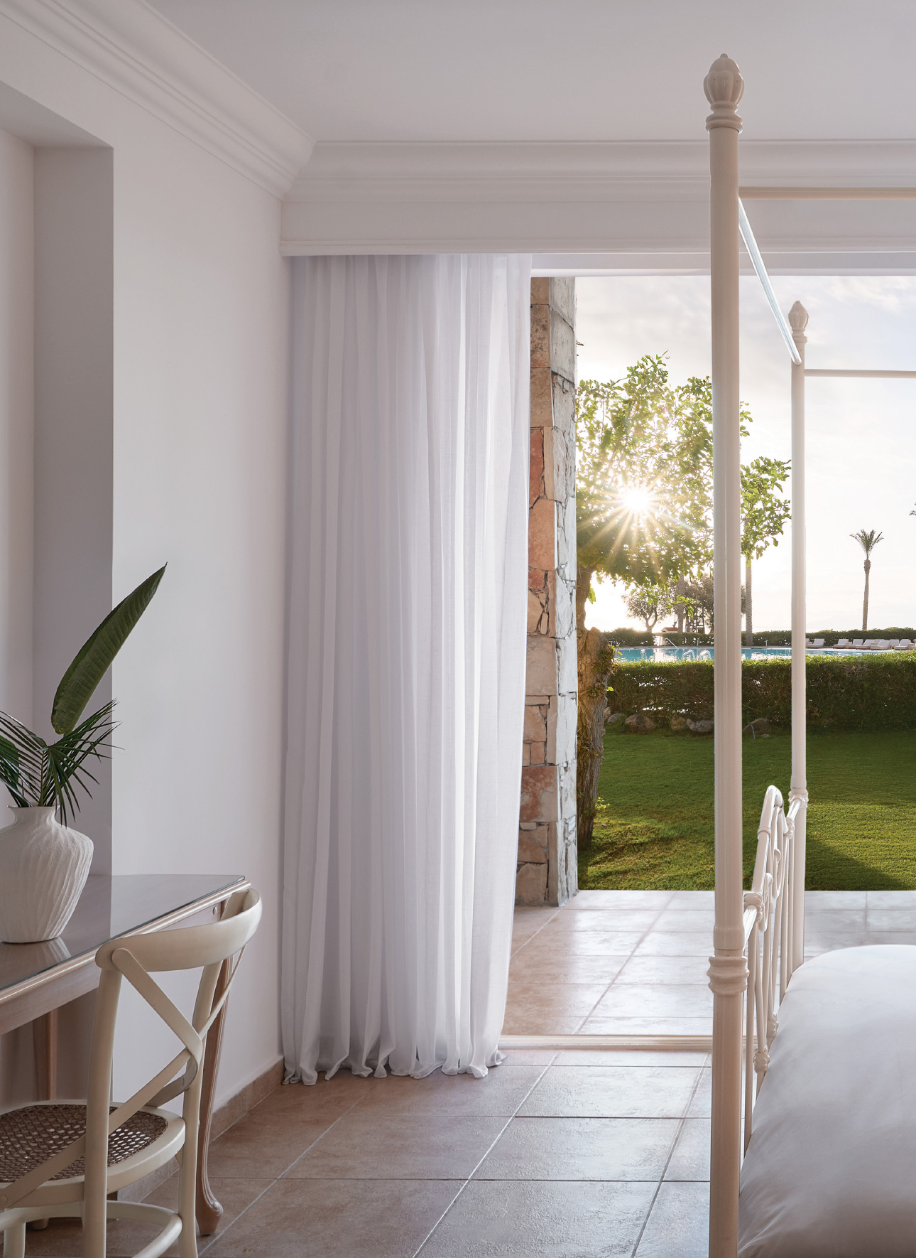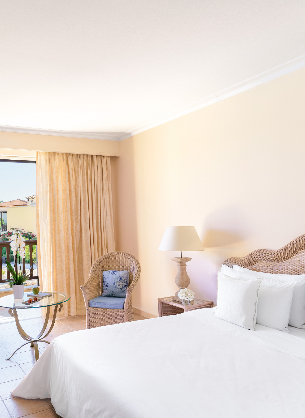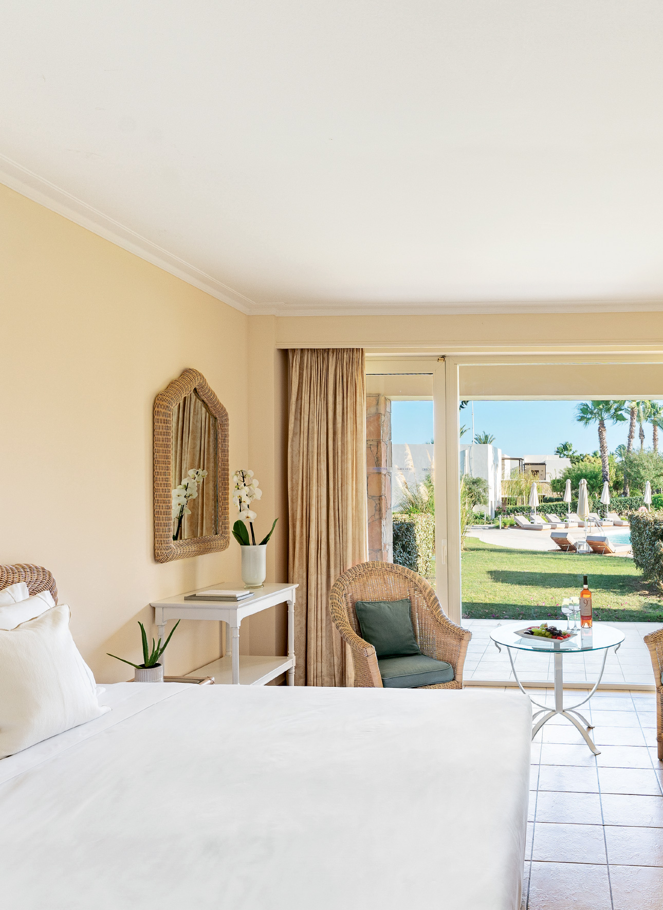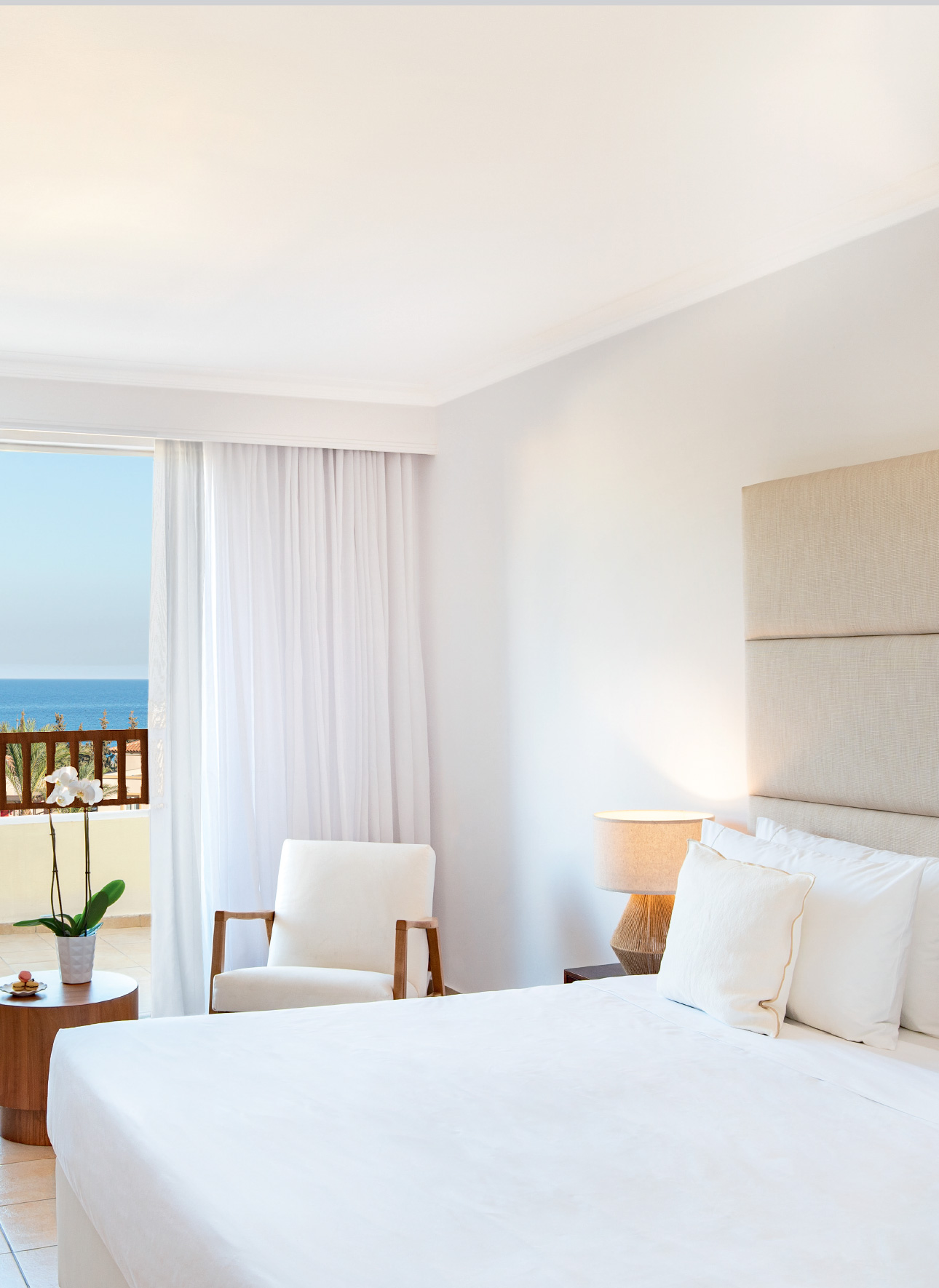 Bright summer hues, airy fabrics, crisp whites, raffia, and bamboo bring a fresh, restyled touch to the elegant guestrooms. Spacious verandas open to sweeping views of the sea and the lush palmerai, offering a serene escape filled with coastal charm.