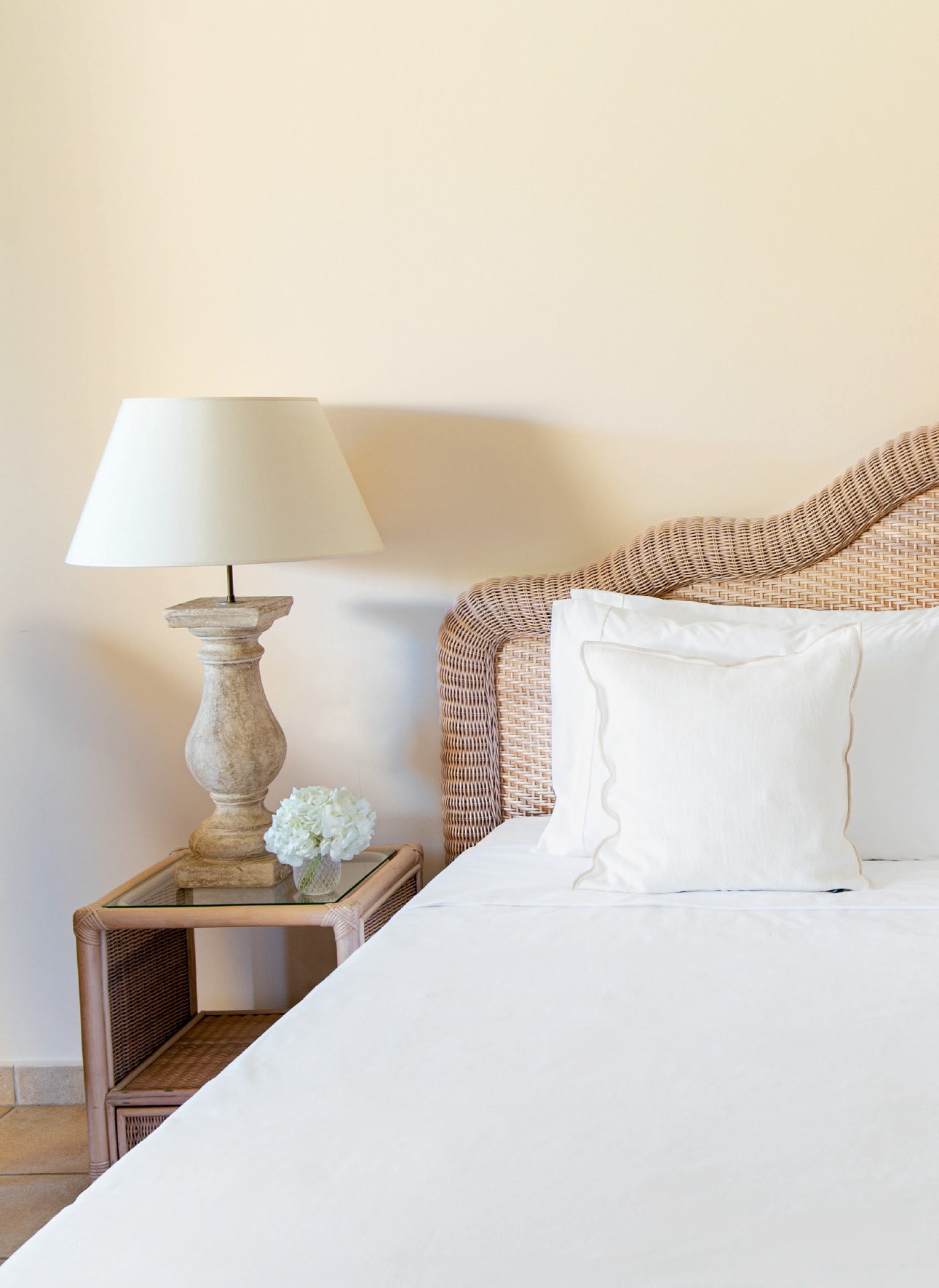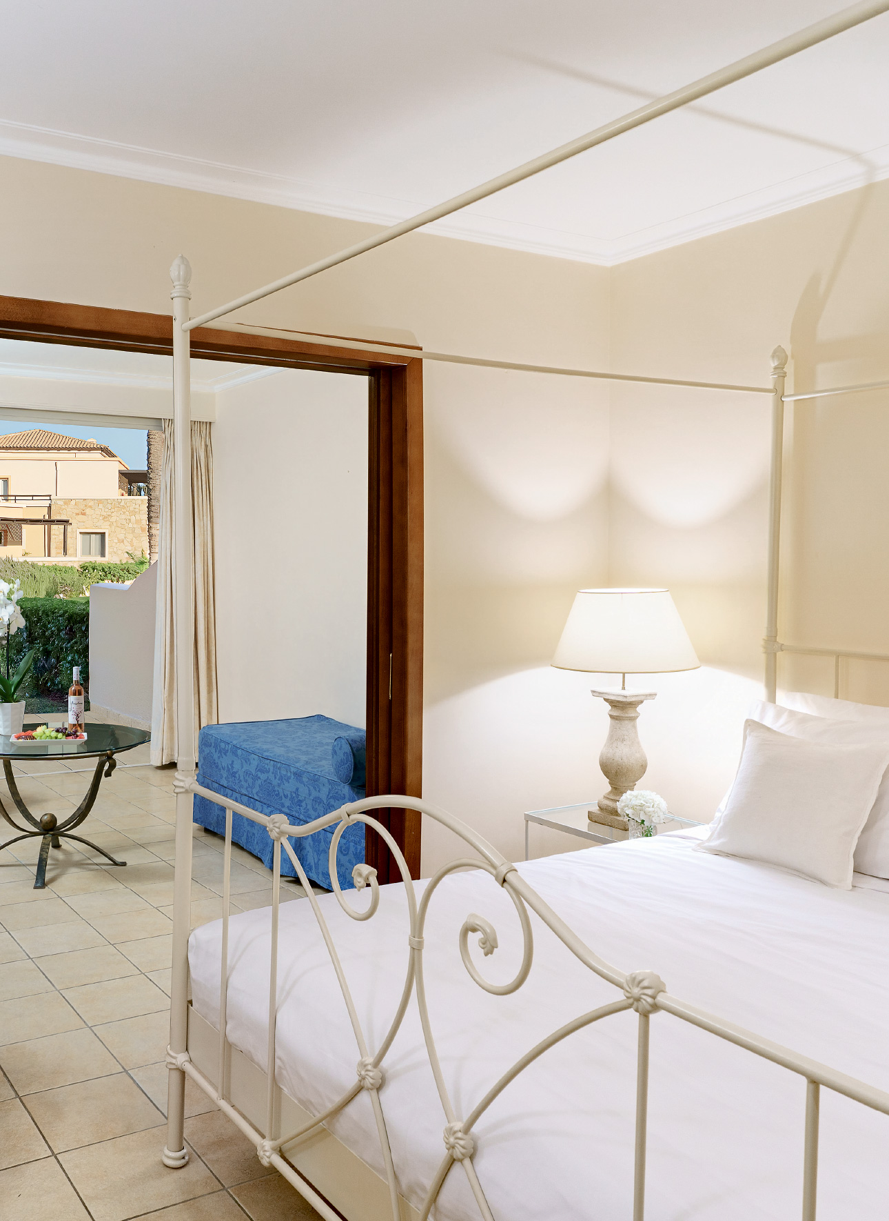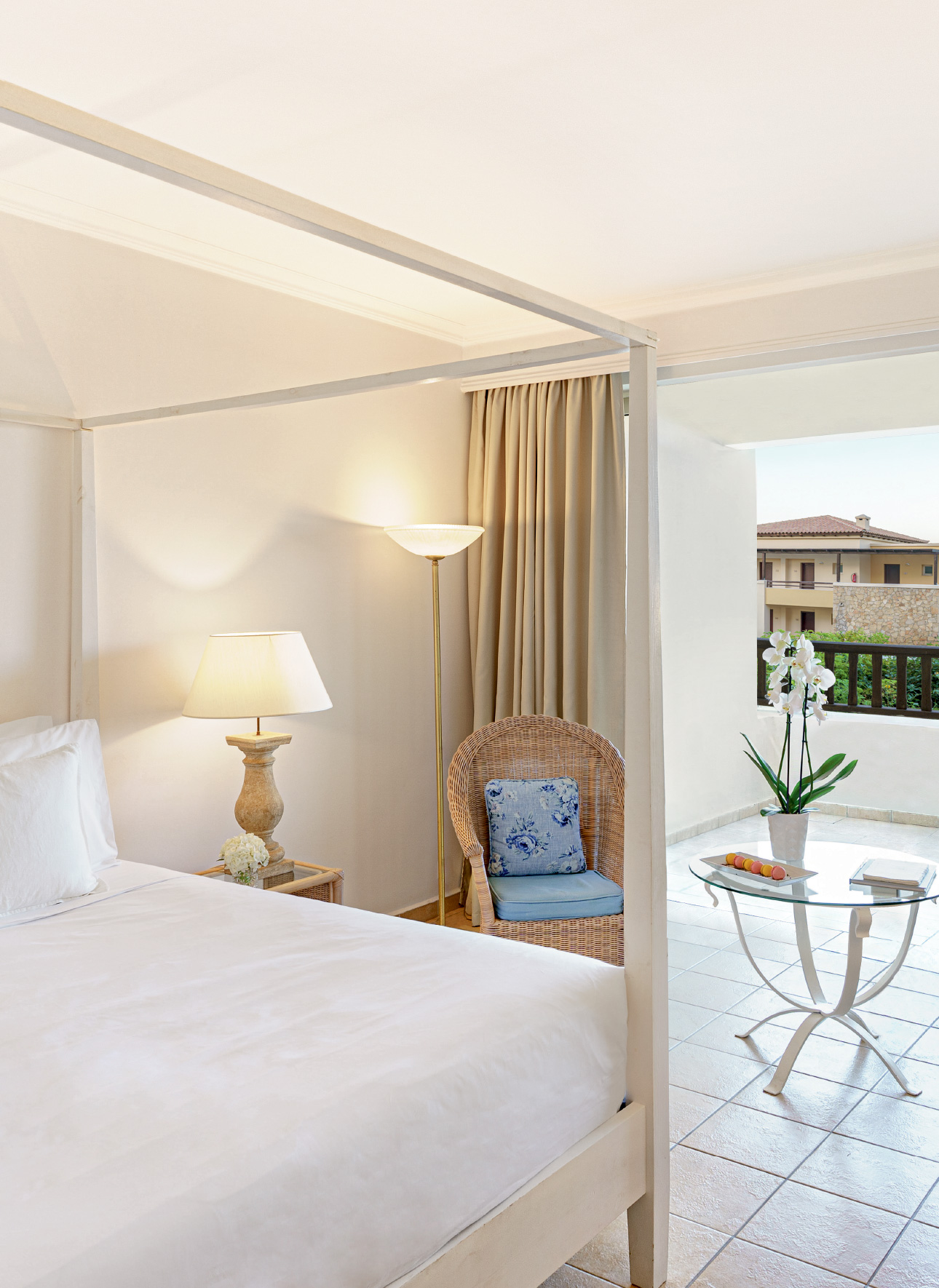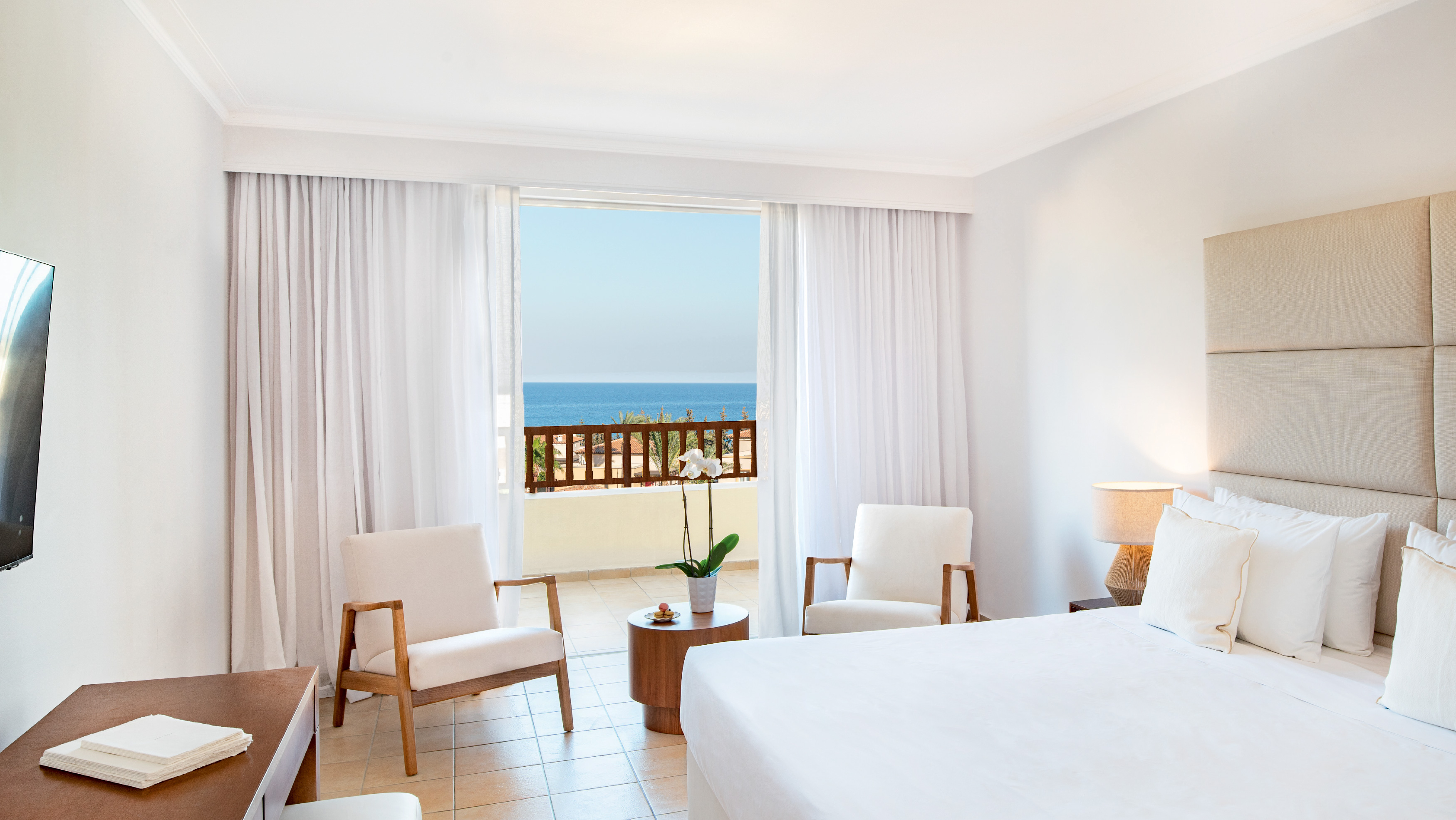 Bright summer hues, airy fabrics, crisp whites, raffia, and bamboo bring a fresh, restyled touch to the elegant guestrooms. Spacious verandas open to sweeping views of the sea and the lush palmerai, offering a serene escape filled with coastal charm.